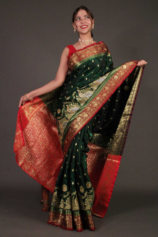 Green Dual tone Kanchi Semi Silk Saree with Leaf Buttas and Zari Border Pre stitch saree