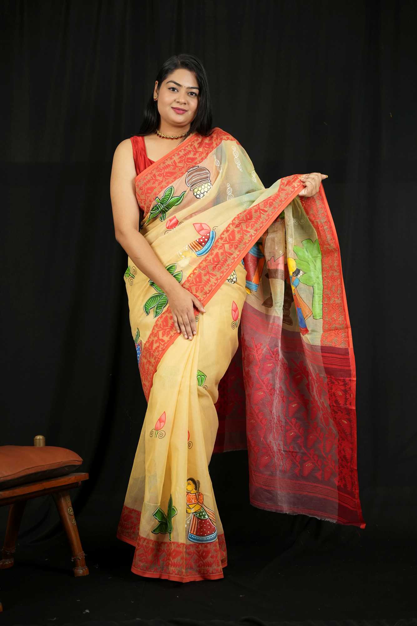 Pure Hand Painted Ganesh Chaturthi Special - Prestitched Saree in Dhakai Jamdani Soft Weave