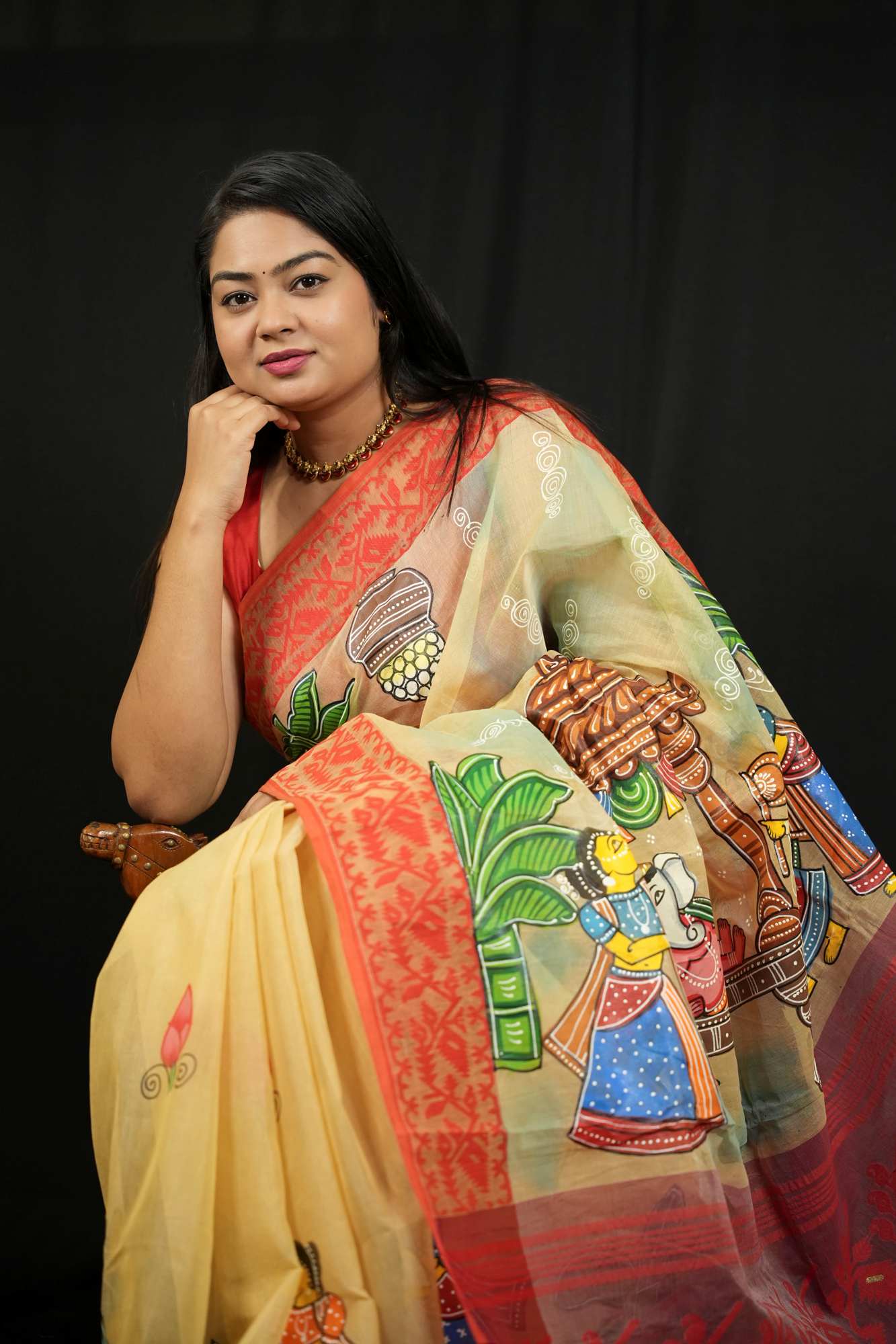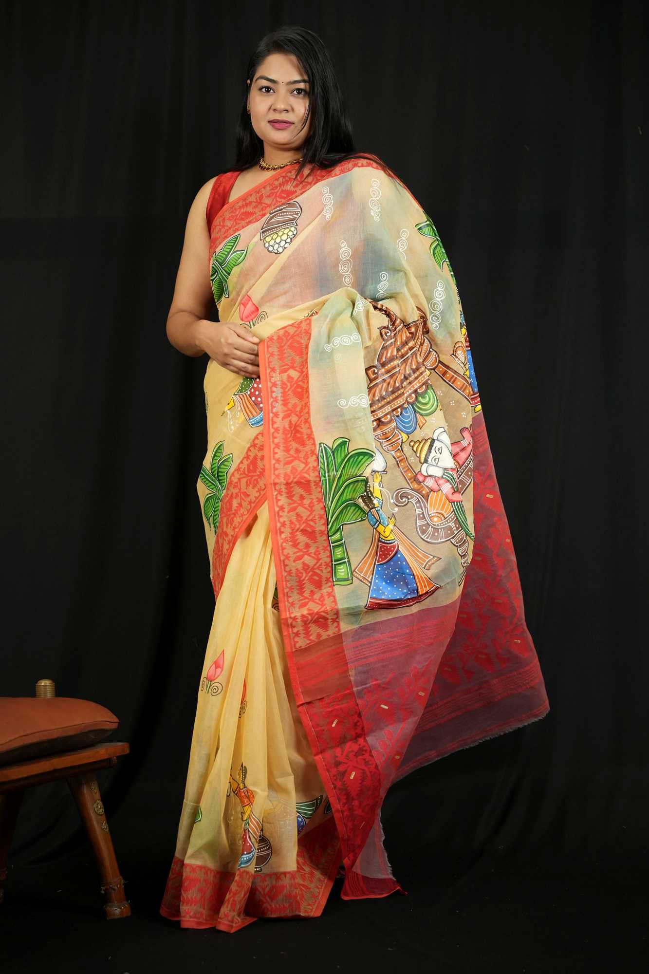 This exquisite Ready To Wear saree is a masterpiece of tradition and artistry, crafted from quality Maslight cotton handloom Dhakai Jamdani. The highlight is the vibrant hand-painted Pattachitra artwork, depicting Lord Ganesh in a royal repose, surrounded by attendants in a beautifully detailed scene.The saree features a soft beige base that enhances the intricate multi colored motifs, while the striking red woven Jamdani border adds richness and contrast. Tiny hand-painted floral accents and traditional elements across the body elevate its charm.Perfect for festive occasions, cultural events, or as a collector’s piece, this saree celebrates the elegance of Indian handloom heritage blended with timeless Pattachitra art