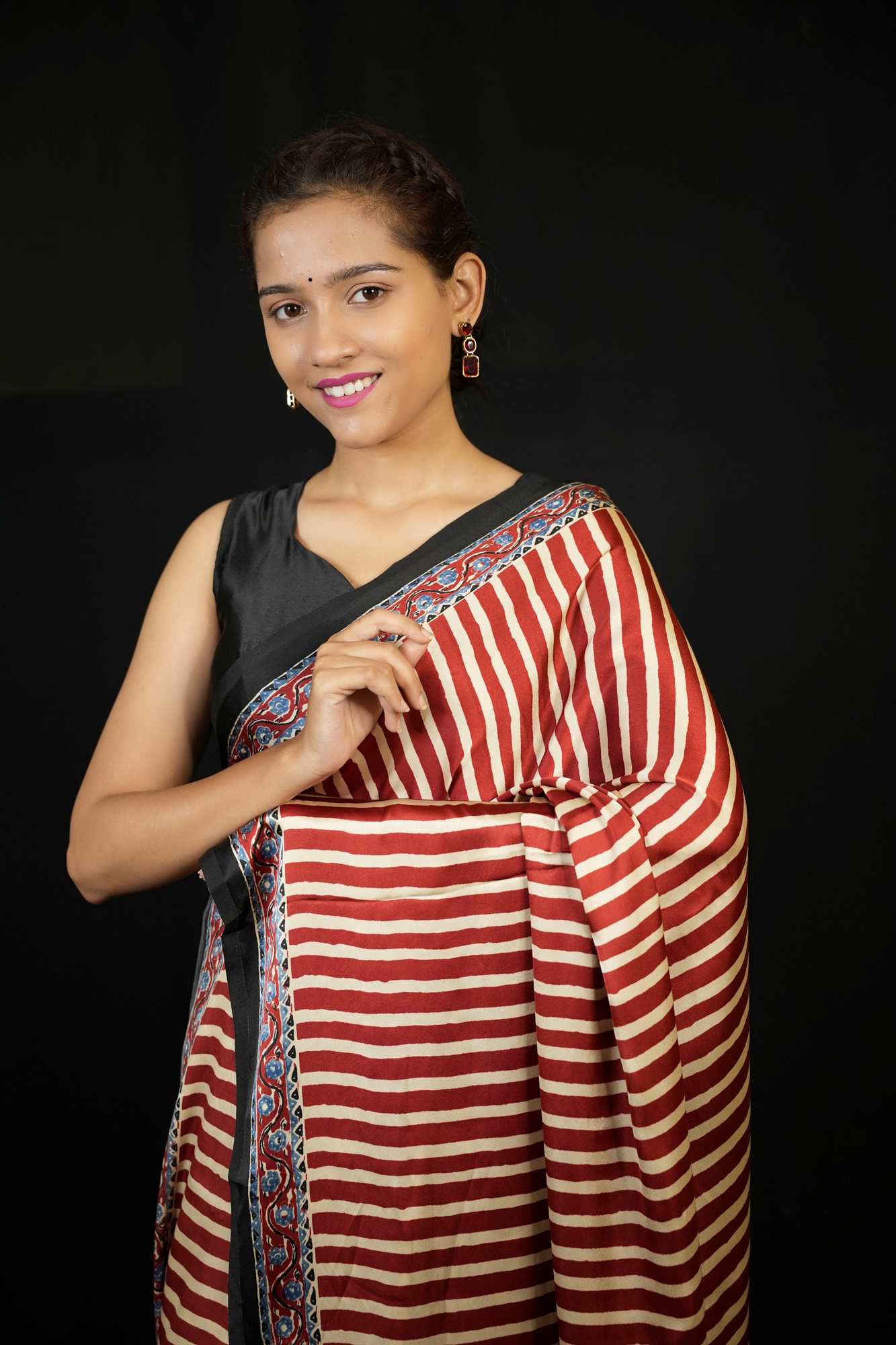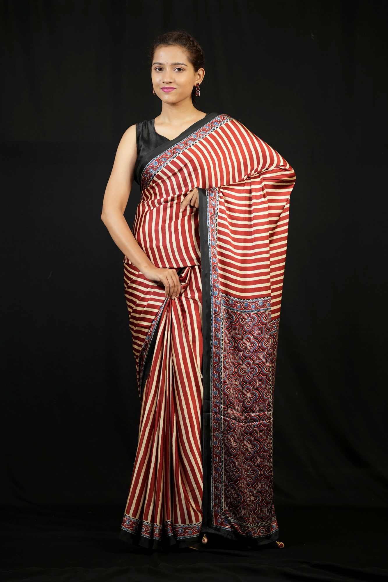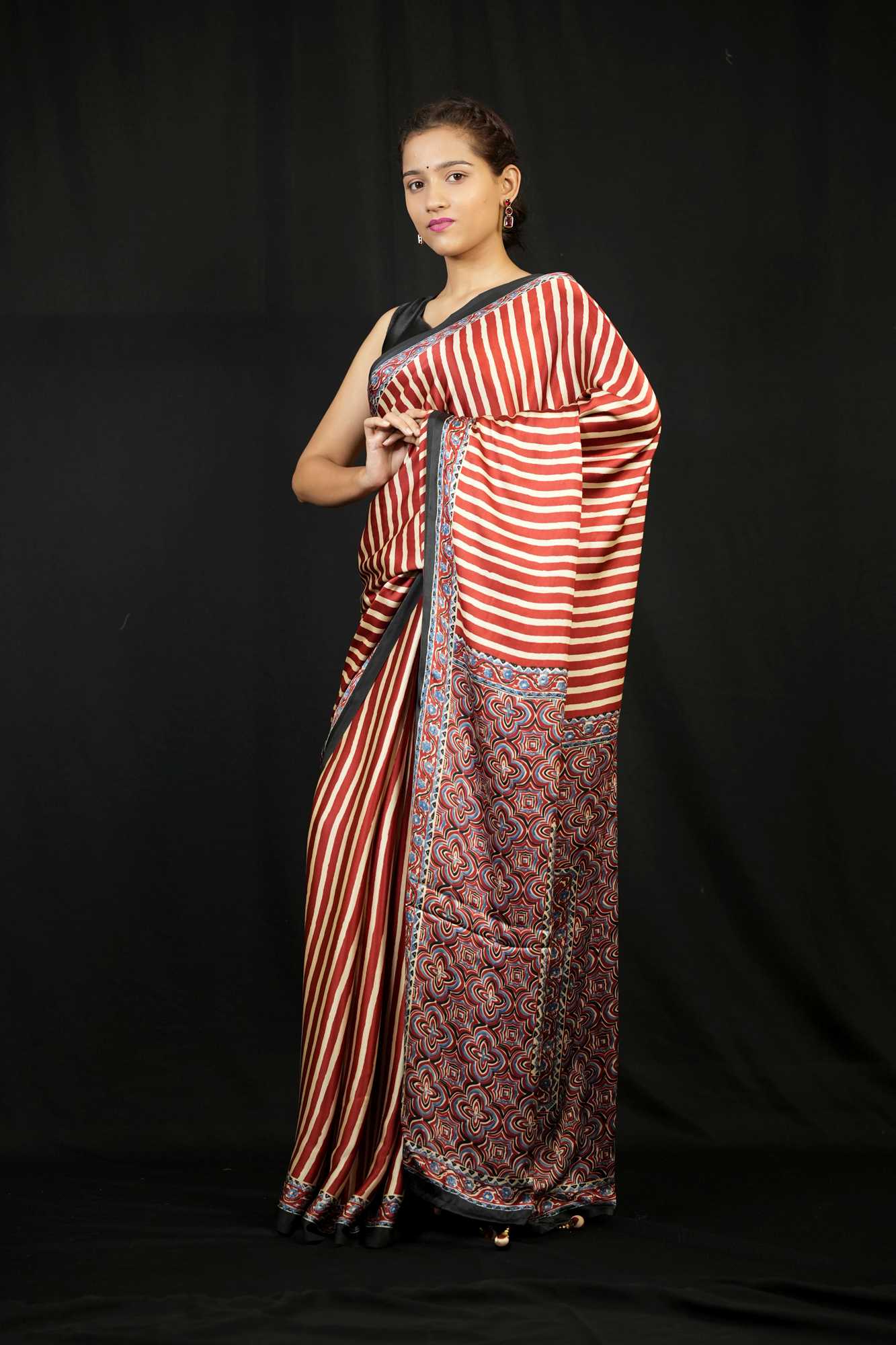Saree Border / Pattern -Maroon & Red Striped with Ajrakh-Inspired Block Print Pallu