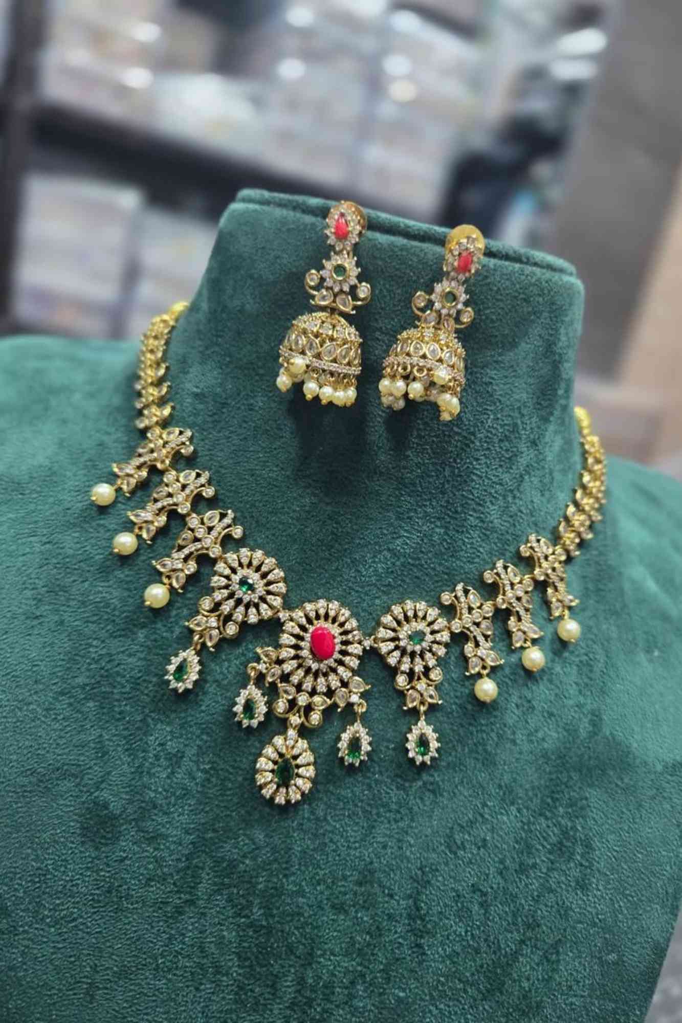 A classic expression of traditional elegance, this antique-finish necklace set features intricate floral motifs embellished with shimmering kundan stones and accented with green and red highlights. The design is enriched with pearl danglings that add movement and grace to the piece. Paired with ornate jhumka earrings adorned with matching kundan and pearl details, this set is ideal for weddings, festive celebrations, or ethnic occasions that call for timeless charm.