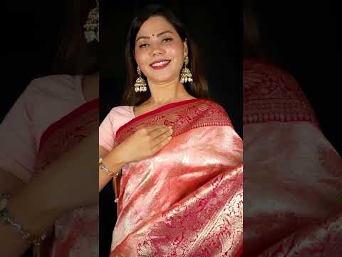 This Banarasi-inspired silk Ready To Wear saree exudes timeless elegance. The body features delicate golden zari motifs, while the highlight is its ornate red border and pallu intricately woven with peacock and floral zari patterns. A perfect blend of tradition and sophistication, this saree is ideal for weddings, festive occasions, and grand celebrations