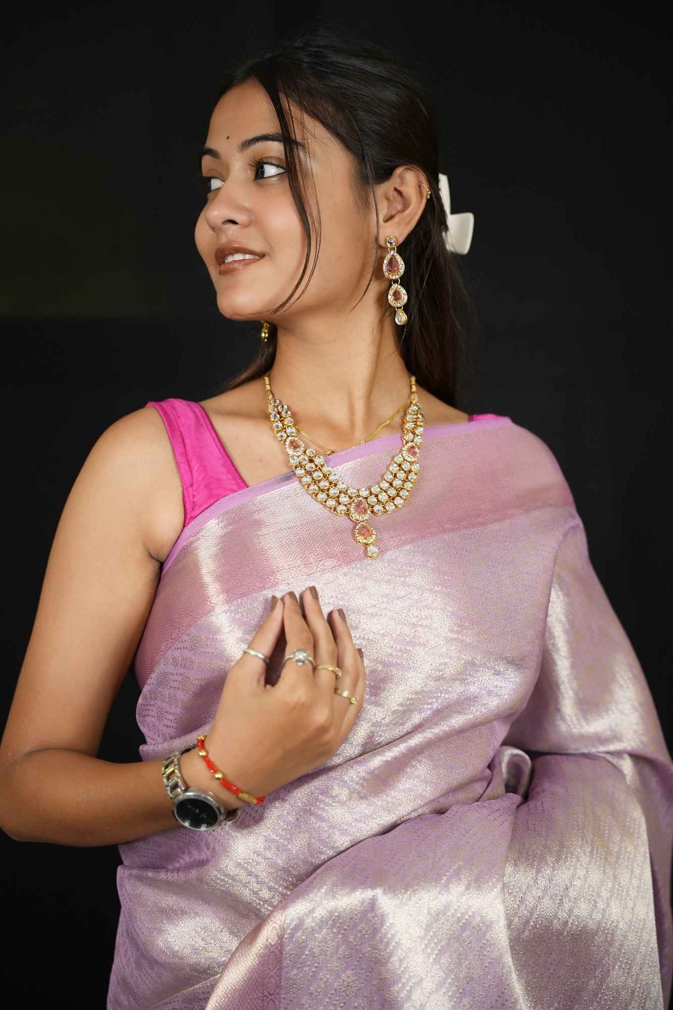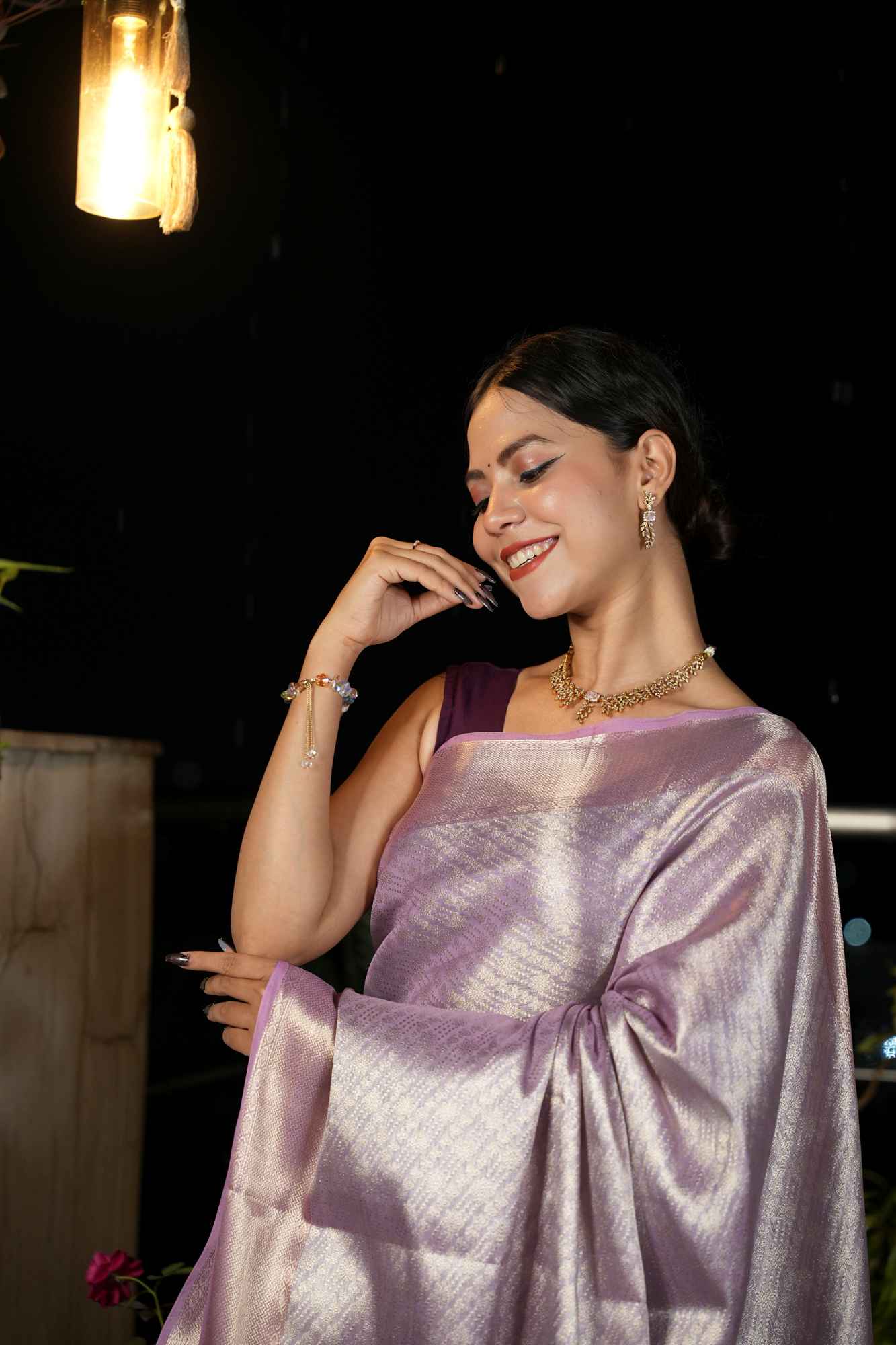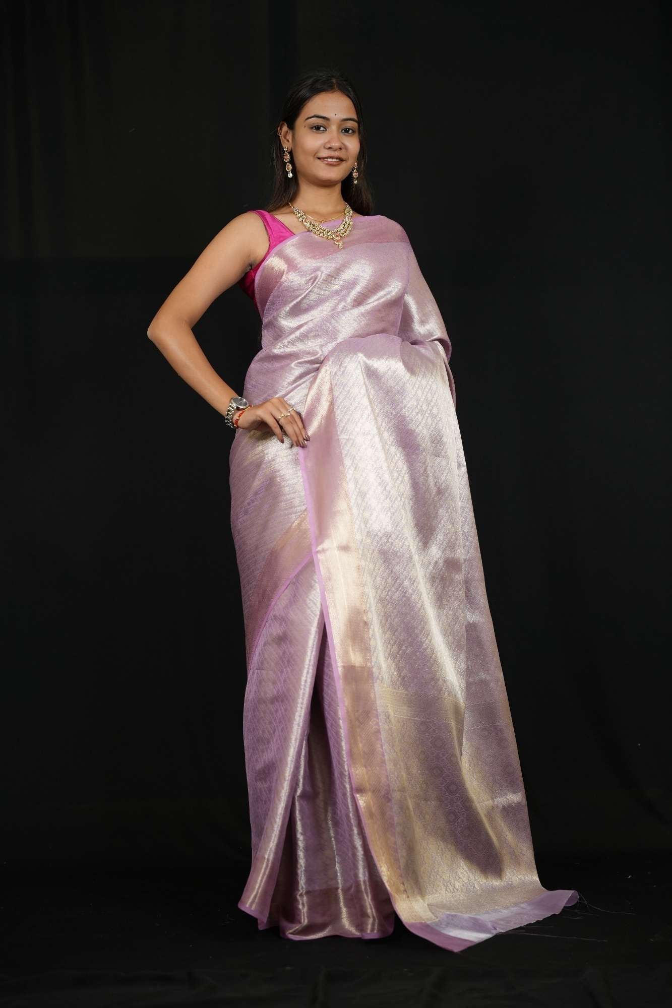 A Banarasi soft tissue silk Ready to wear saree is The woven design on this saree is intricate and mesmerizing, drawing inspiration from traditional art and mythology. The motifs, which can range from mythological figures to floral patterns, are meticulously crafted using gold or silver zari (thread). These motifs have deep cultural significance, often representing divine beings, historical tales, and symbolic elements from Indian folklore. The weaving technique is a true testament to the skill and patience of the artisans, with each design being carefully handwoven to perfection.