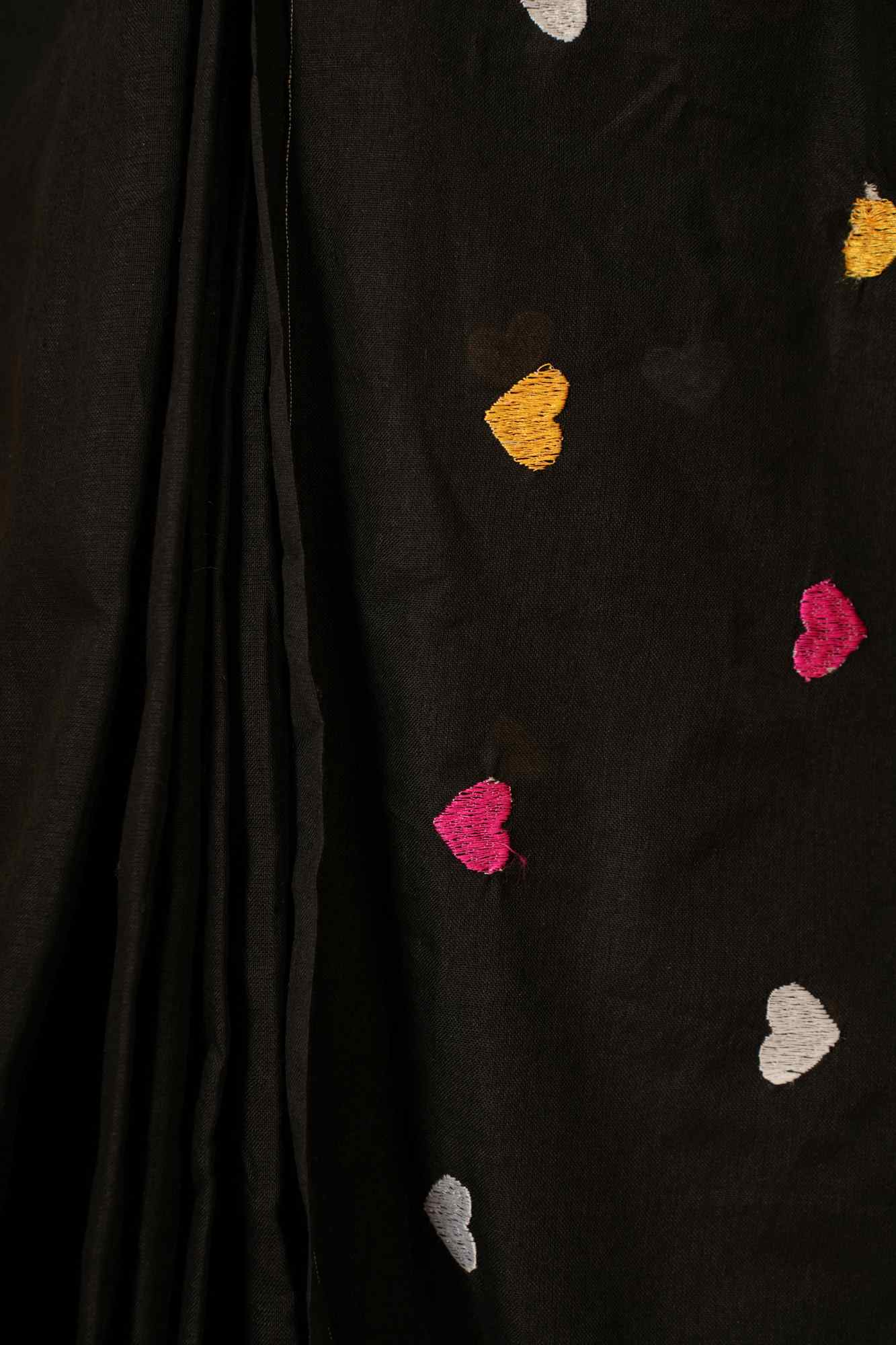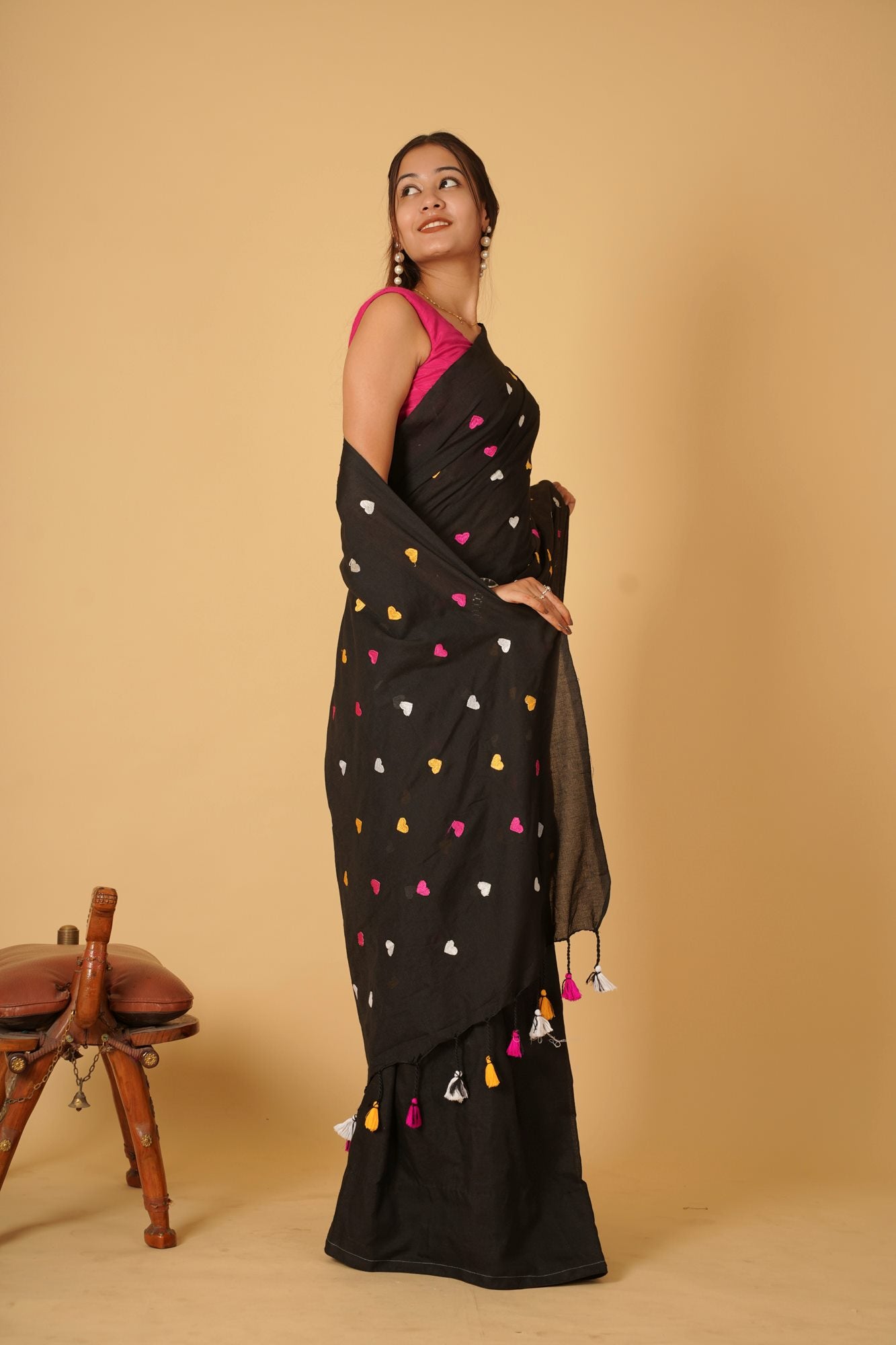 Beautiful Black With Multicolor Heart Embroidered Overall Soft Khadi Cotton & Tassels On Pallu Ready To Wear Saree