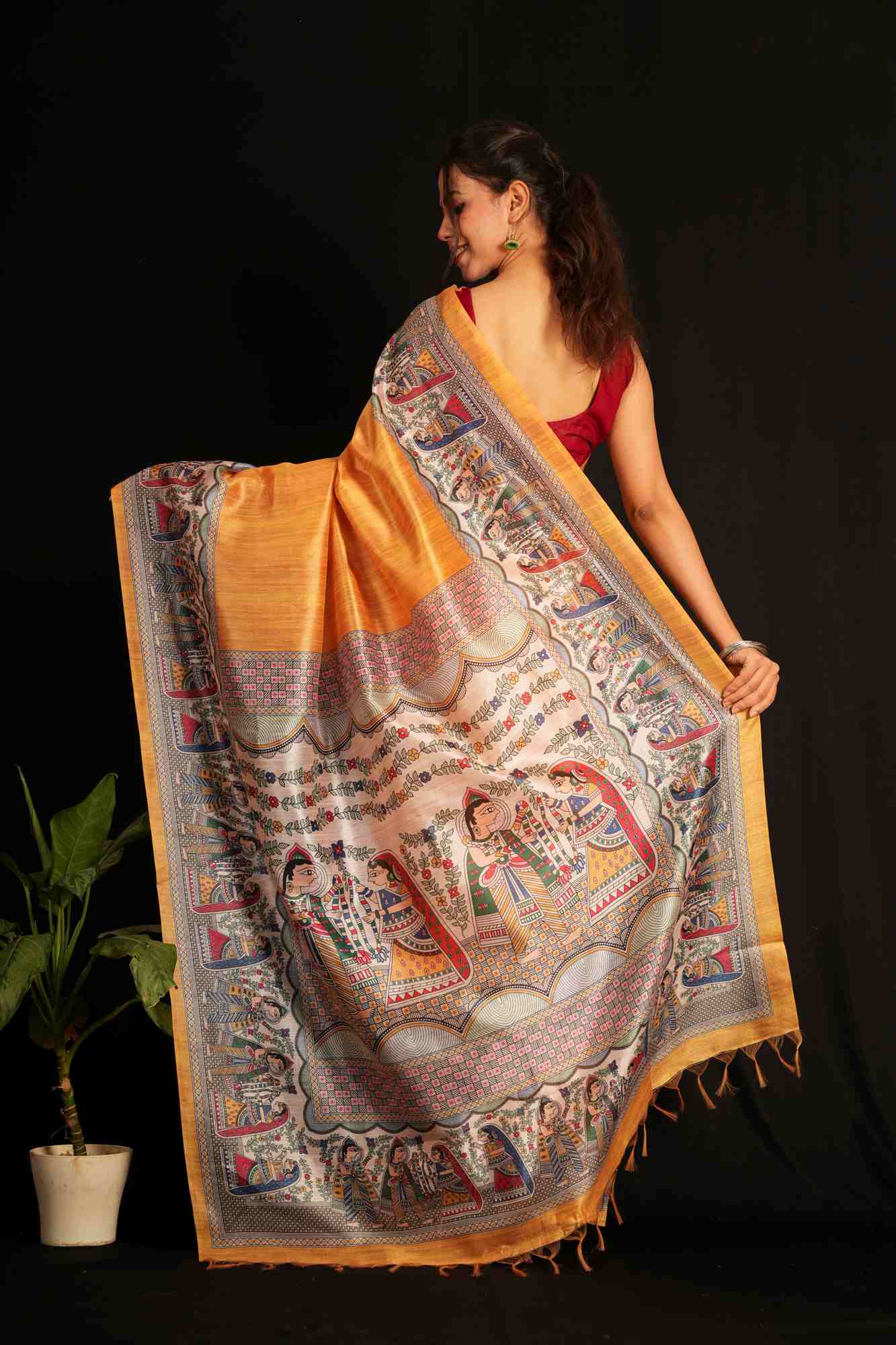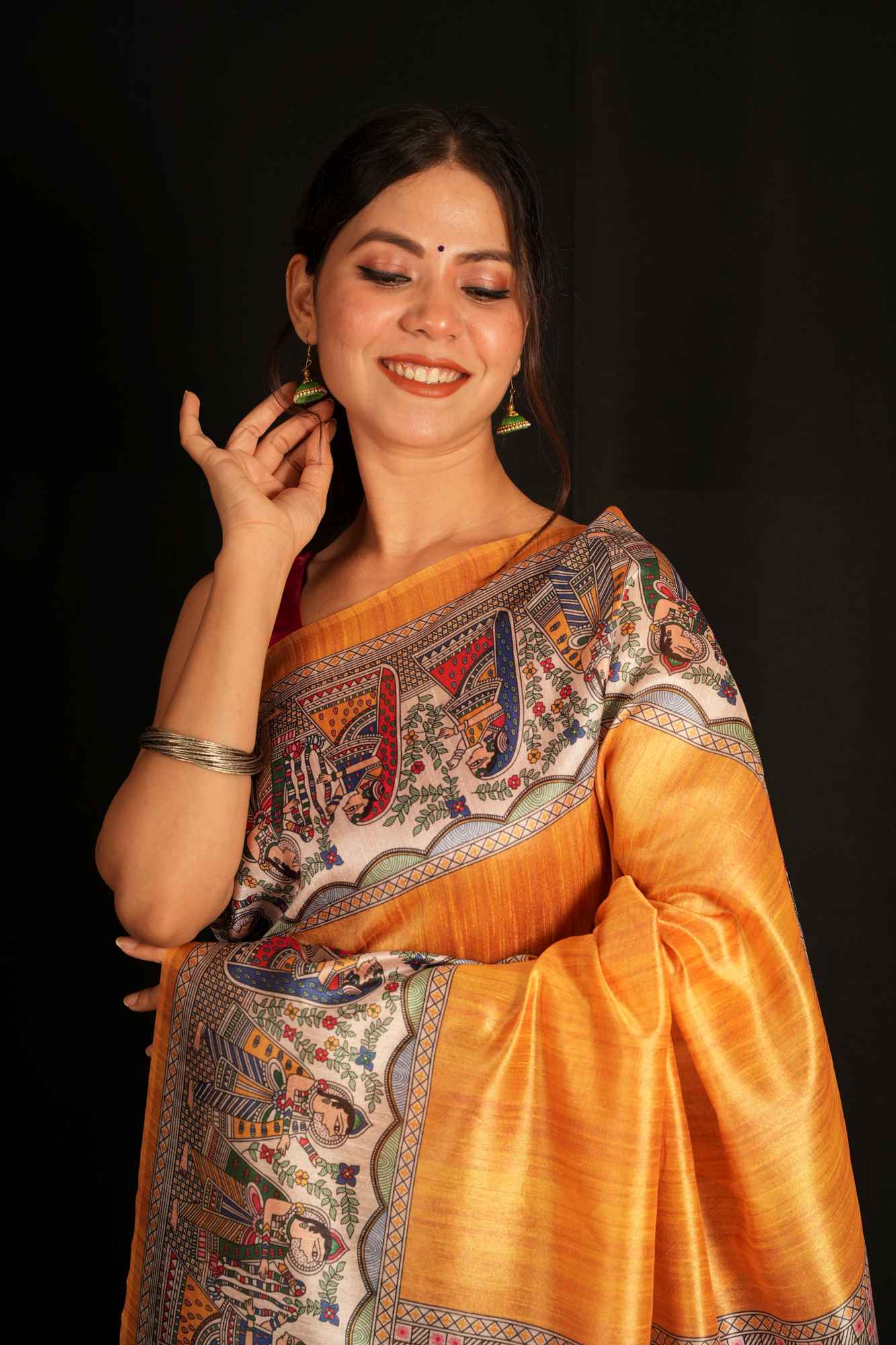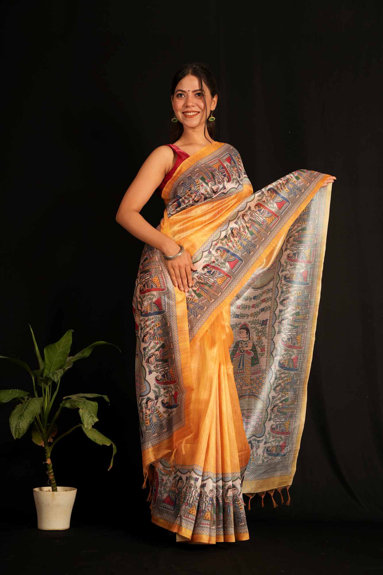 Beautiful Yellow Semi Ghicha Tussar Silk Saree with Madhubani Print Wrap in 1 Minute Saree