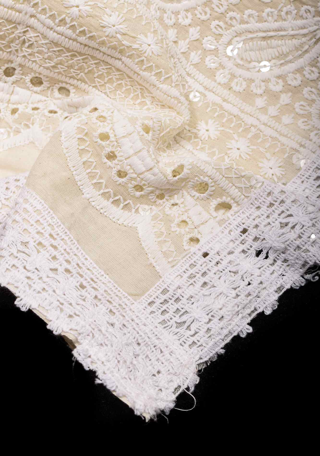 A saree with Victorian charm, it comes in Beige appliqued panels and is decorated with hakoba style embroidery .