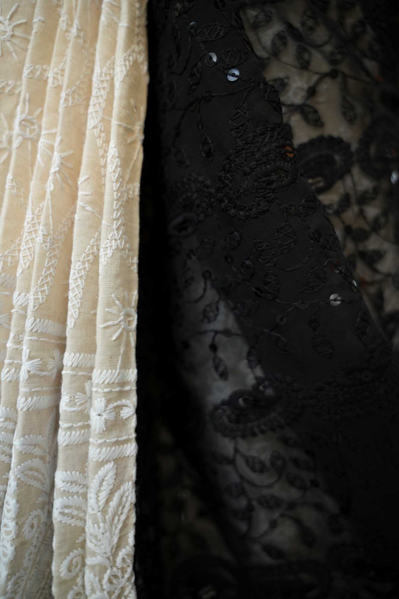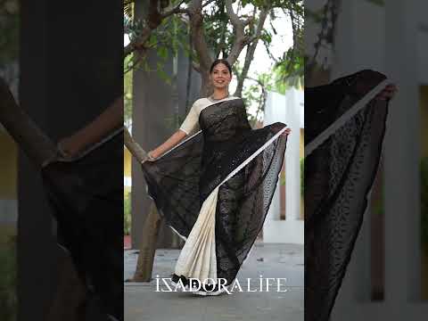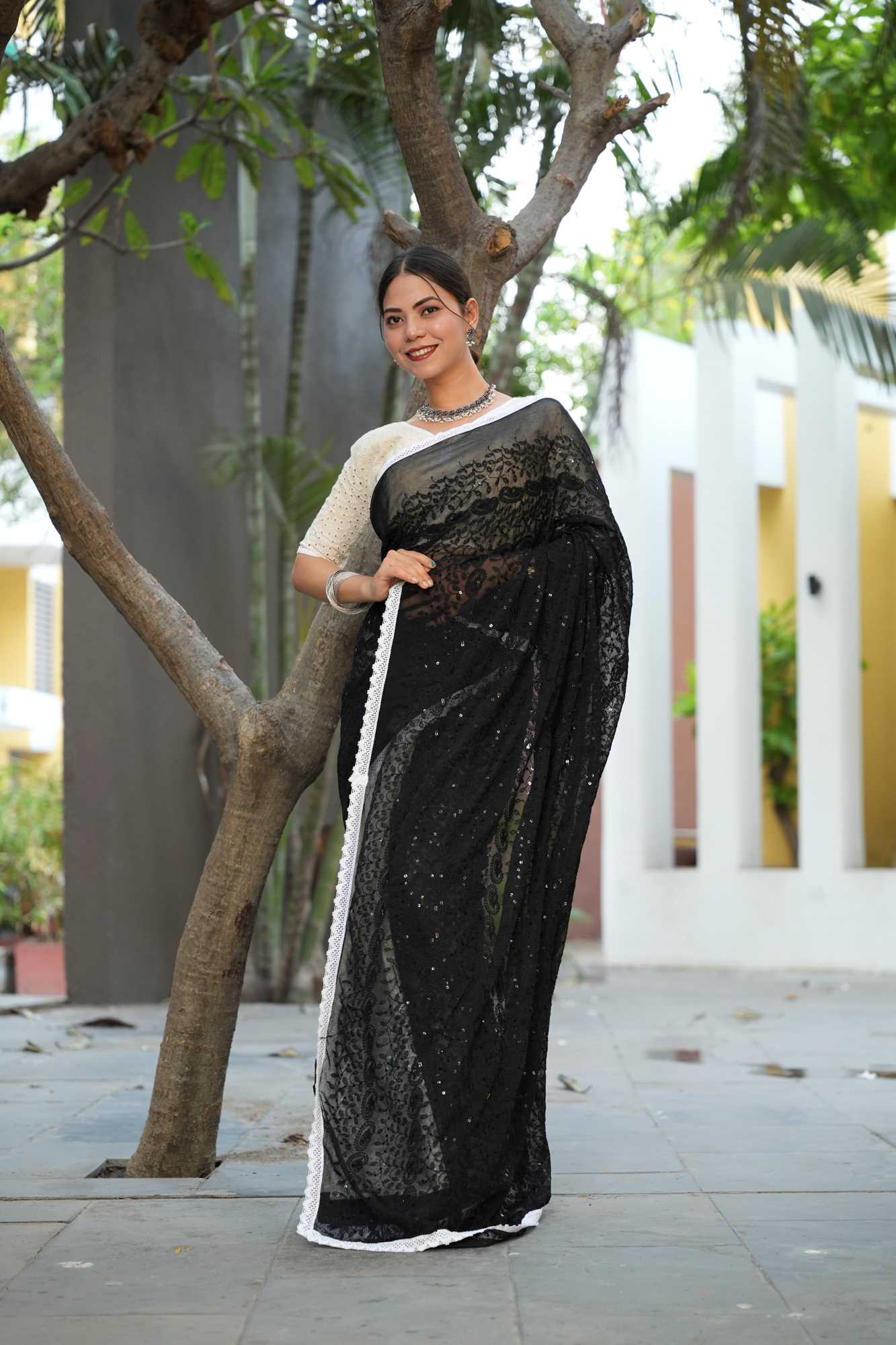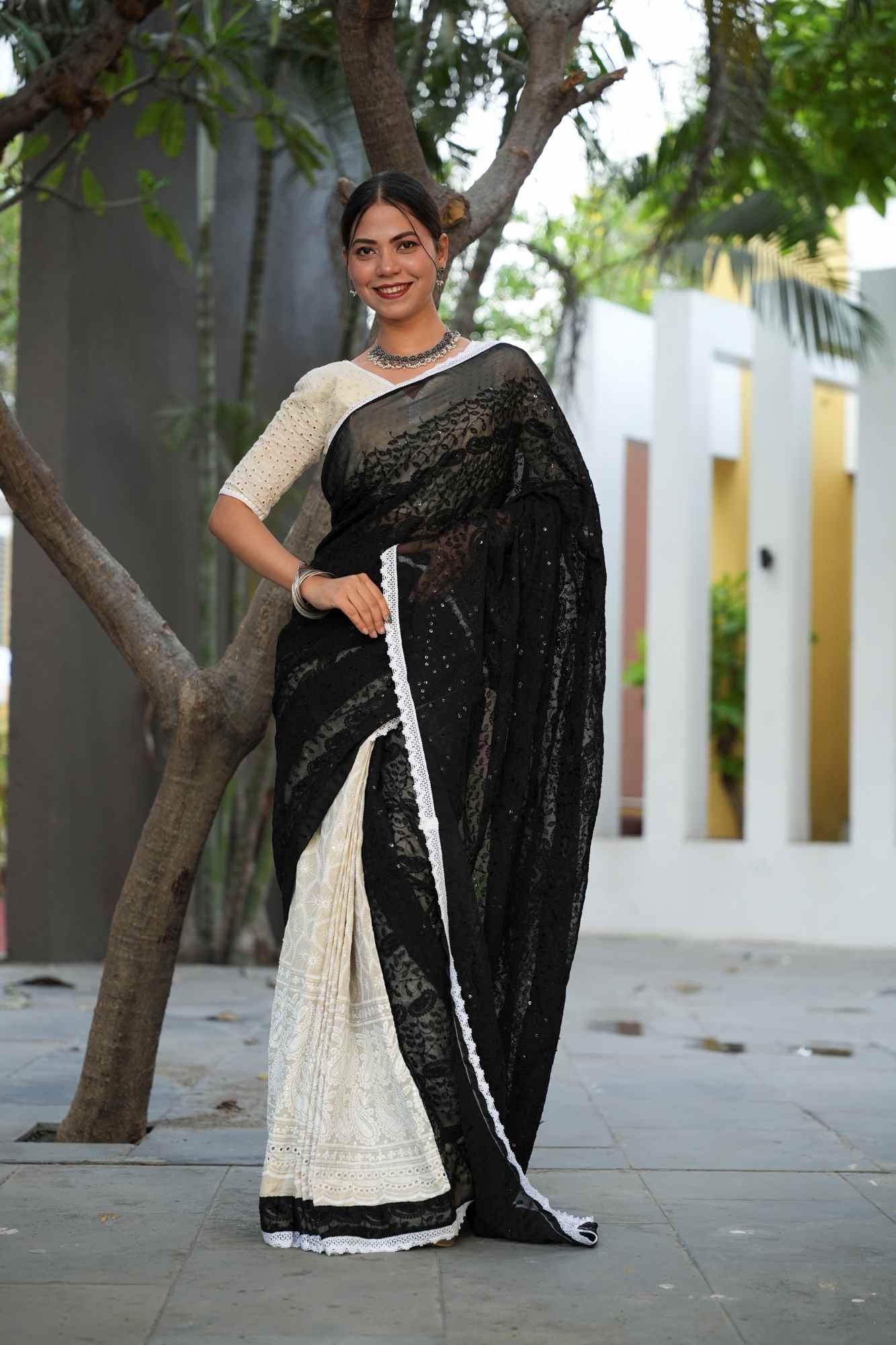 Black and white Cotton Hakoba Chikankari Work with Sequence Embroidered Pallu ready to wear saree