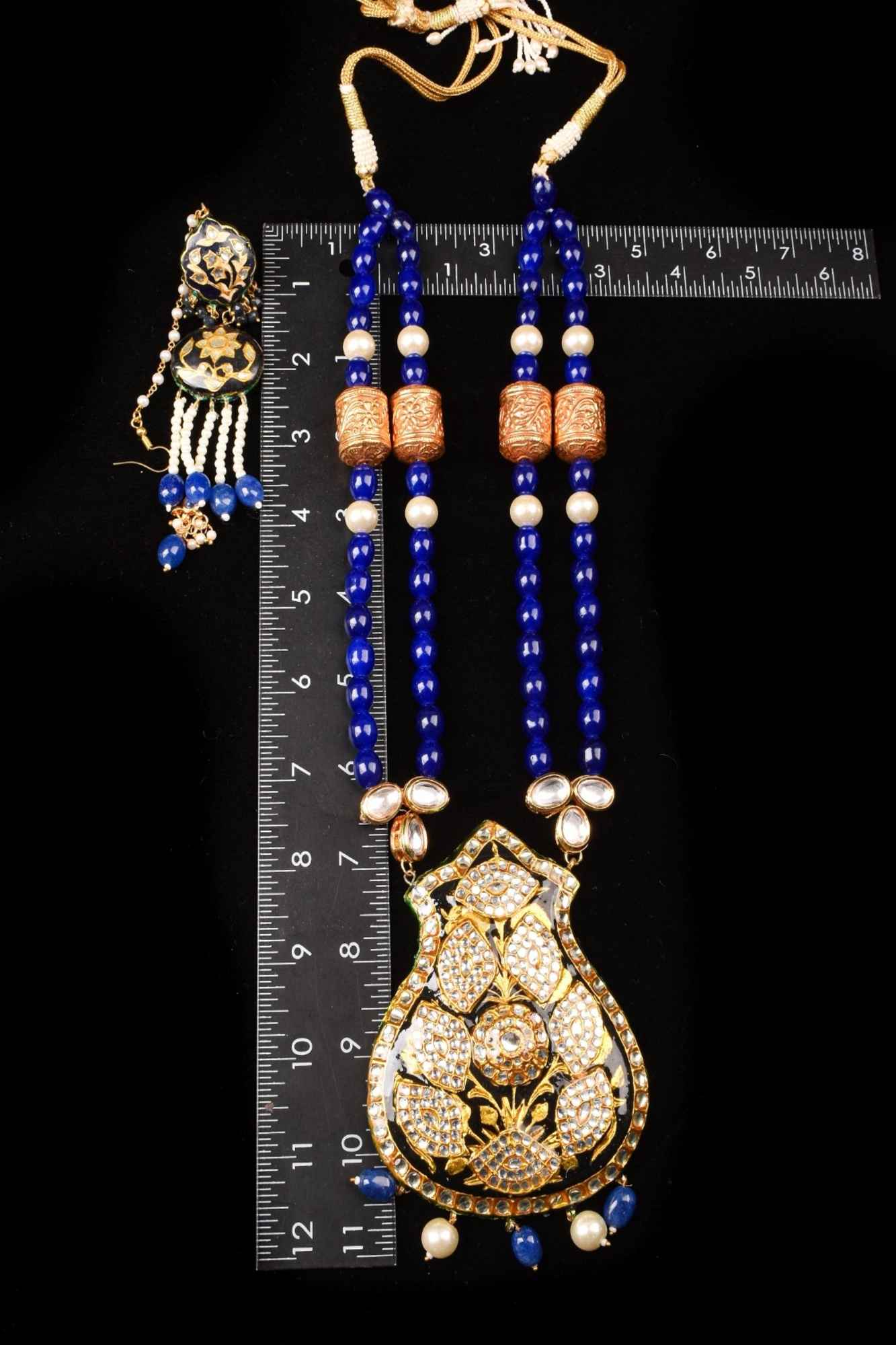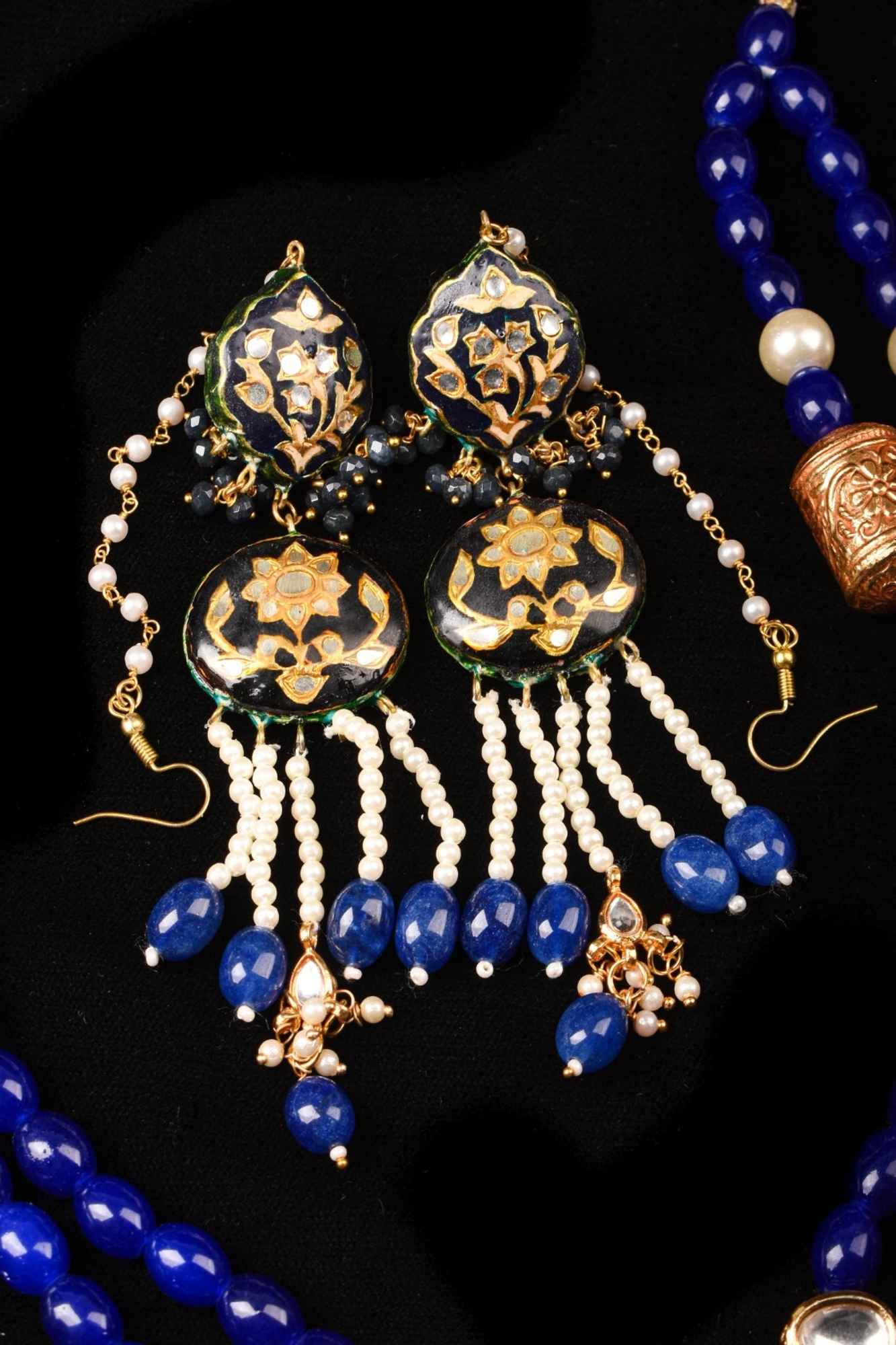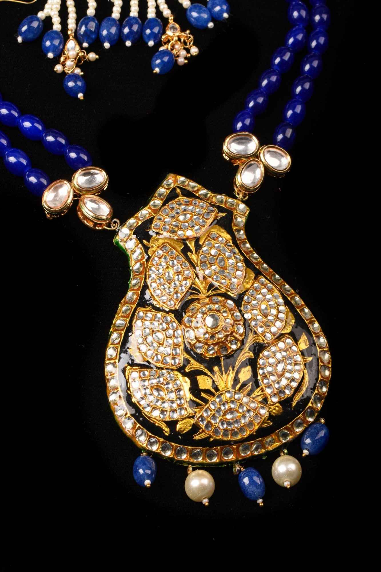 A stunning piece painted by hand on natural stone. This set with Brass and enamel work pendant and Blue double-layer beads makes it a prominent accessory to pair with your outfits.