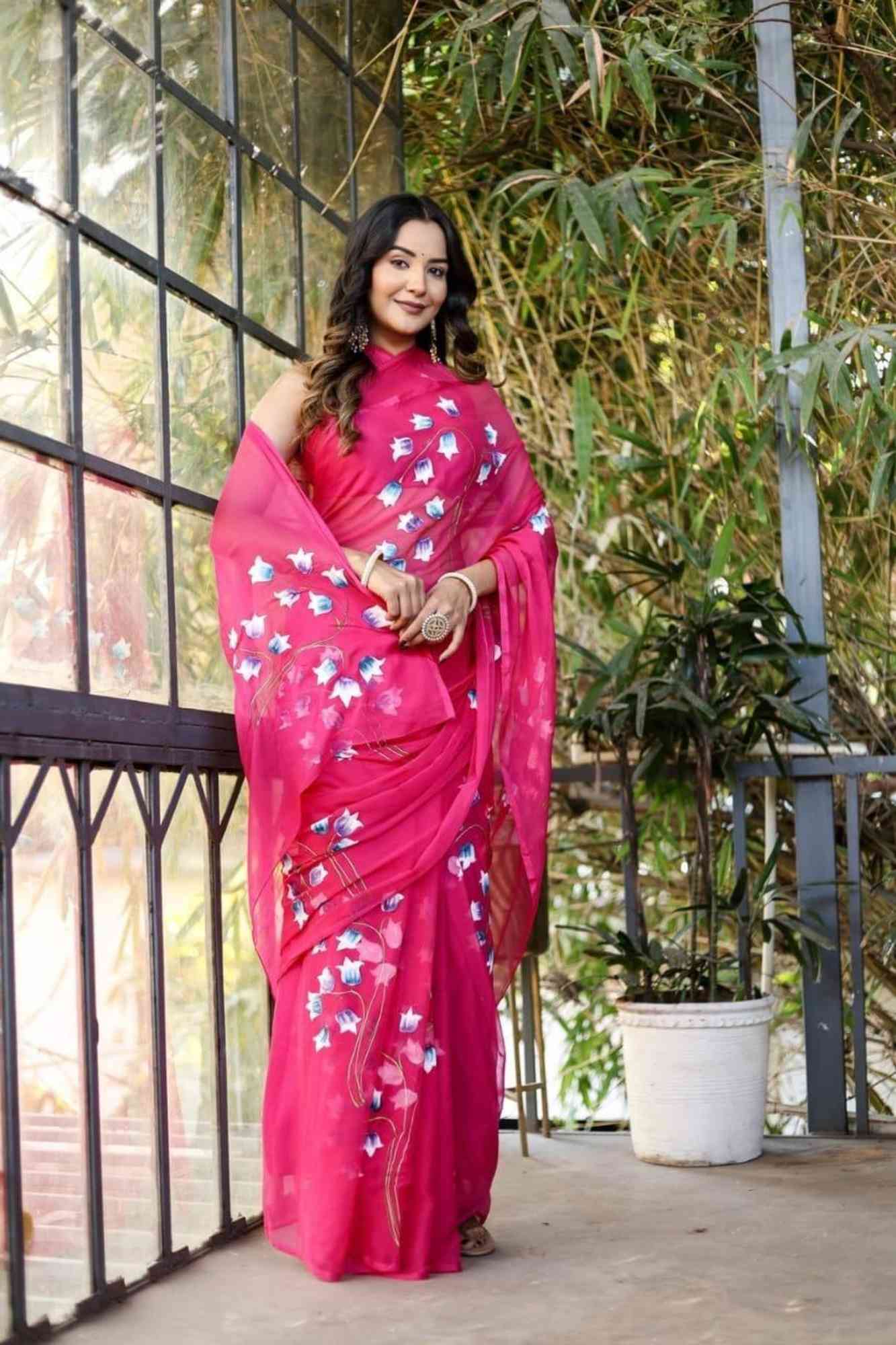 This blush pink Ready To Wear saree exudes delicate charm with its graceful hand-painted floral motifs in soft white and serene blue. Crafted from a lightweight, flowing fabric—likely chiffon or georgette—it drapes beautifully, enhancing both comfort and elegance. The fluid texture and breezy feel make it ideal for warm-weather wear or events that call for effortless sophistication.Showcasing a harmonious blend of artistry and modern femininity, the saree’s hand-painted design lends a one-of-a-kind aesthetic. Perfect for daytime celebrations, casual gatherings, or semi-formal occasions, this saree offers a fresh and graceful look that stands out through its subtle vibrancy and handcrafted detail