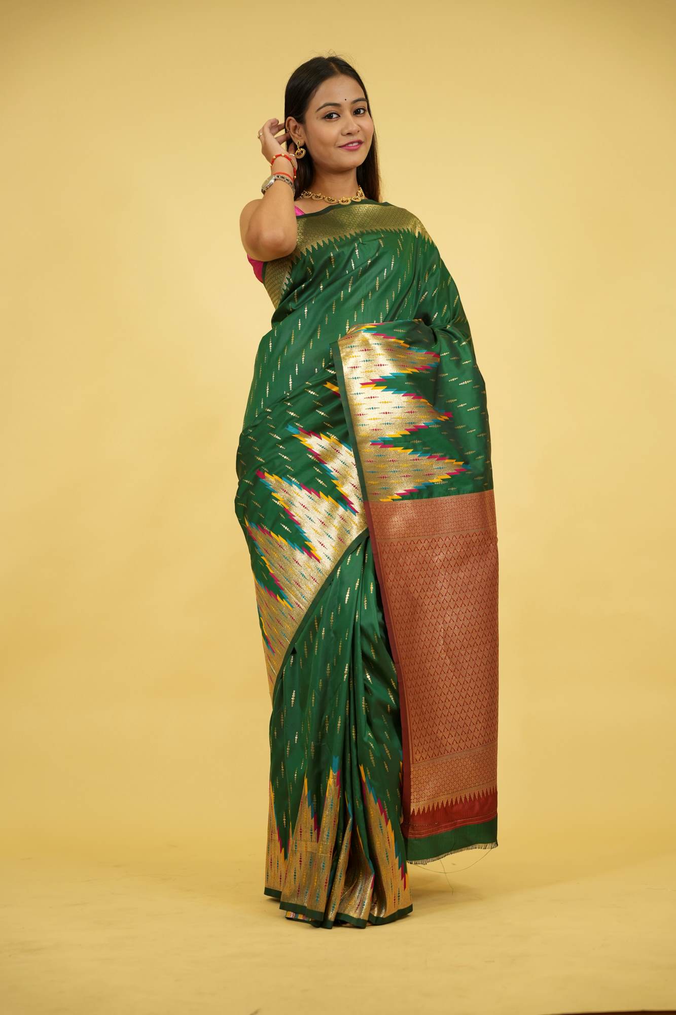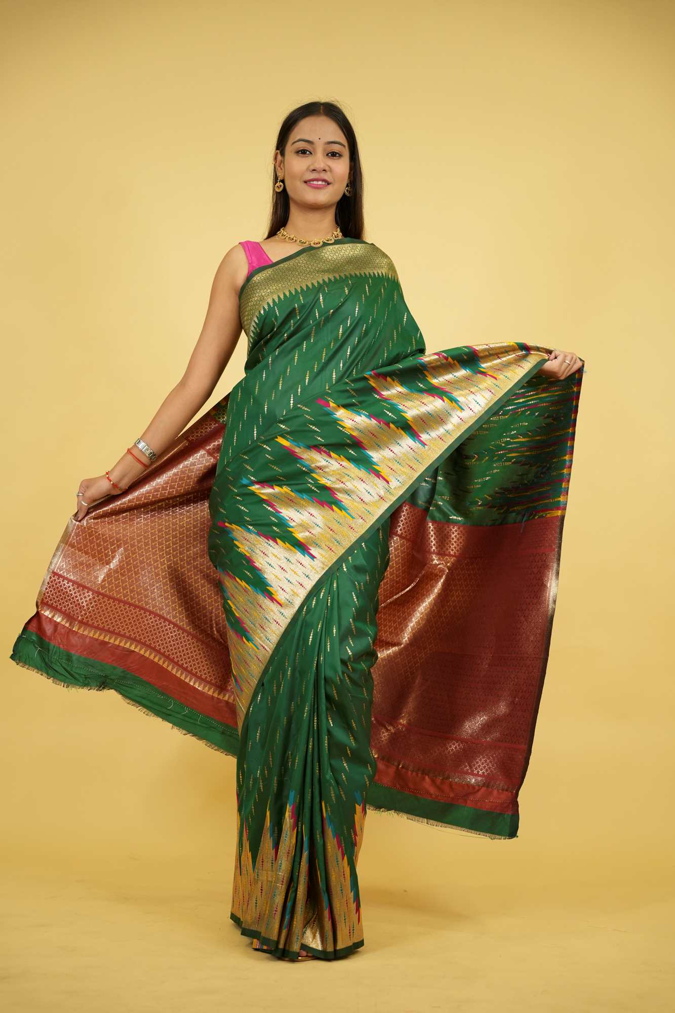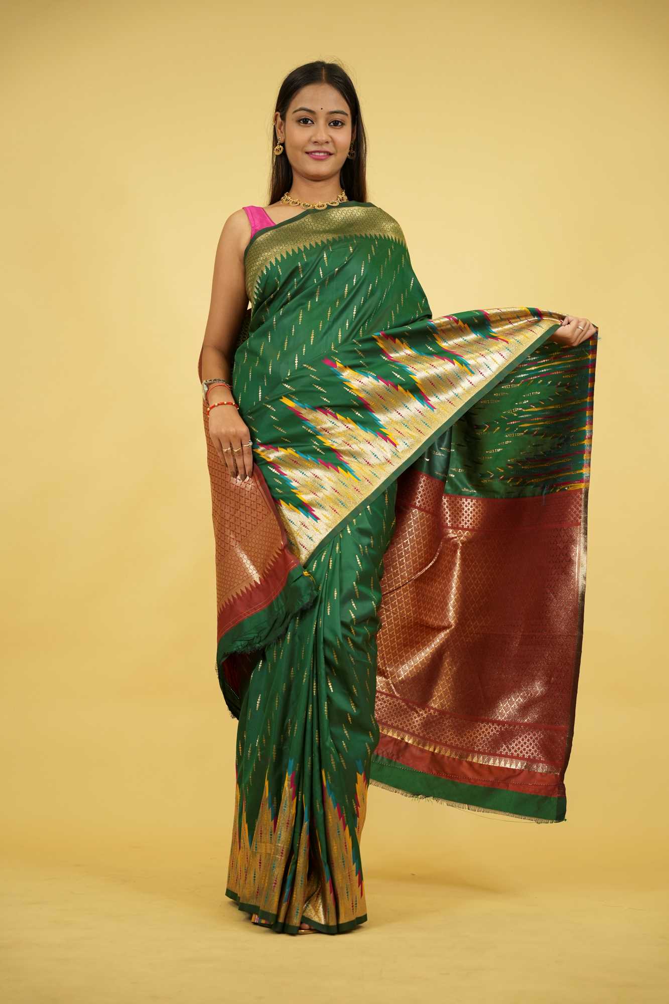 This Ready To Wear saree is crafted from silk and showcases a stunning bottle green base adorned with vibrant patola-inspired ikat motifs in multicolored threads. The intricate design is complemented by a grand copper zari pallu woven with rich geometric patterns that reflect traditional craftsmanship. The border features a striking combination of rust red and green with zari detailing, adding to the regal appeal. Ideal for festive occasions, weddings, or cultural celebrations, this saree beautifully blends heritage with elegance. Style it with gold temple jewelry to complete the opulent look