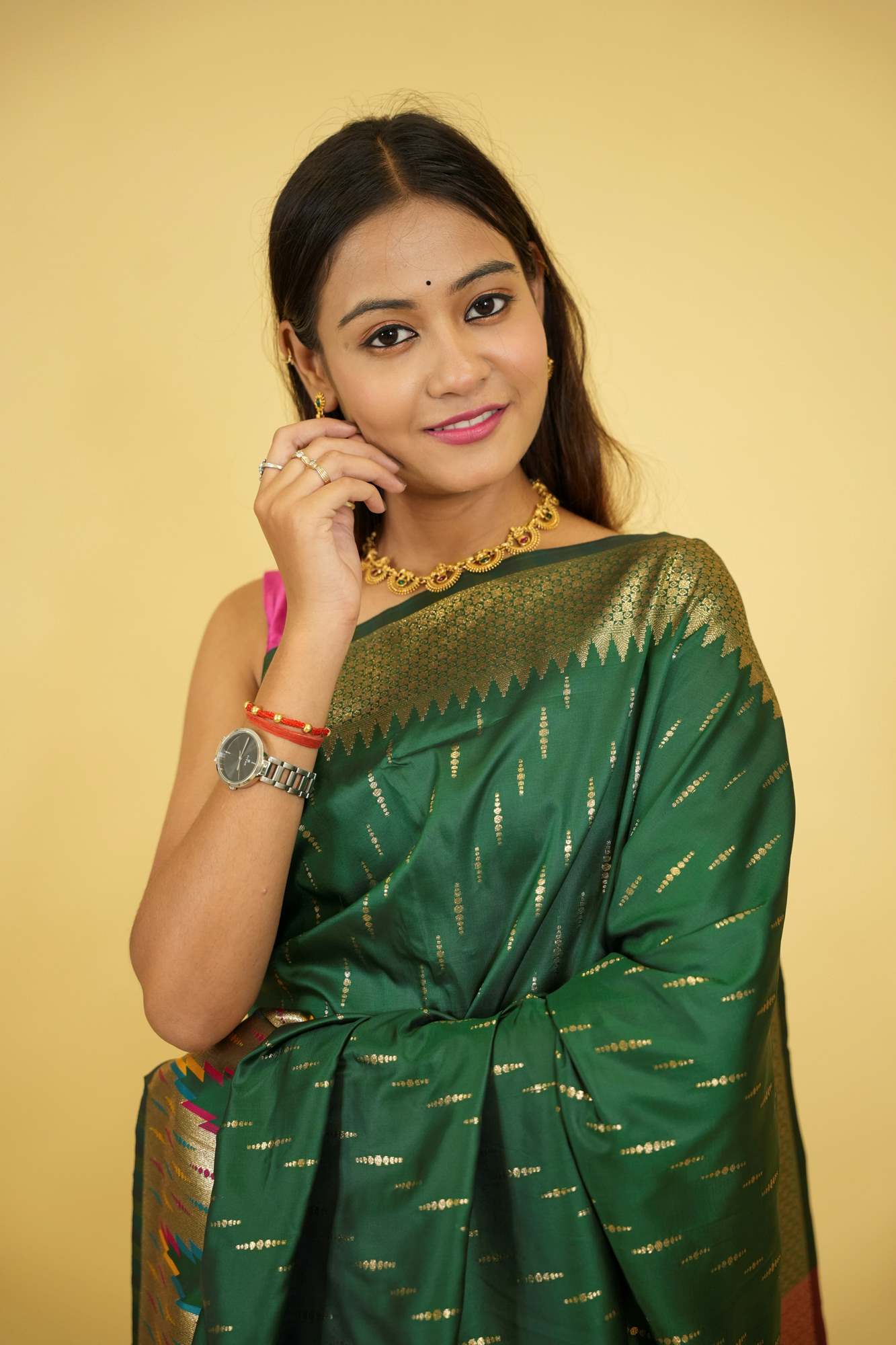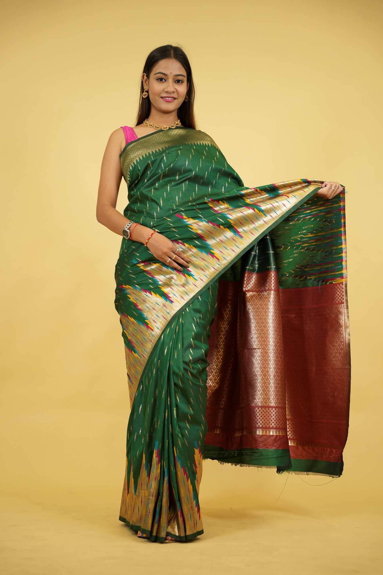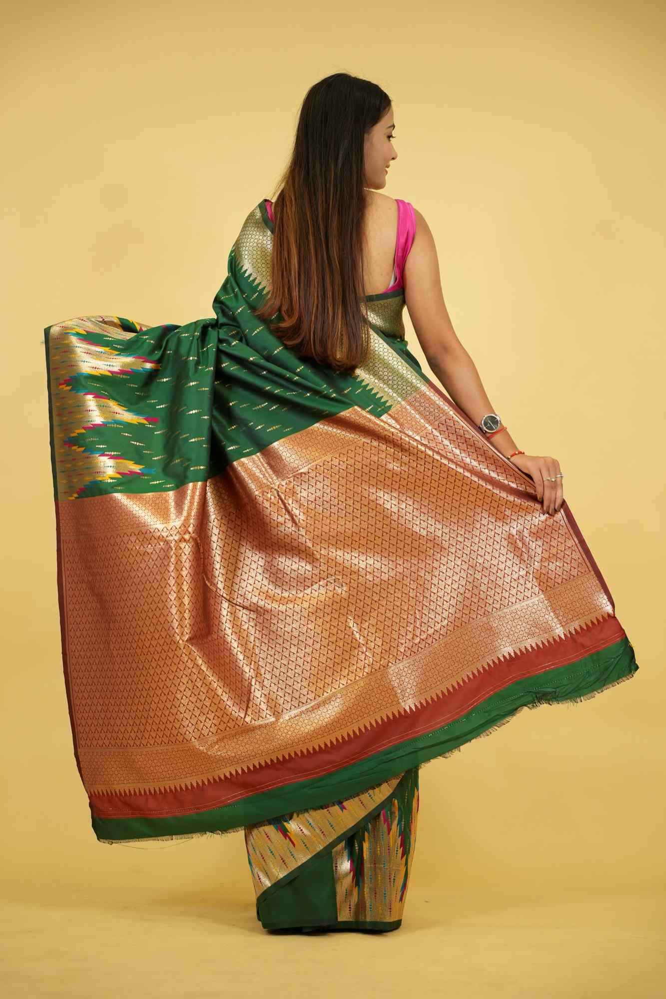 This Ready To Wear saree is crafted from silk and showcases a stunning bottle green base adorned with vibrant patola-inspired ikat motifs in multicolored threads. The intricate design is complemented by a grand copper zari pallu woven with rich geometric patterns that reflect traditional craftsmanship. The border features a striking combination of rust red and green with zari detailing, adding to the regal appeal. Ideal for festive occasions, weddings, or cultural celebrations, this saree beautifully blends heritage with elegance. Style it with gold temple jewelry to complete the opulent look