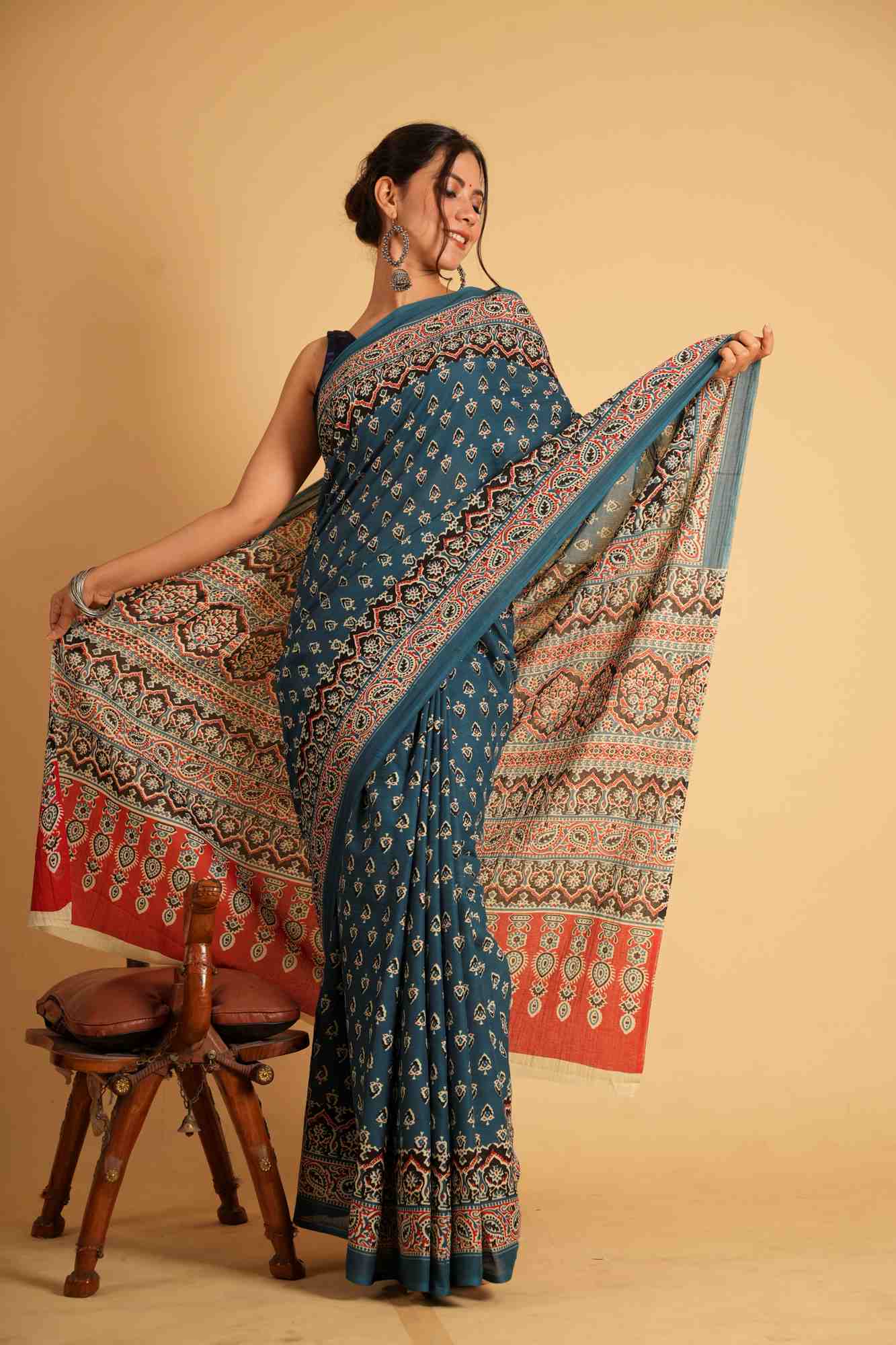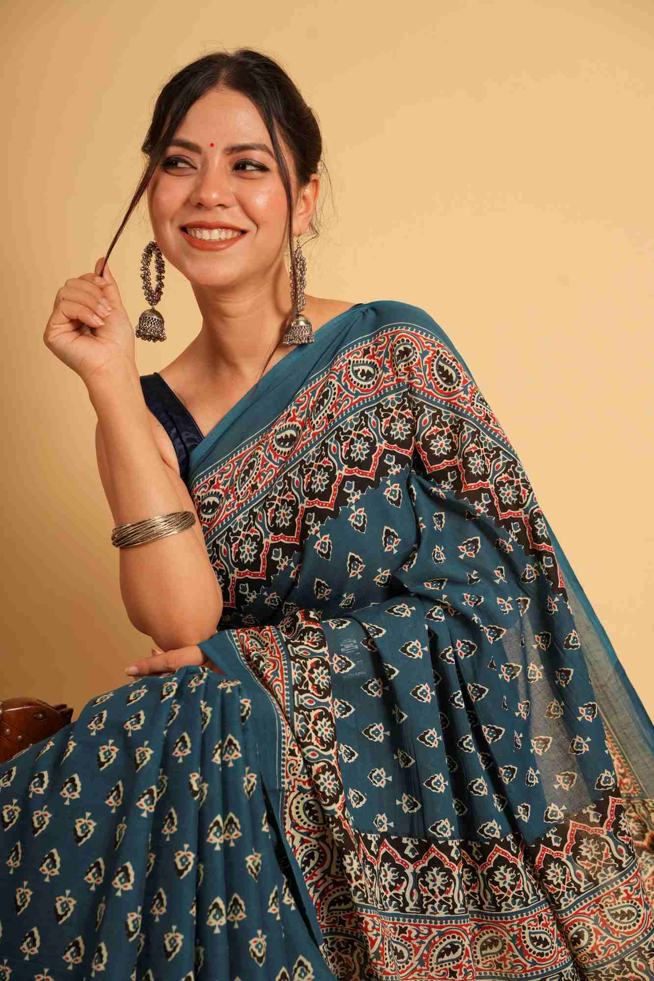 This exquisite cotton Ready To Wear saree, featuring intricate Bandhani-inspired prints in rich teal blue and vibrant red tones. Crafted from soft, breathable cotton, this saree perfectly blends traditional Bandhani artistry with modern comfort. Detailed with delicate patterns and a striking red pallu, it is ideal for festive occasions, casual gatherings, or cultural celebrations. Style it with ethnic jewelry and a contrasting blouse for a complete, graceful look.