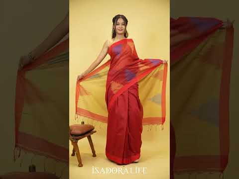 This stunning Pure Cotton-Silk Handloom Ready To Wear Saree blends rich tradition with subtle elegance. The upper pallu features a deep maroon base adorned with zigzag temple motifs in beige and grey-purple tones. The lower half of the saree showcases a shimmering beige-gold body interwoven with fine zari-style horizontal stripes, adding a touch of sophistication. Bold box patterns in red, green, and rust enhance the drape, offering a unique contrast. Finished with a classic red border, this saree is ideal for festive occasions, cultural functions, or elegant evening we