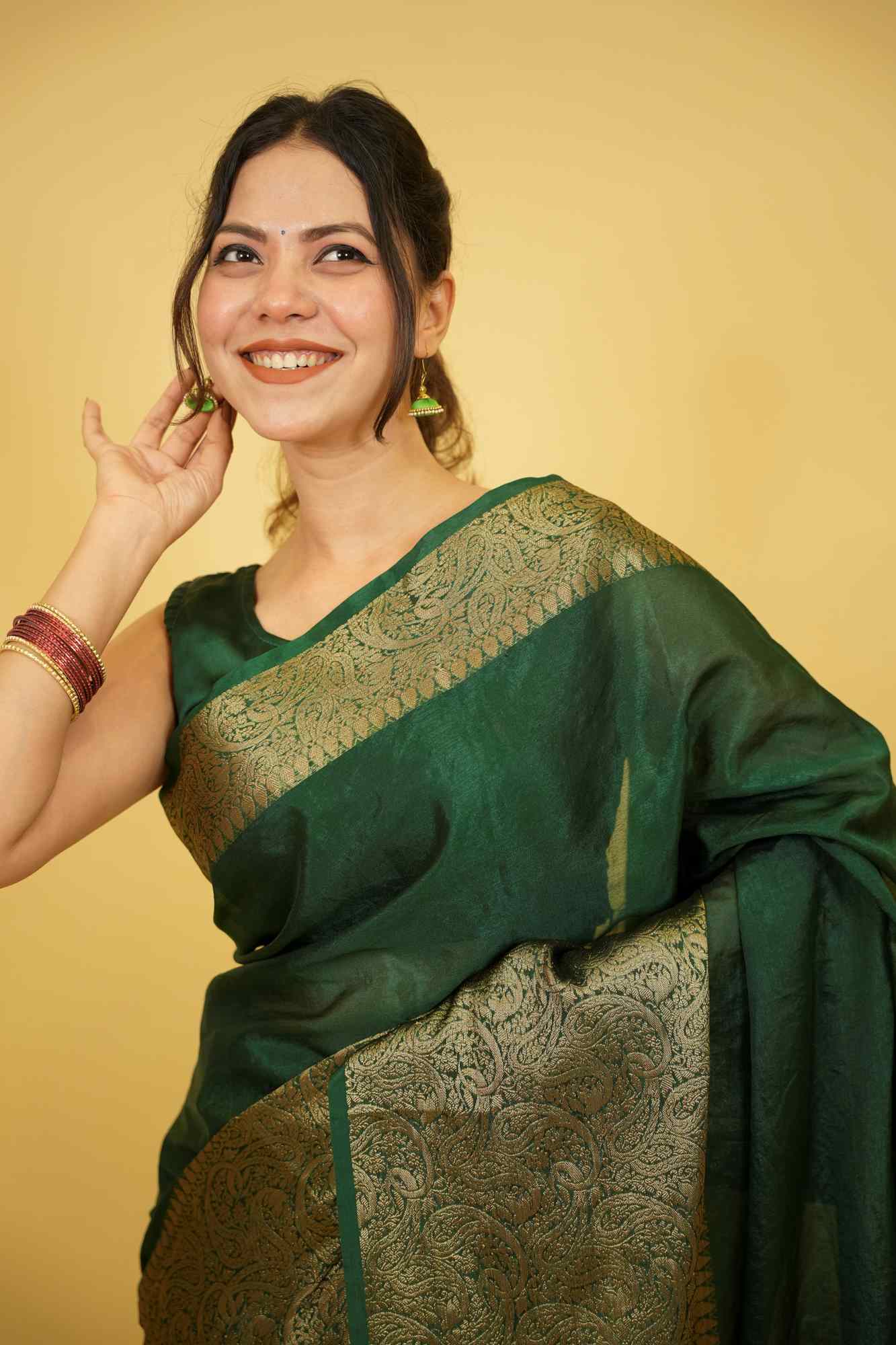 This stunning Dark Green Silk Saree, featuring a smooth plain body that exudes timeless charm. The saree is elevated with a lavish heavy zari-woven border and a designer pallu, reflecting the essence of traditional craftsmanship. Paired with a matching zari-rich blouse, it’s the perfect choice for weddings, festive celebrations, and grand occasions.