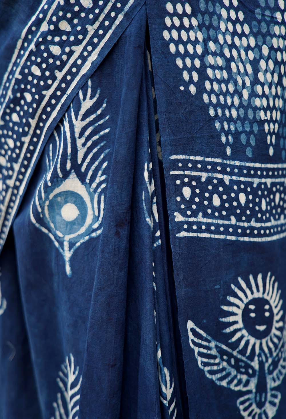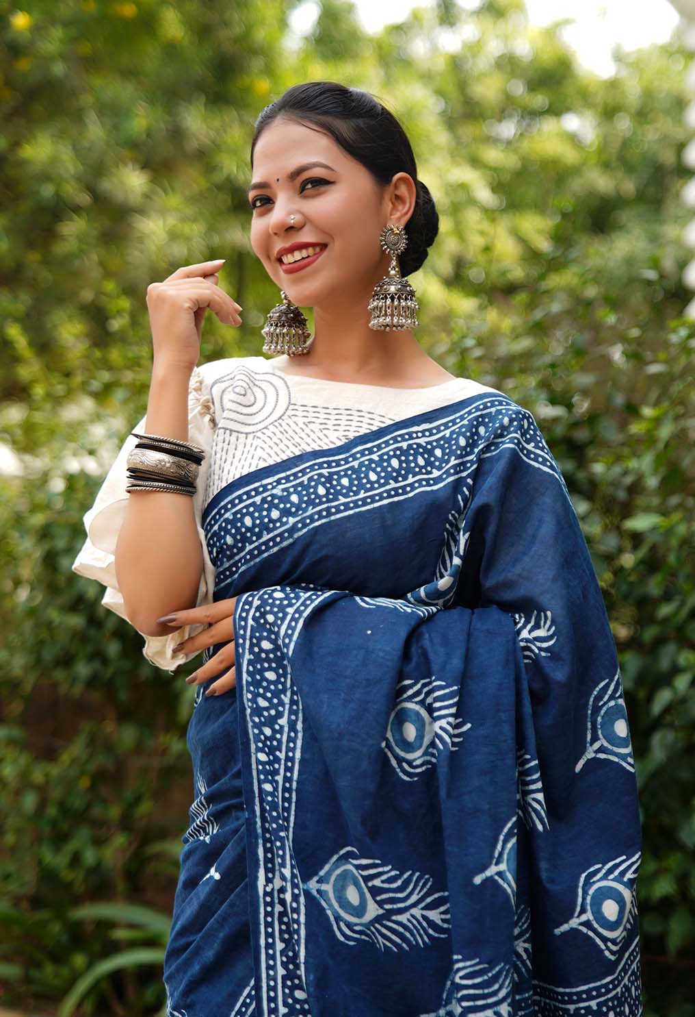 Drape saree Indigo Handblock Print mulmul one minute saree