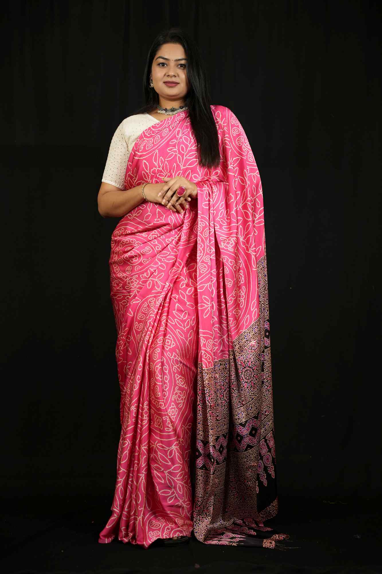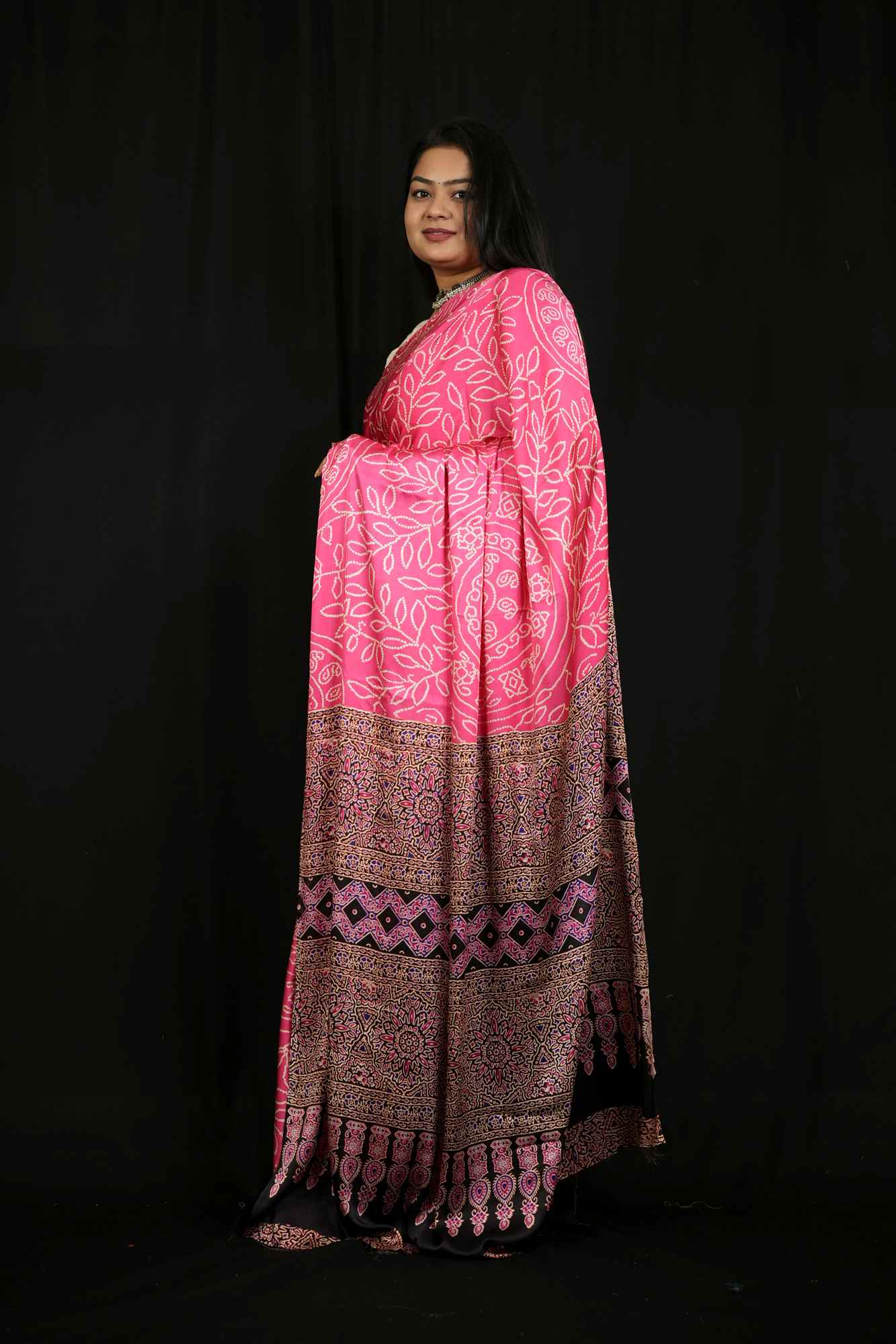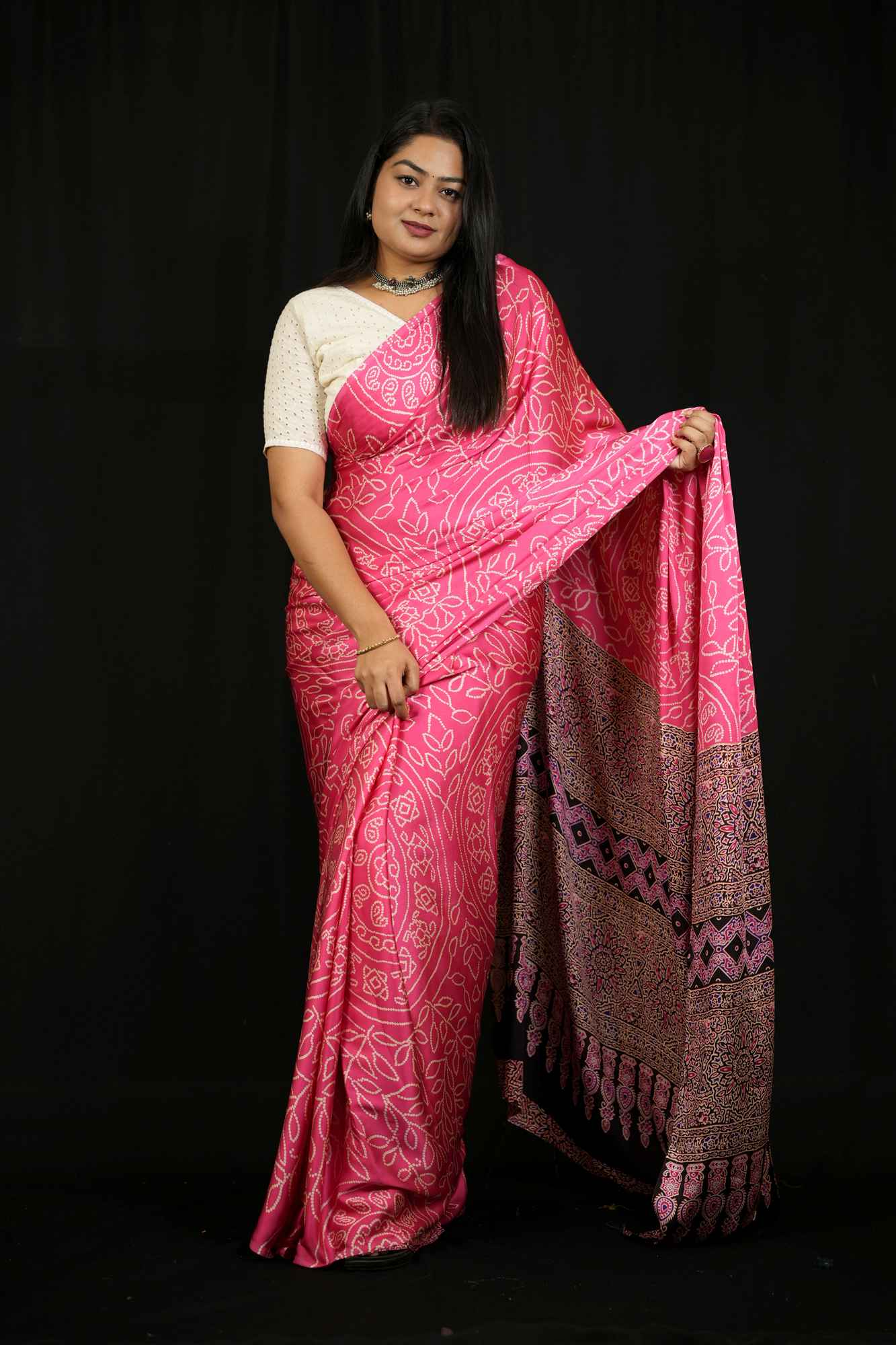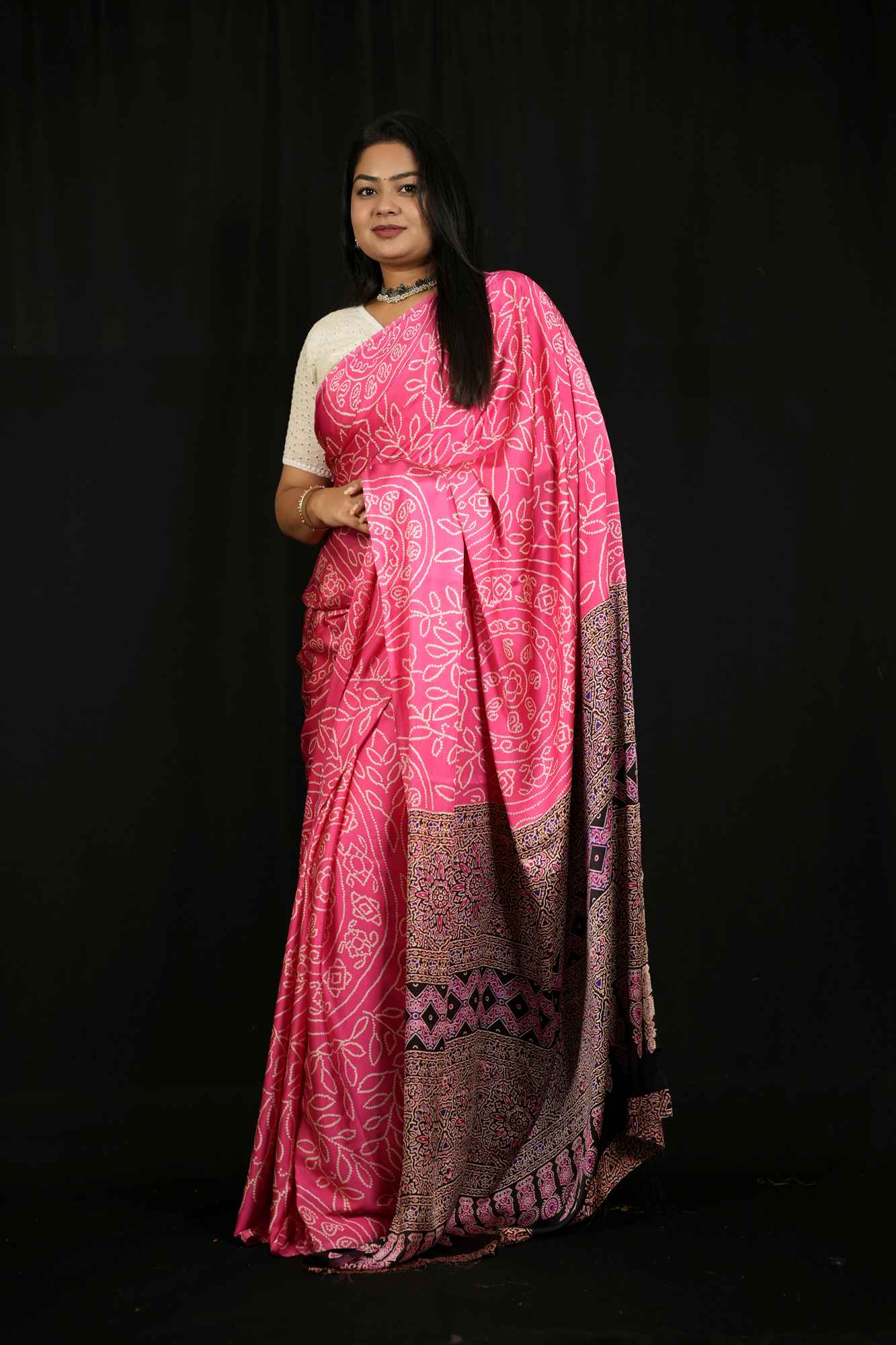 This exquisite Ready To Wear saree is made from semi Gajji silk, known for its rich texture, soft sheen, and graceful fall. The saree features a vibrant fuchsia base adorned with delicate dotted motifs forming leafy and circular patterns across the drape. The lower half and pallu showcase traditional Ajrakh prints in earthy tones of black, maroon, and beige, adding a striking contrast and artisanal charm. A perfect blend of heritage craft and contemporary elegance, this saree is ideal for festive occasions, cultural celebrations, and special gatherings