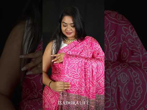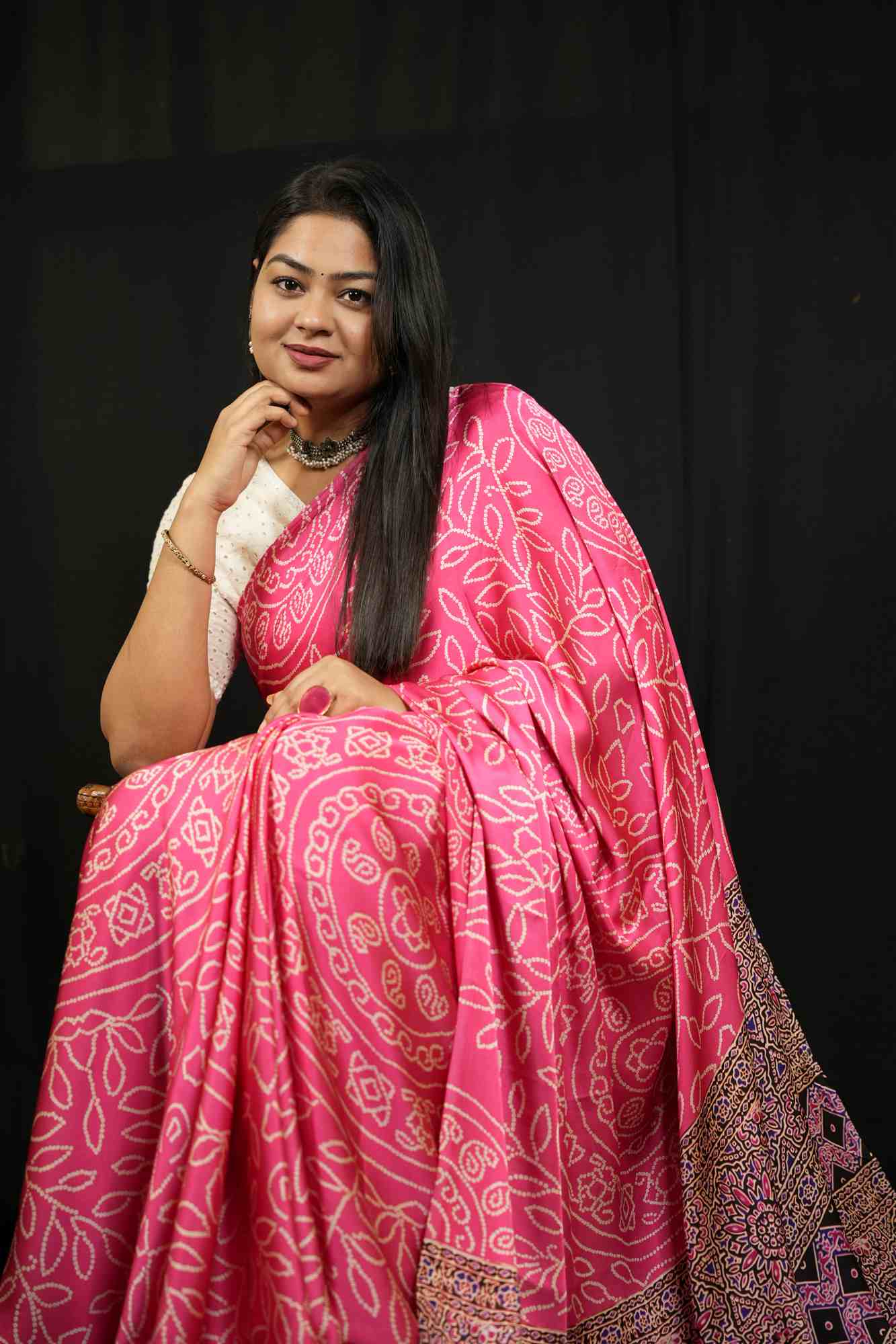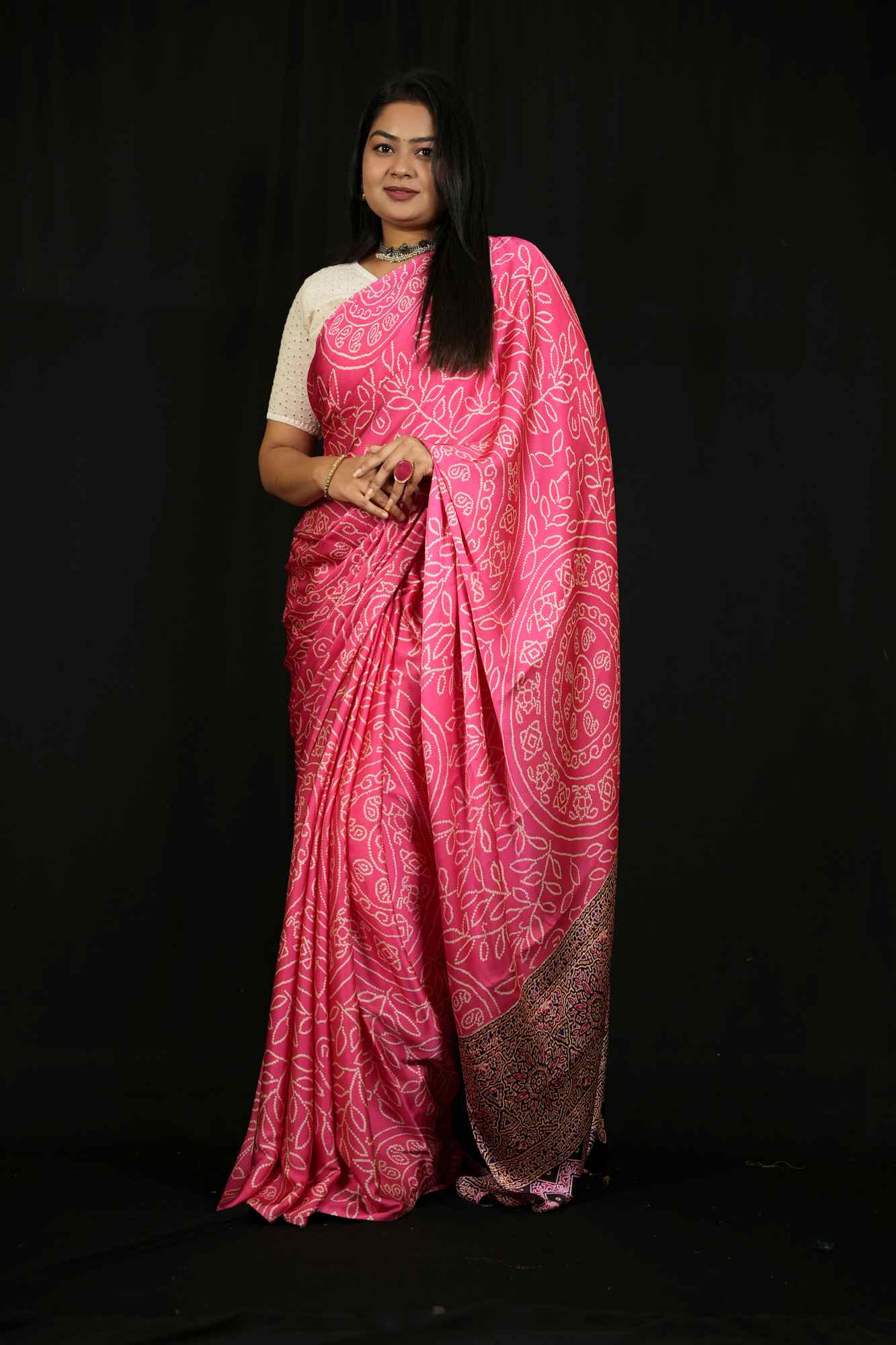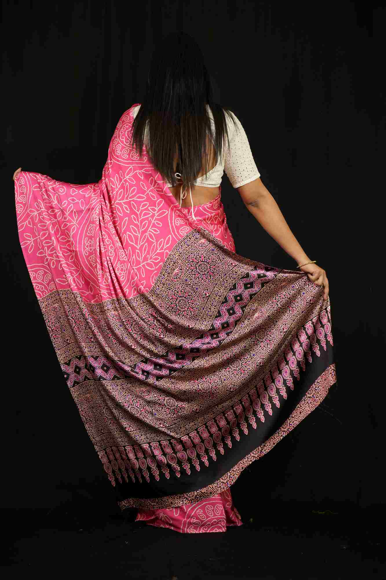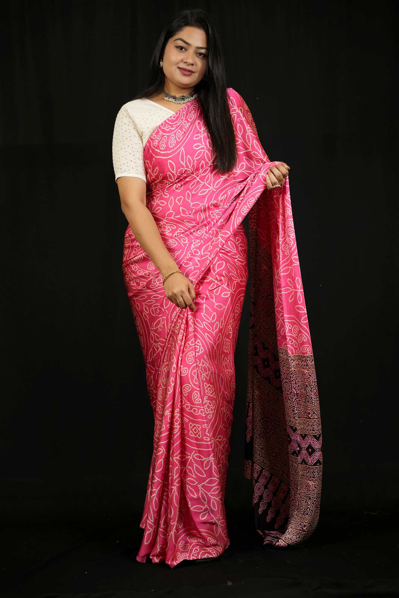 This exquisite Ready To Wear saree is made from semi Gajji silk, known for its rich texture, soft sheen, and graceful fall. The saree features a vibrant fuchsia base adorned with delicate dotted motifs forming leafy and circular patterns across the drape. The lower half and pallu showcase traditional Ajrakh prints in earthy tones of black, maroon, and beige, adding a striking contrast and artisanal charm. A perfect blend of heritage craft and contemporary elegance, this saree is ideal for festive occasions, cultural celebrations, and special gatherings