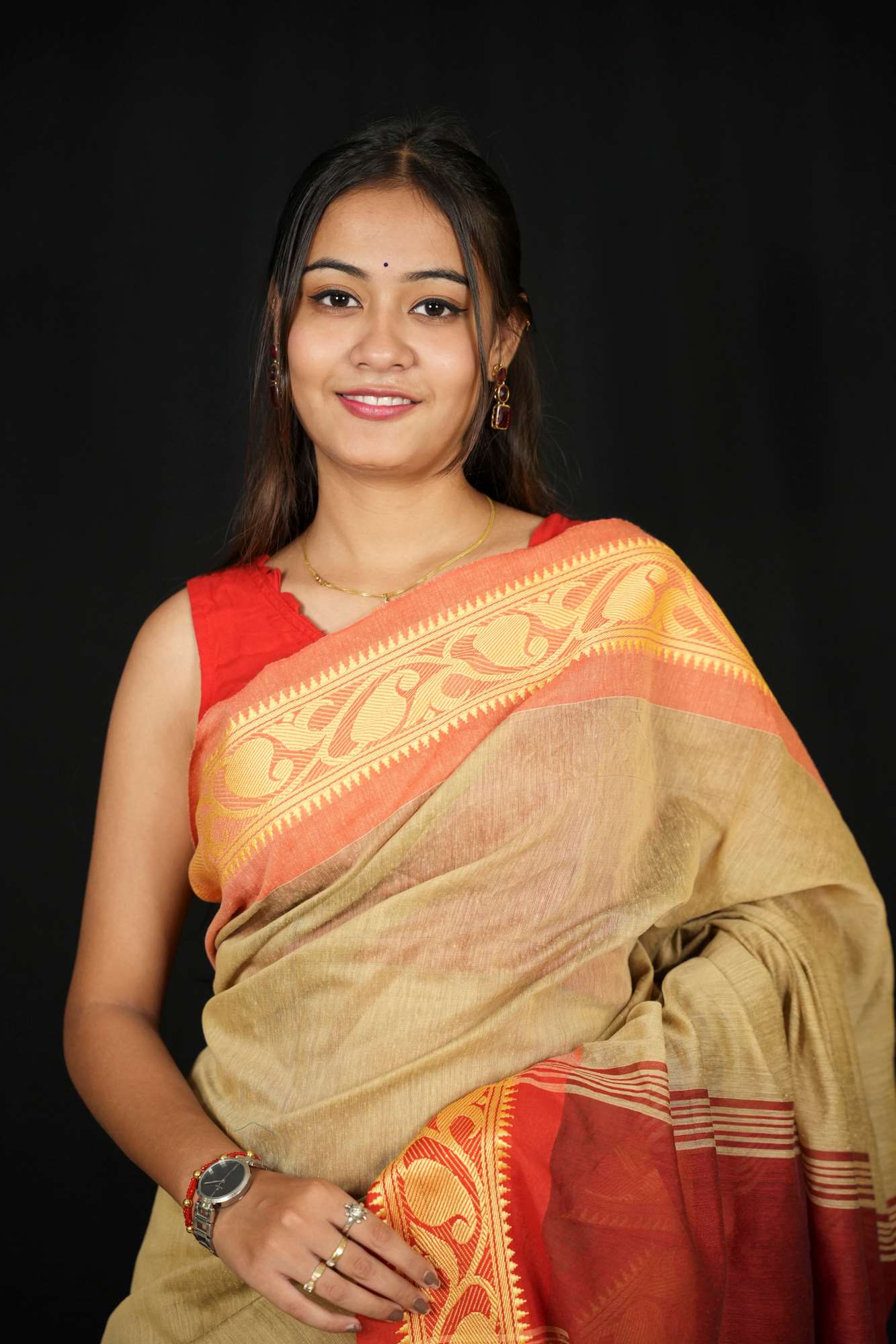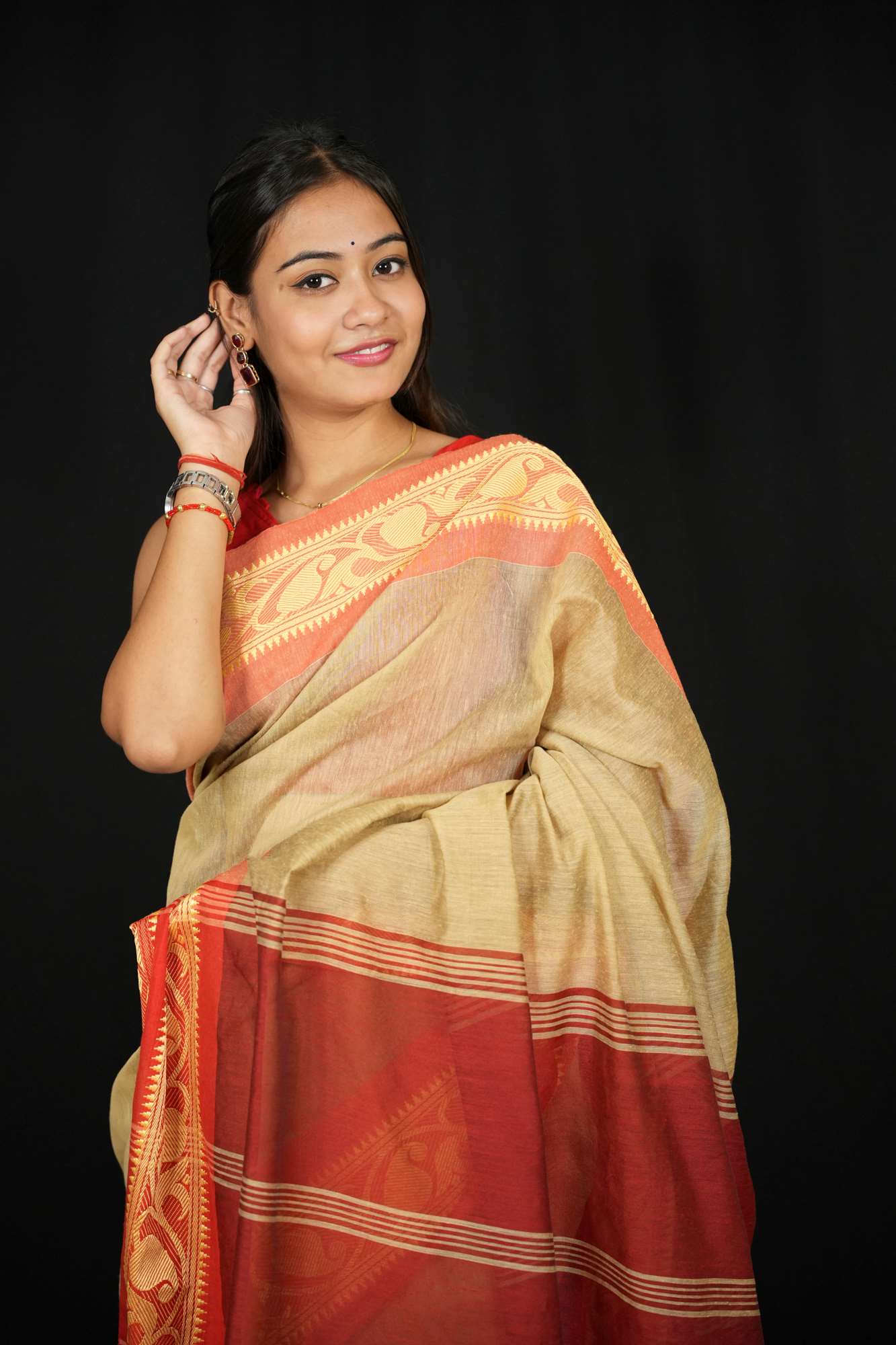 Golden Beige Cotton Silk with Red Woven Border & Pallu Ready To Wear Saree