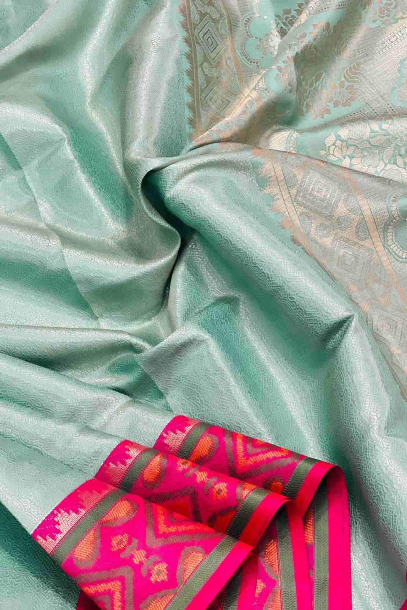 Sea Green Patola inspired Silk with Contrast Pink Ikat-Inspired Border Ready To Wear Saree