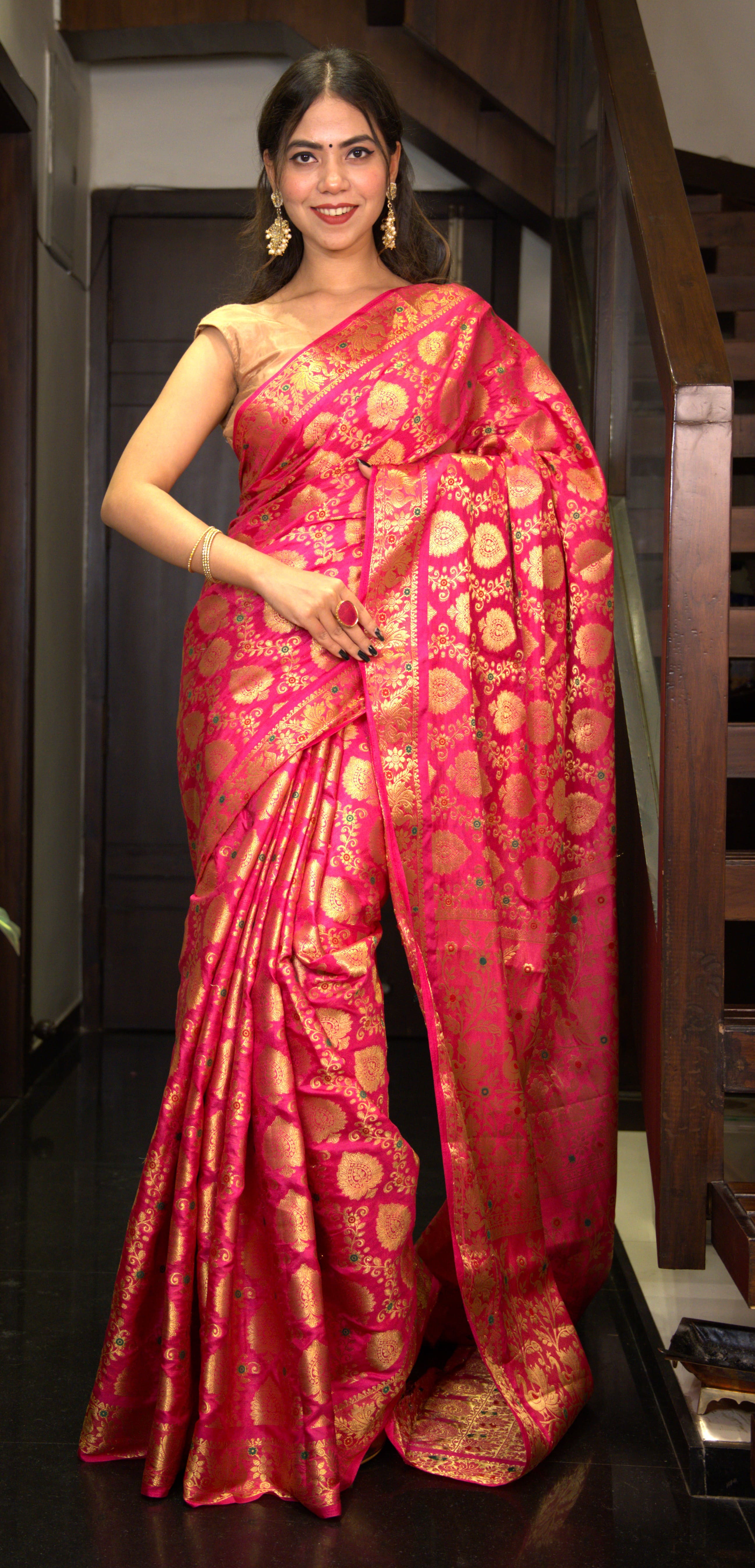 kanjivaram Zari Interweaving Coral Pink Wrap in 1 minute Saree