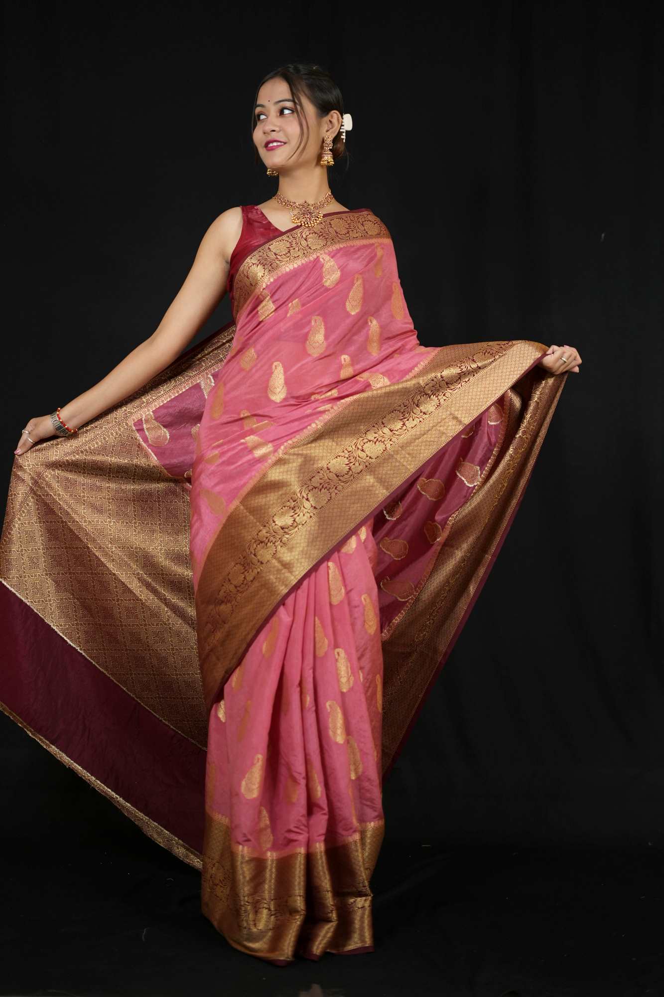 This Banaras Semi Katan Silk Ready To Wear Saree is a true embodiment of elegance and rich tradition. Crafted from lustrous semi katan silk, the saree features a captivating deep pink base adorned with beautifully woven golden paisley motifs, symbolizing prosperity and grace. The striking contrast zari border showcases intricate floral and geometric patterns, reflecting the mastery of skilled artisans.The dense weave of katan silk lends the saree a crisp texture, while its natural sheen enhances its royal appeal. The elaborate zari work along the pallu and border adds a magnificent touch of opulence, making it an ideal choice for weddings, festive occasions, and grand celebrations. Paired with a matching unstitched blouse piece, this saree offers endless possibilities for creating a personalized, regal look. A treasured piece that seamlessly blends heritage with sophisticated charm.