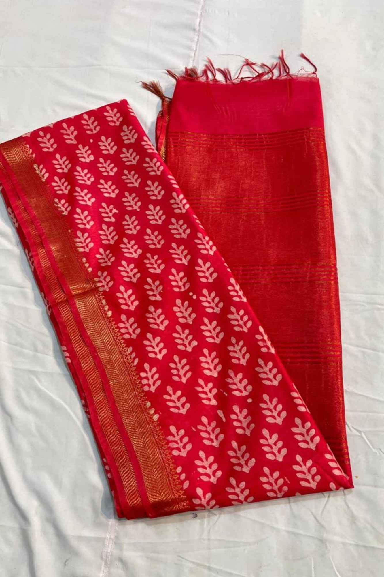 This Kota Silk Ready To Wear Saree is a beautiful fusion of traditional weaving artistry and refined elegance. Crafted with a cotton-silk blend, the fabric is exceptionally lightweight, breathable, and durable, making it perfect for warm climates and extended wear.The saree showcases a rich orange body adorned with delicate white leaf-like motifs, highlighted by a gold zari border that adds a touch of festive sophistication. The lower half remains plain orange, accentuated with horizontal gold stripes and a deep orange edge, finishing gracefully with finely knotted tassels for added charm