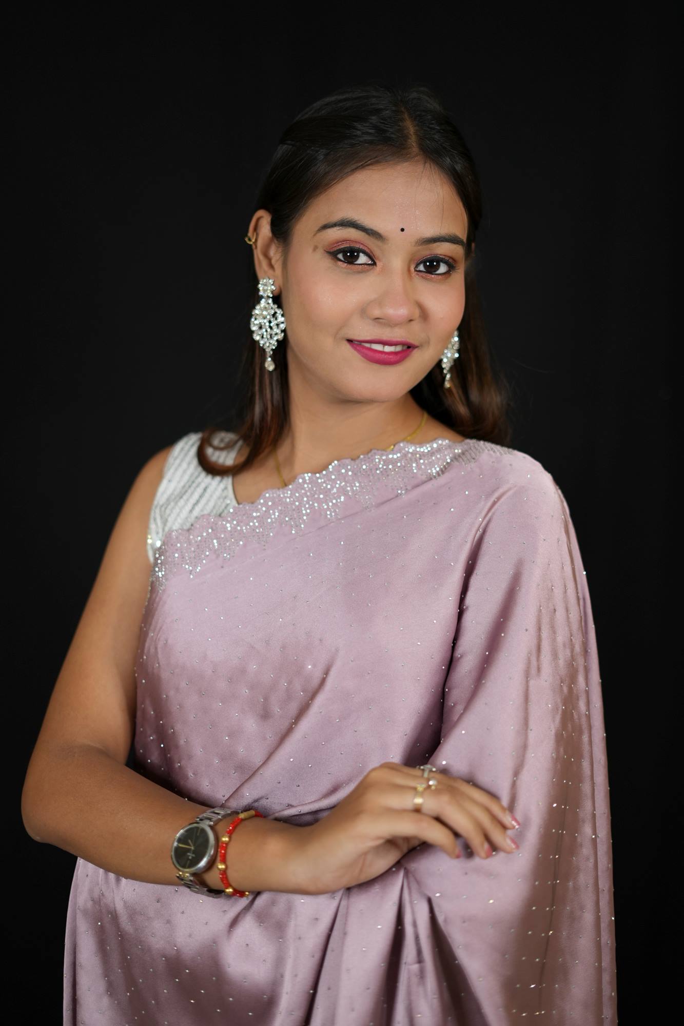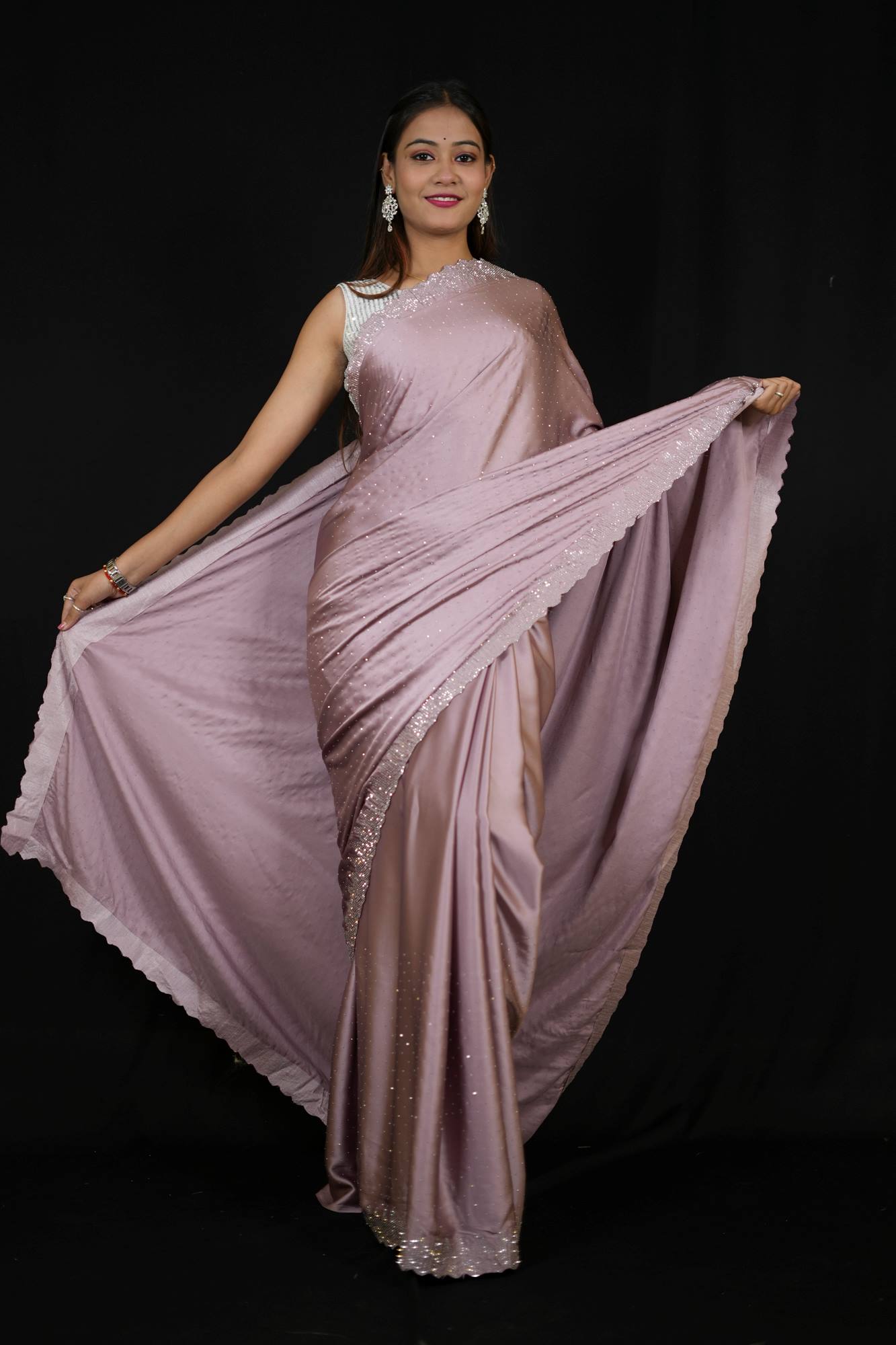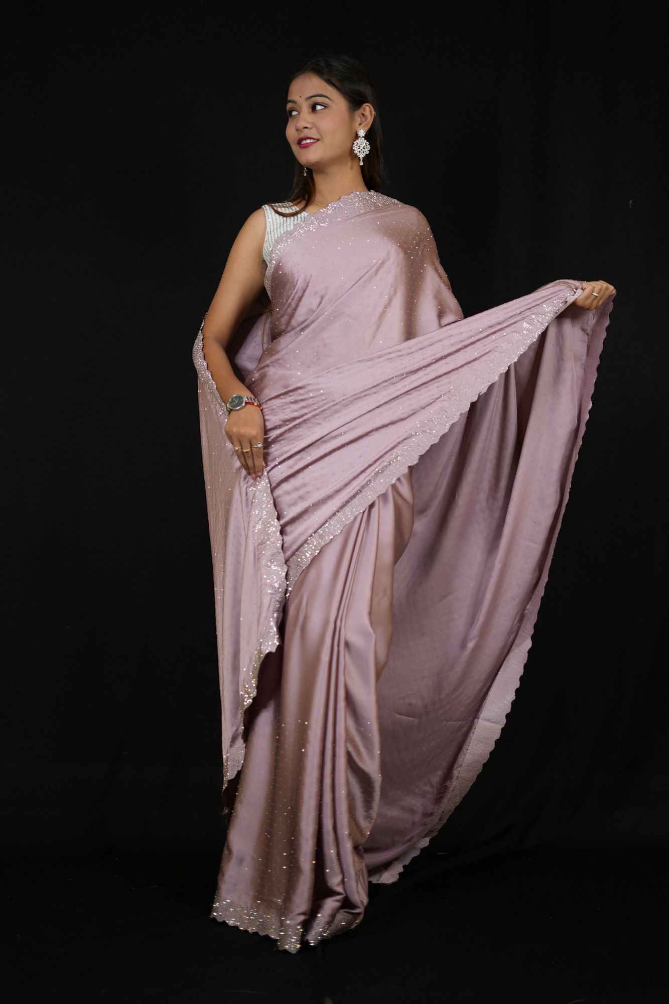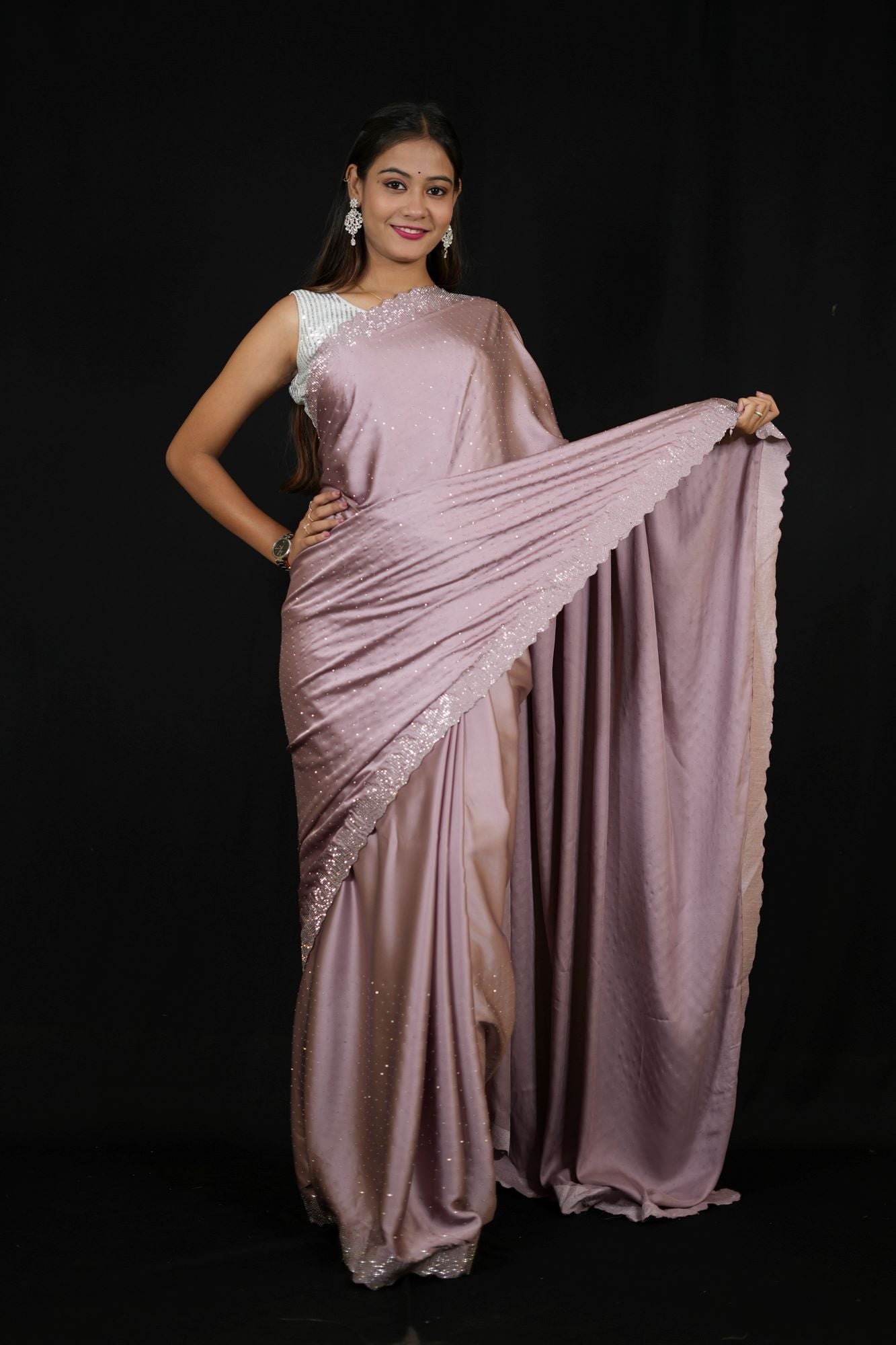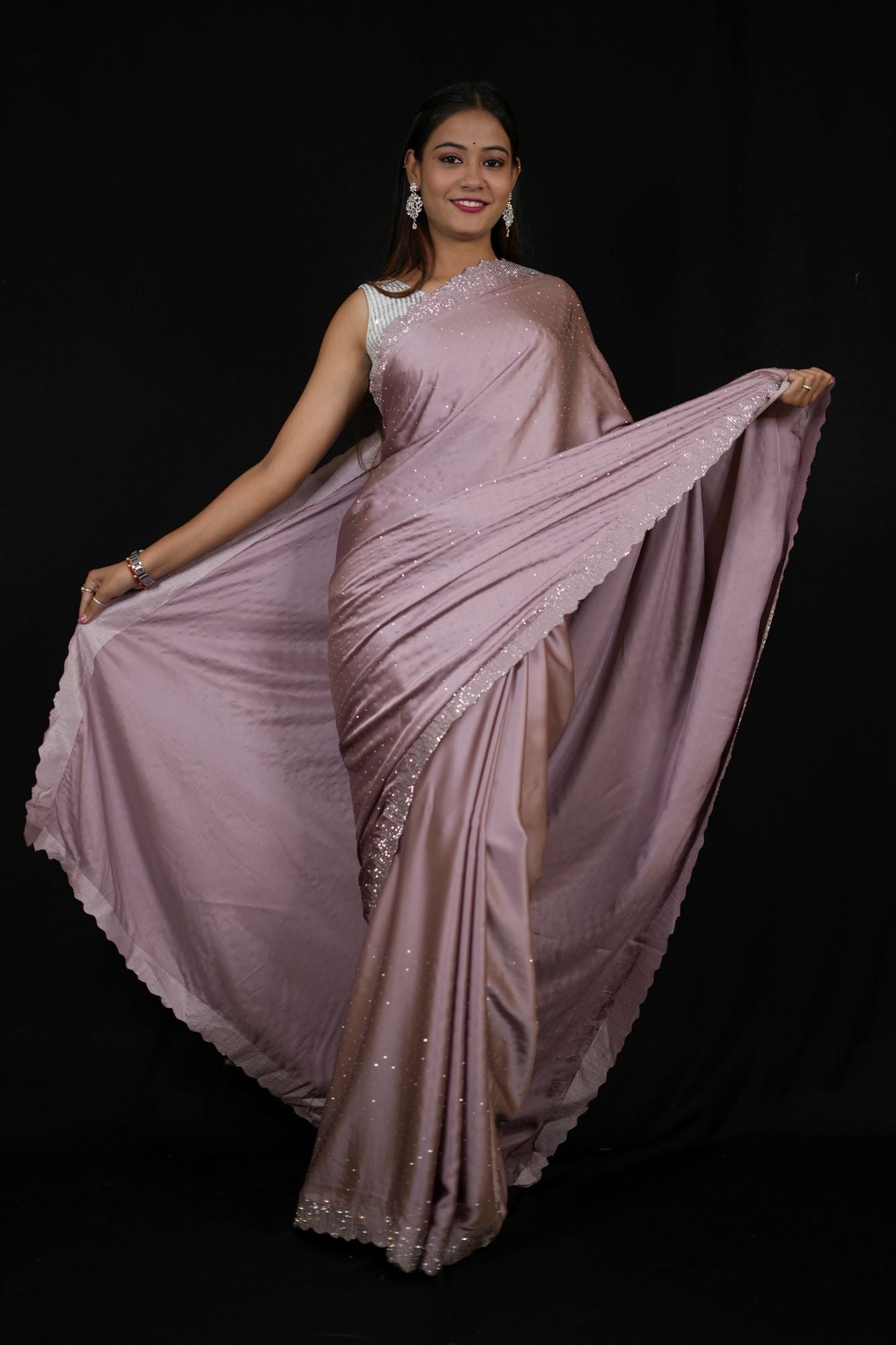 This light purple satin Ready To Wear saree exudes understated elegance with its smooth, glossy finish and fluid drape. The soft satin fabric creates gentle folds that enhance the saree’s flowing silhouette, offering a flattering and sophisticated look for any occasion.Accentuating the understated charm is a refined silver border, beautifully embellished with a delicate scalloped design that adds a subtle touch of intricacy and shimmer. Whether you're attending a formal event, festive celebration, or an evening gathering, this versatile saree offers classic beauty with a hint of contemporary flair—making it a must-have in every elegant wardrobe