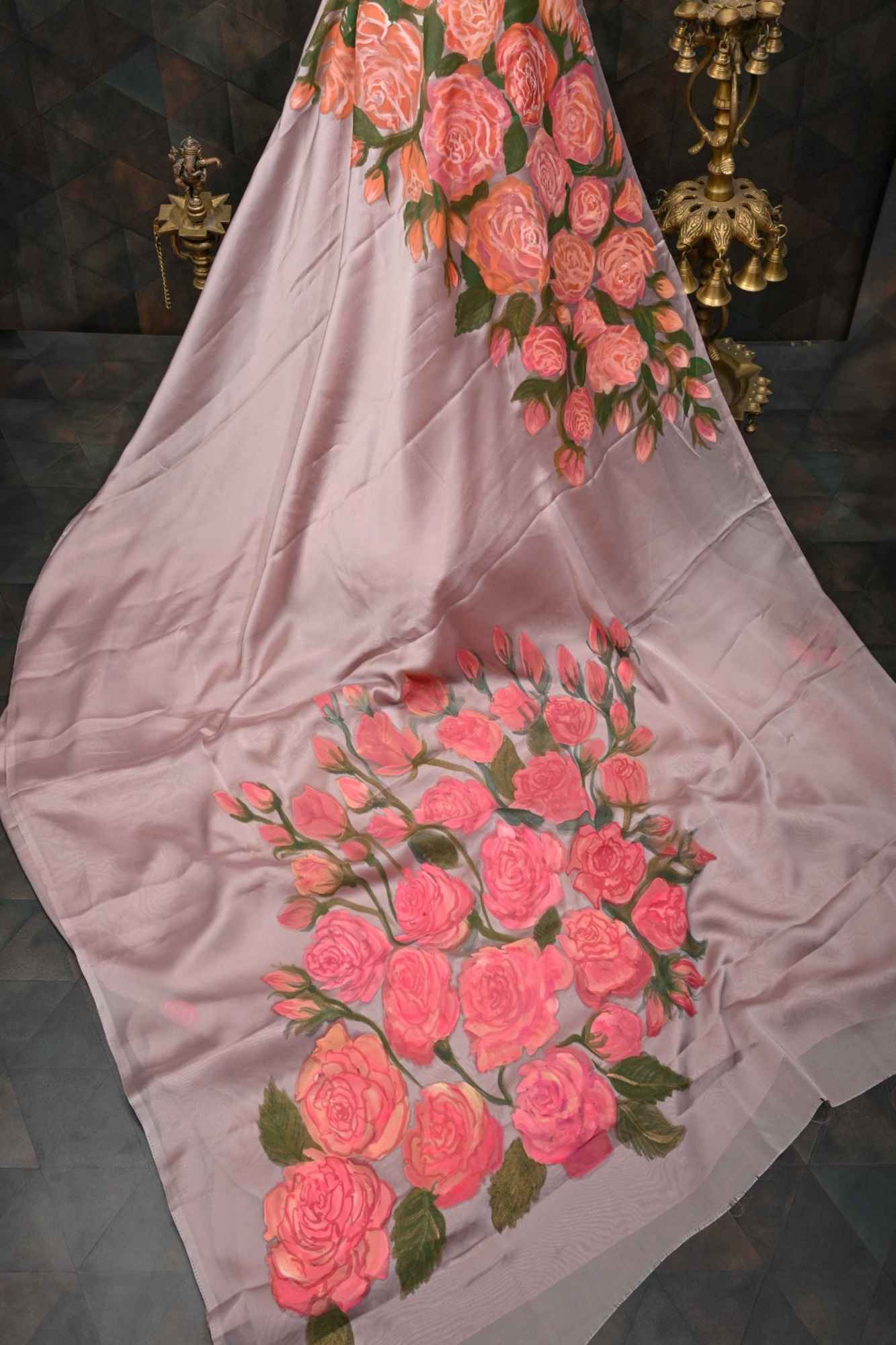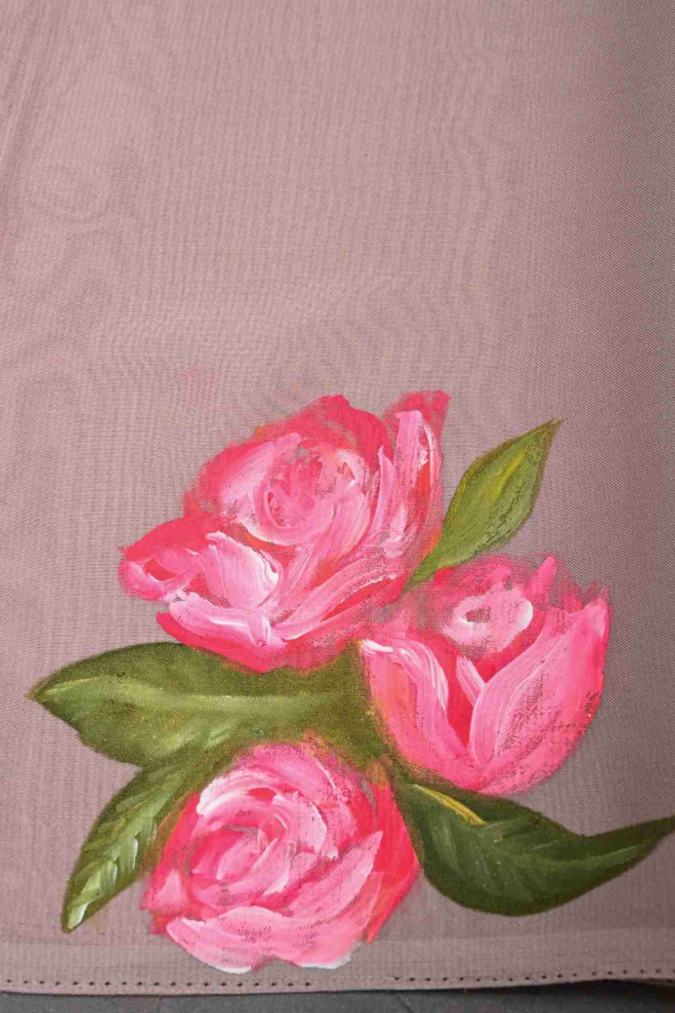 Mauve Shimmer Organza Saree with Hand-Painted Blooming Rose Cascade