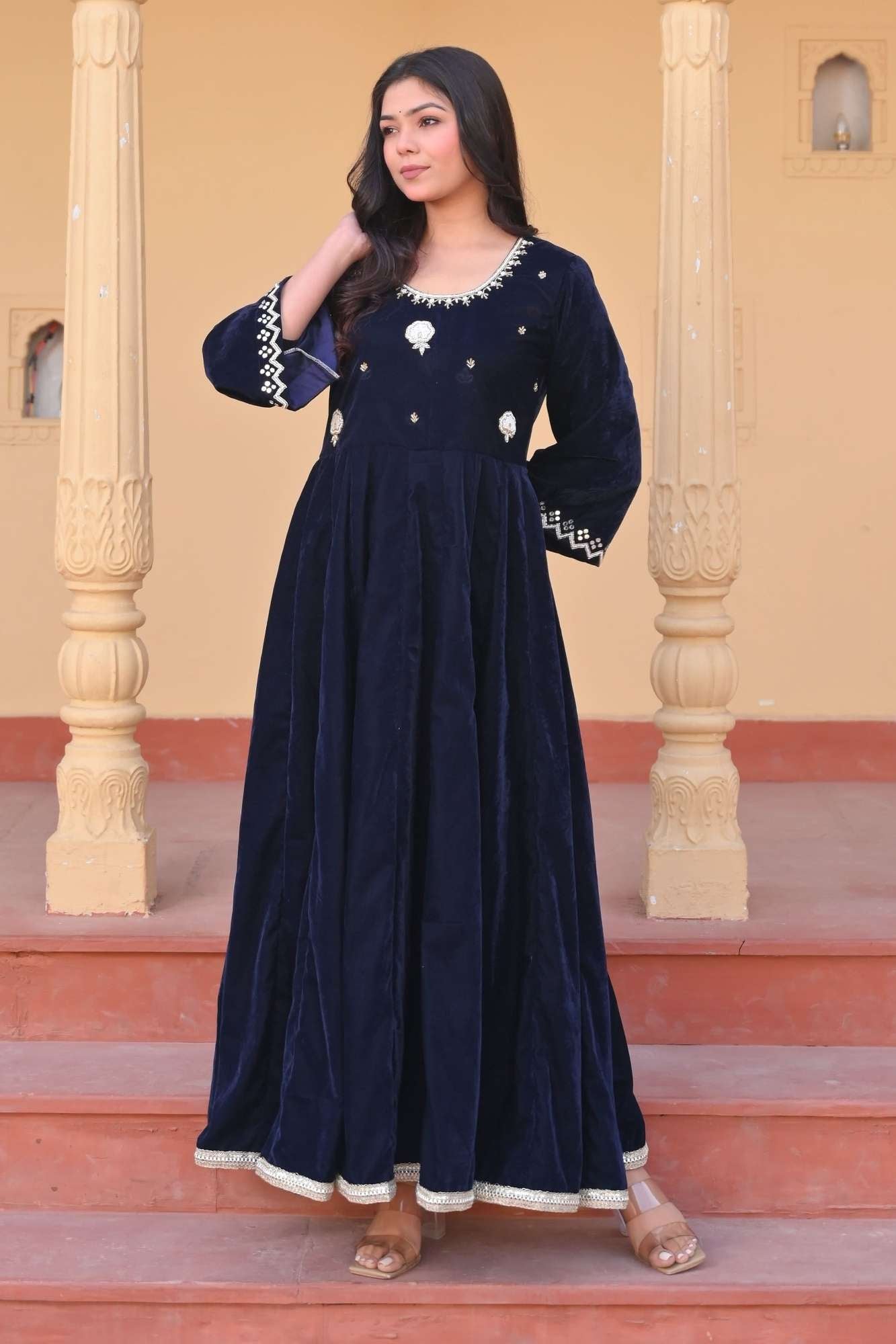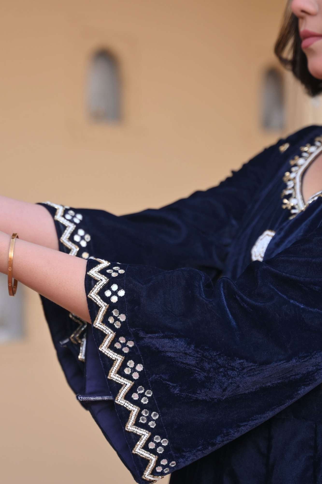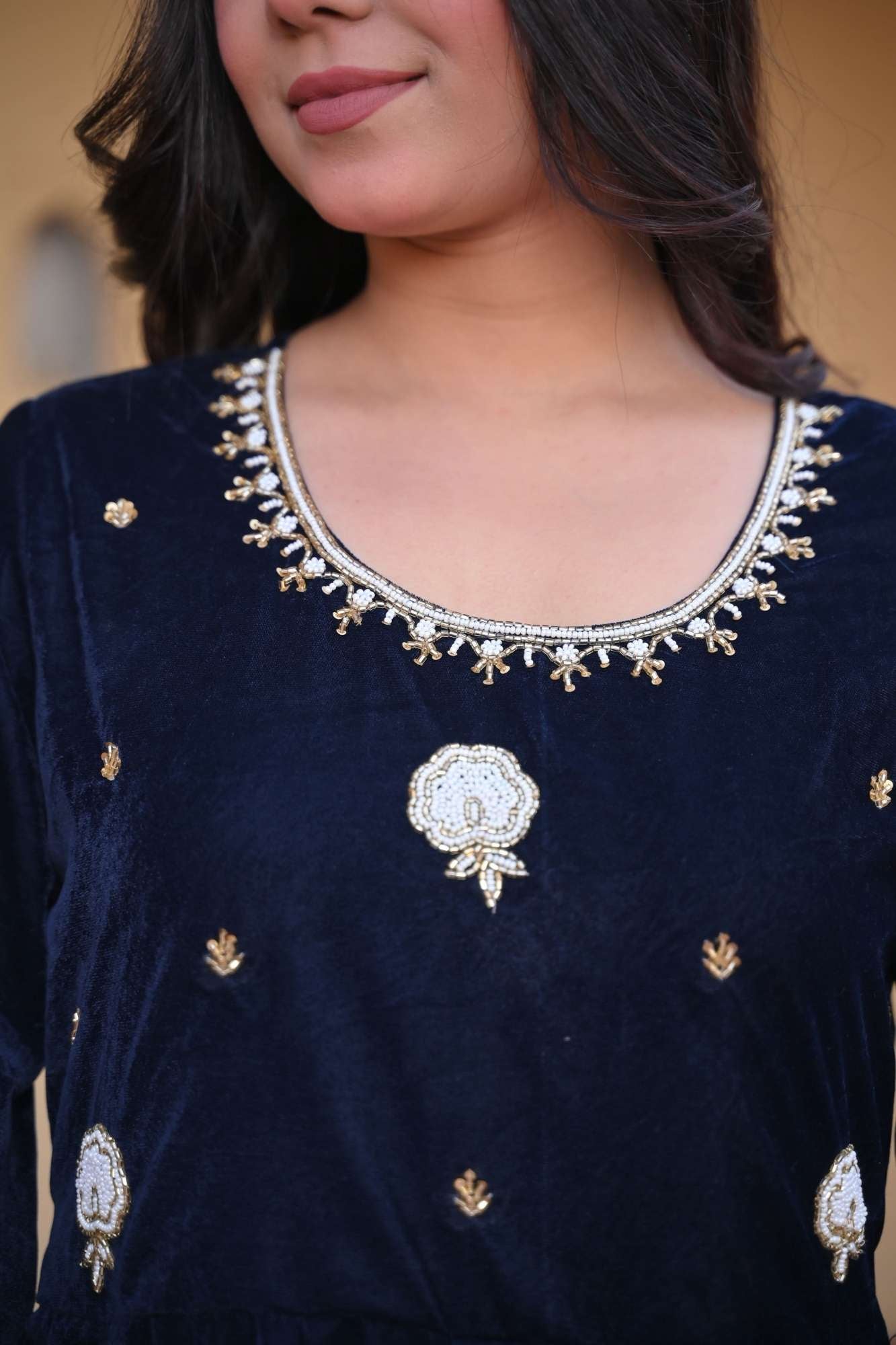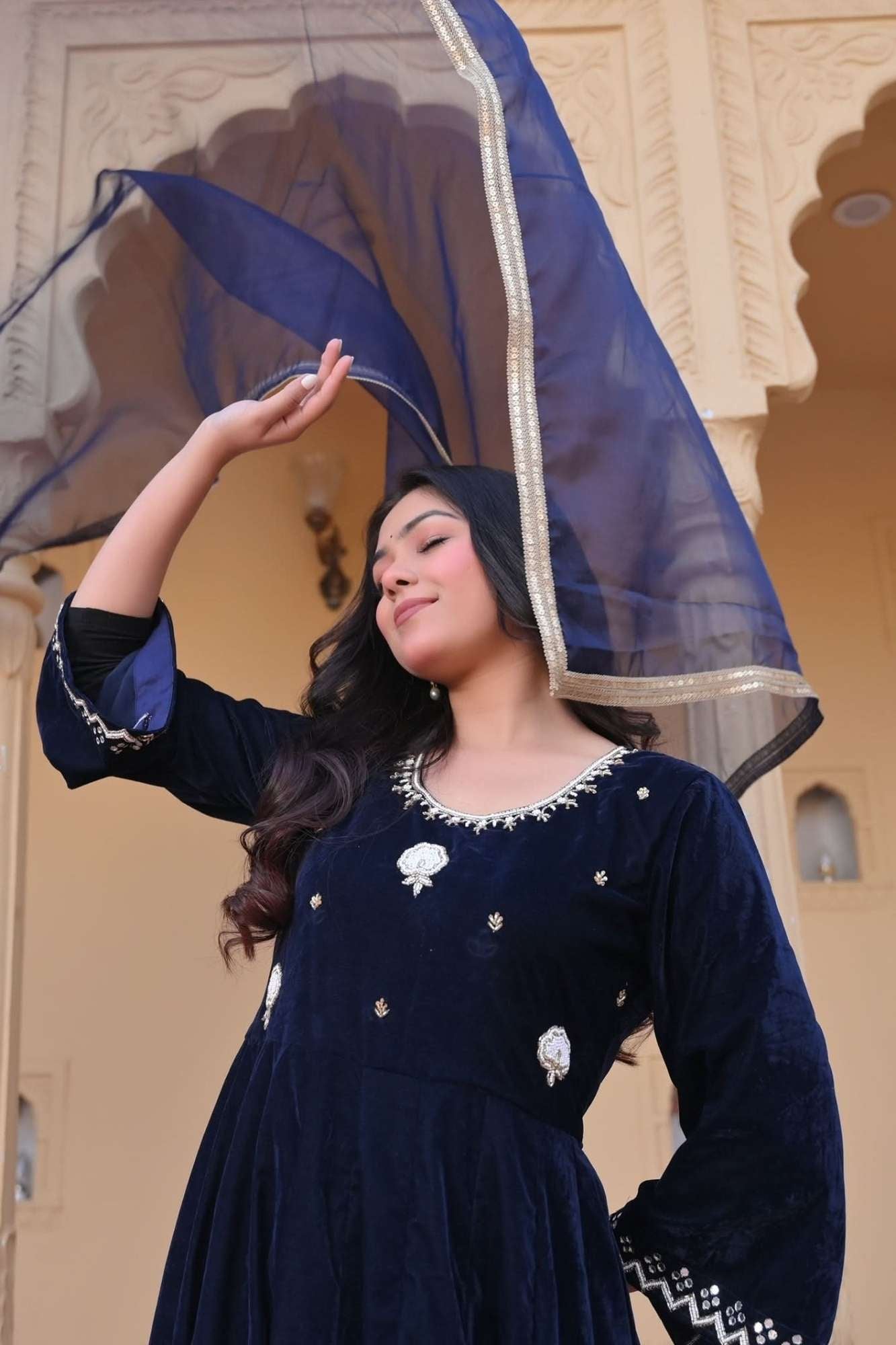 Midnight blue Nargis Velvet anarkali Set with Lace detailing border, 3 PIece Set | Made To Order
