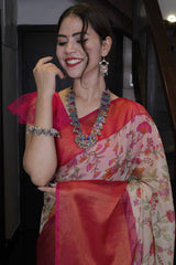 Moss Chiffon Floral Printed with Broad Woven Zari Border Wrap in 1 minute saree