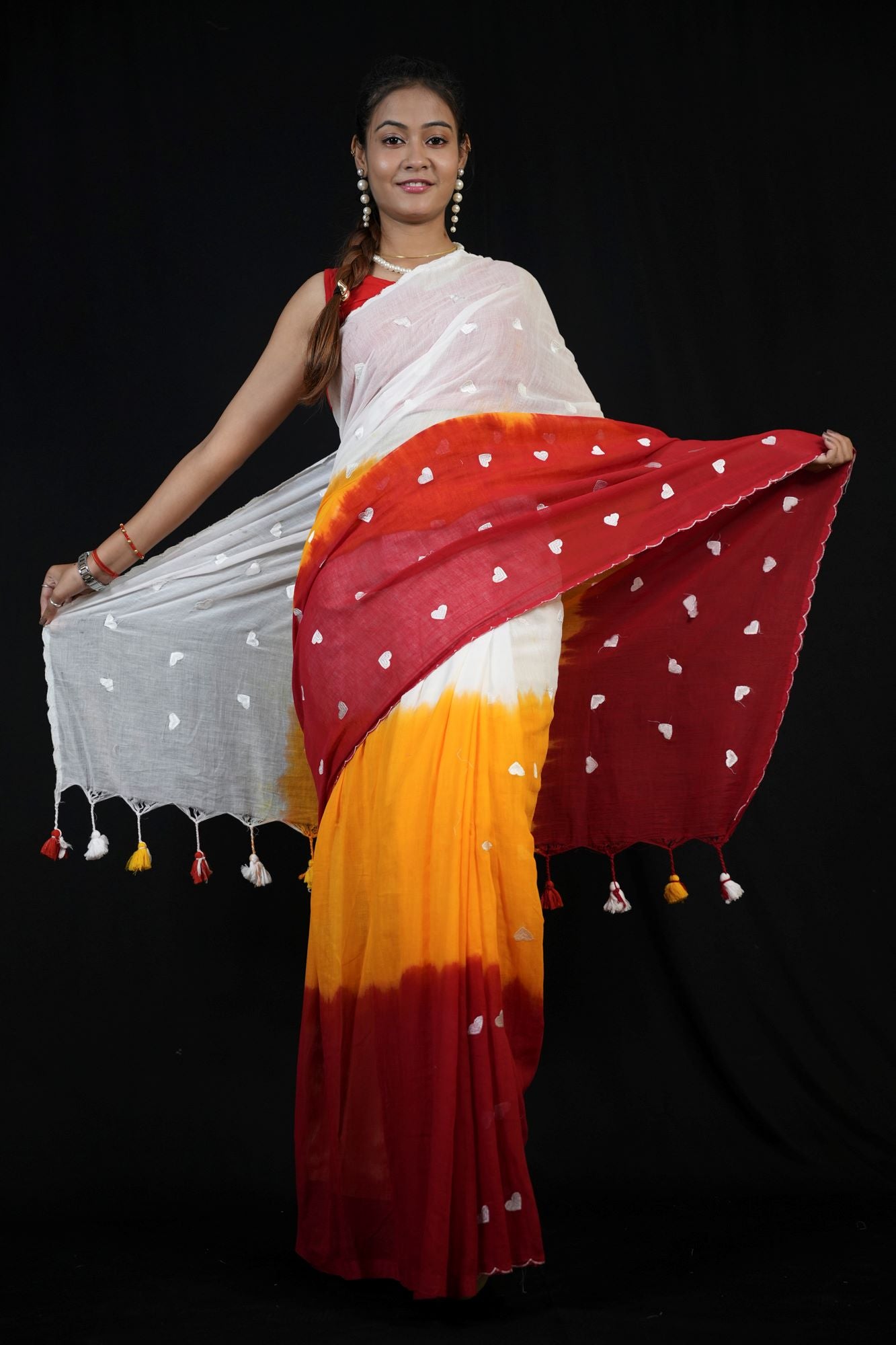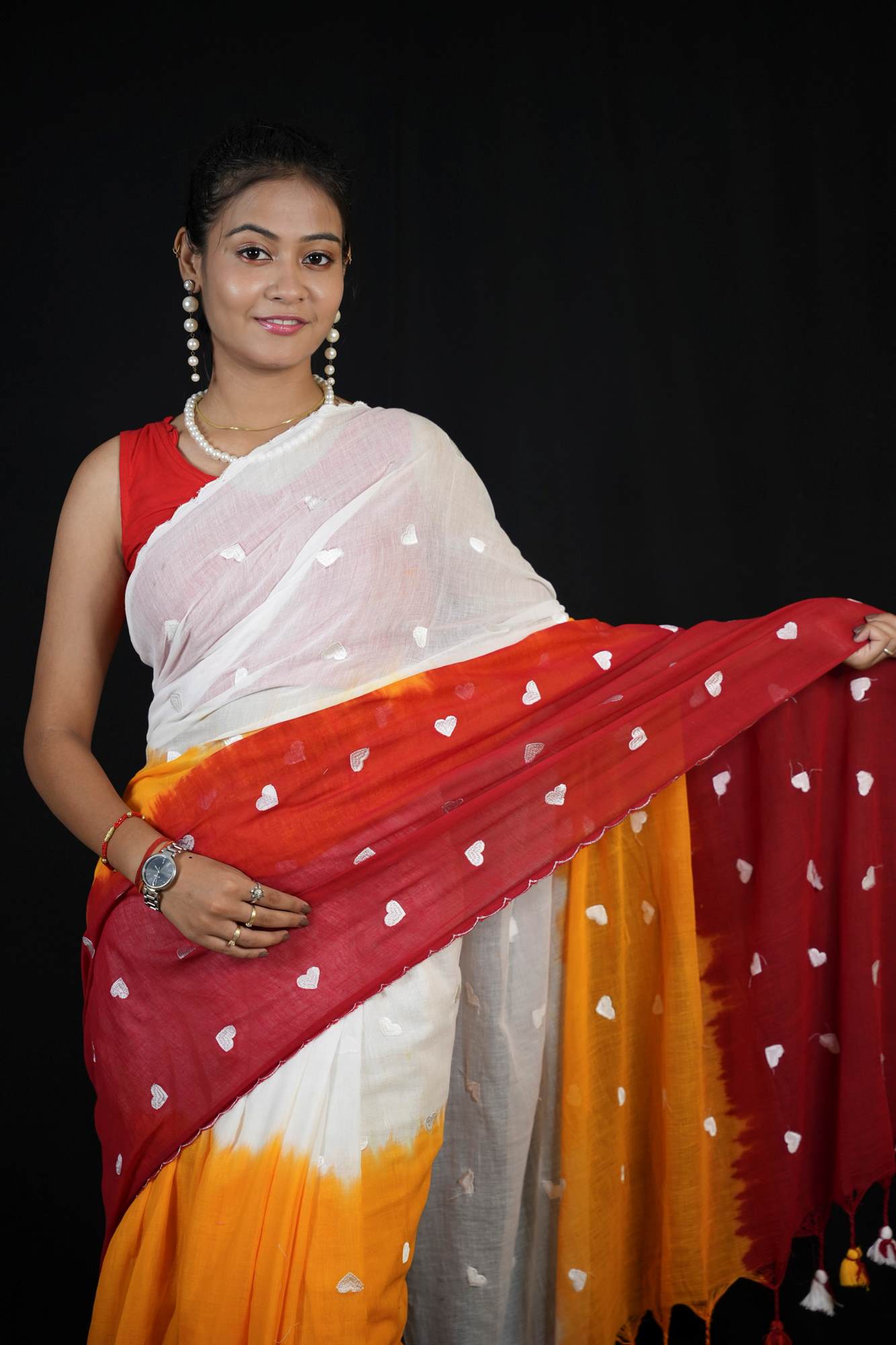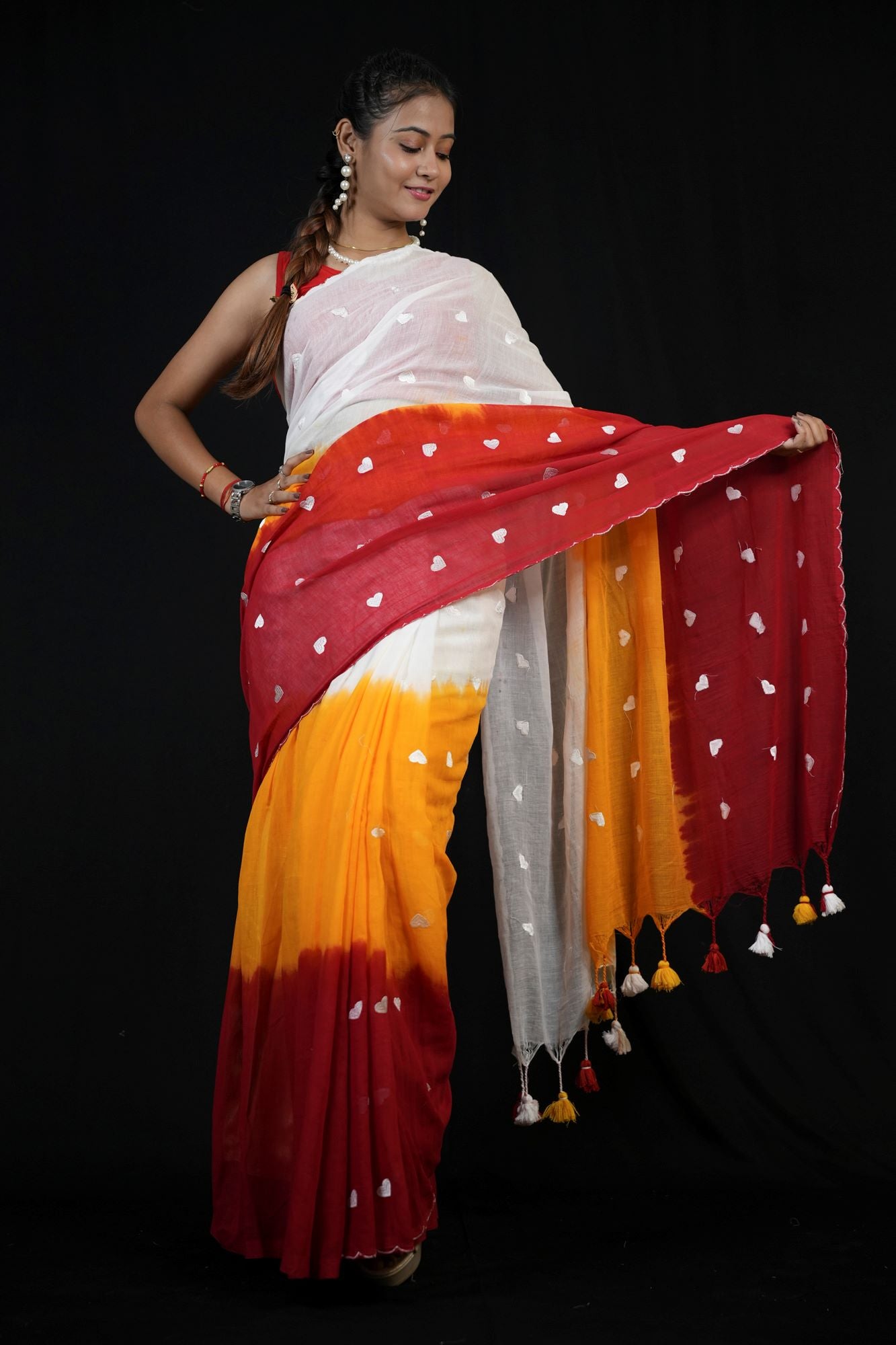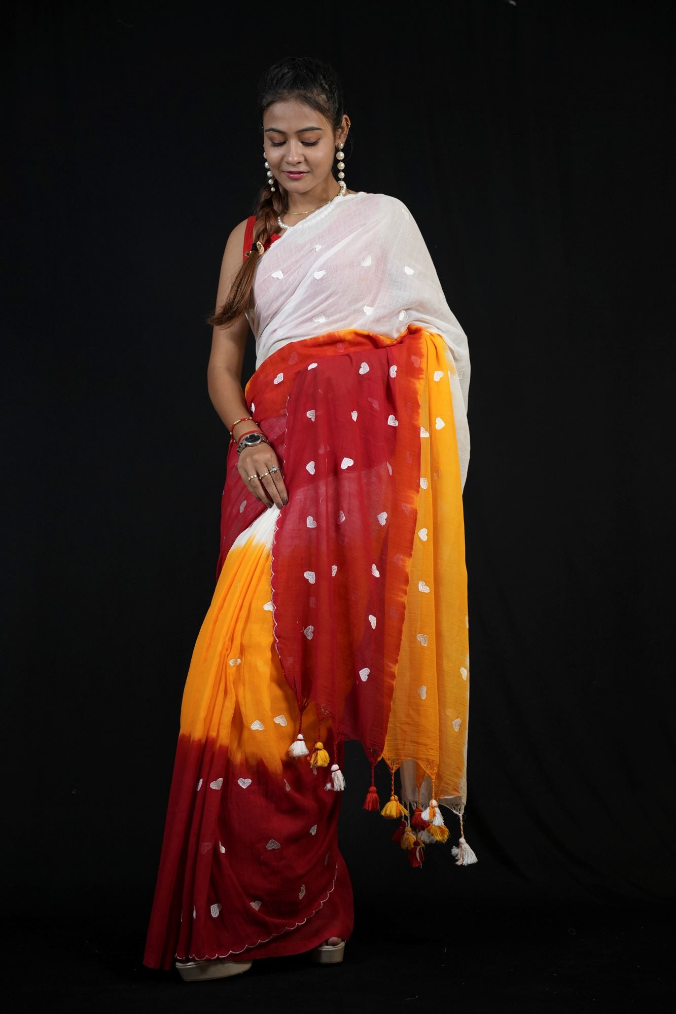 This vibrant Ready To Wear saree, crafted from premium mulmul cotton, exudes playful charm and breezy elegance. The design transitions beautifully from a soft ivory to a radiant saffron yellow and finally to a deep vermilion red, creating a stunning ombré effect. Scattered throughout are delicate white thread-embroidered heart motifs that lend a whimsical touch to the fabric. The scalloped edge along the red border adds refined detailing, while the multicolored tassels along the pallu infuse the piece with festive flair. Lightweight, breathable, and artfully designed, this saree is perfect for casual celebrations or daytime gatherings with a joyful spirit