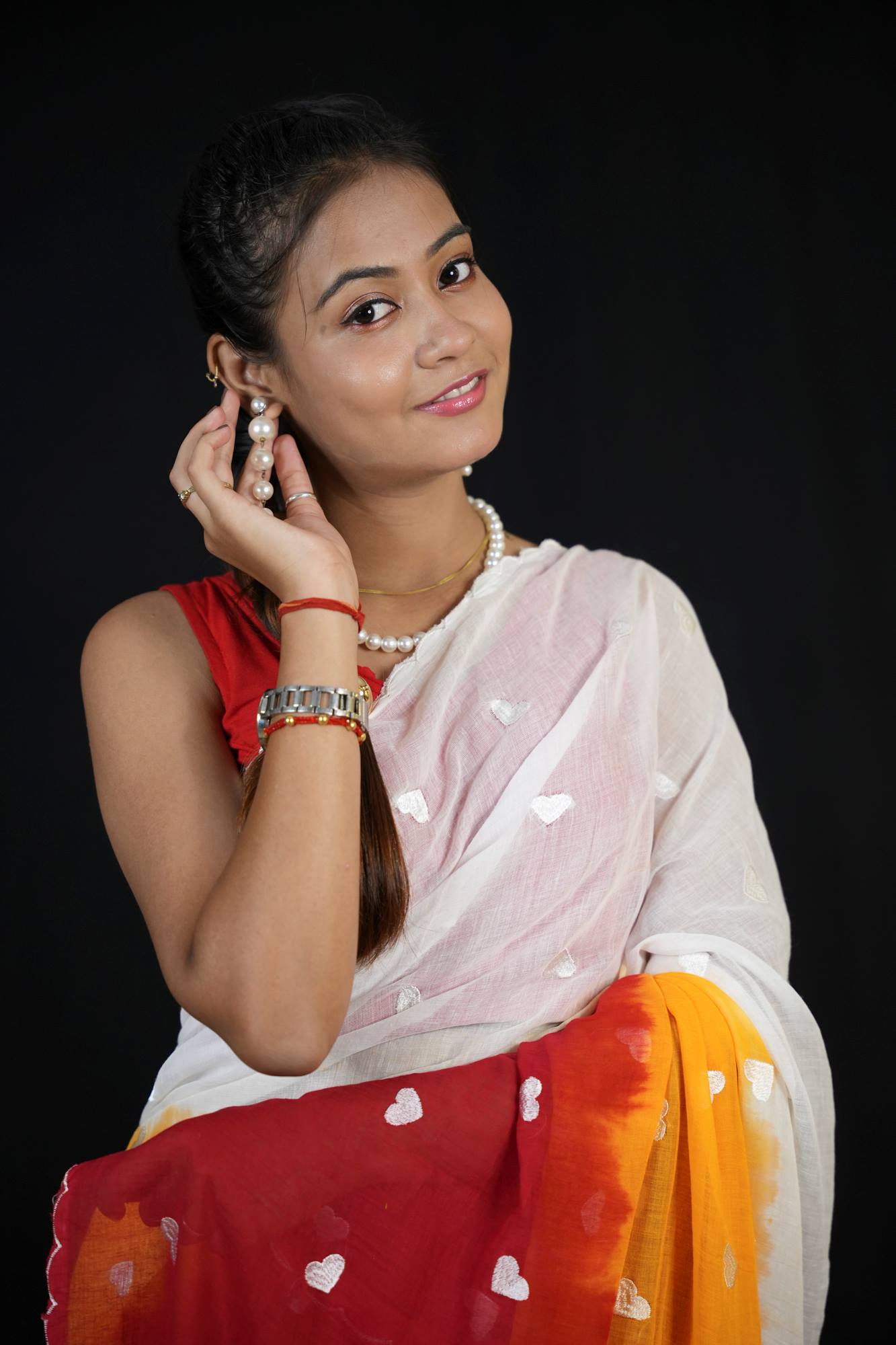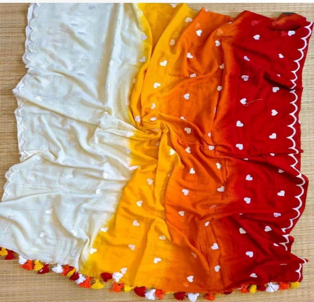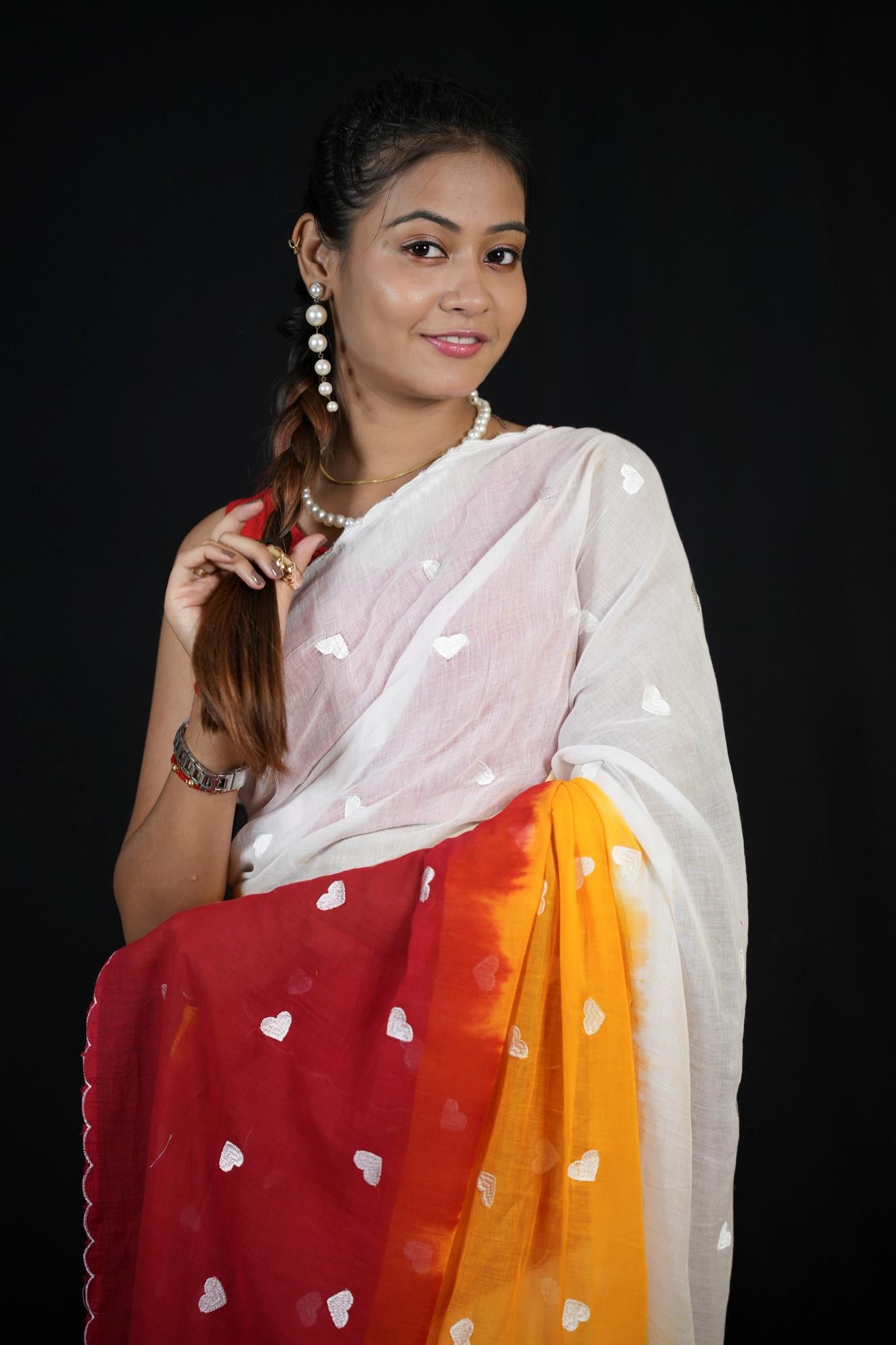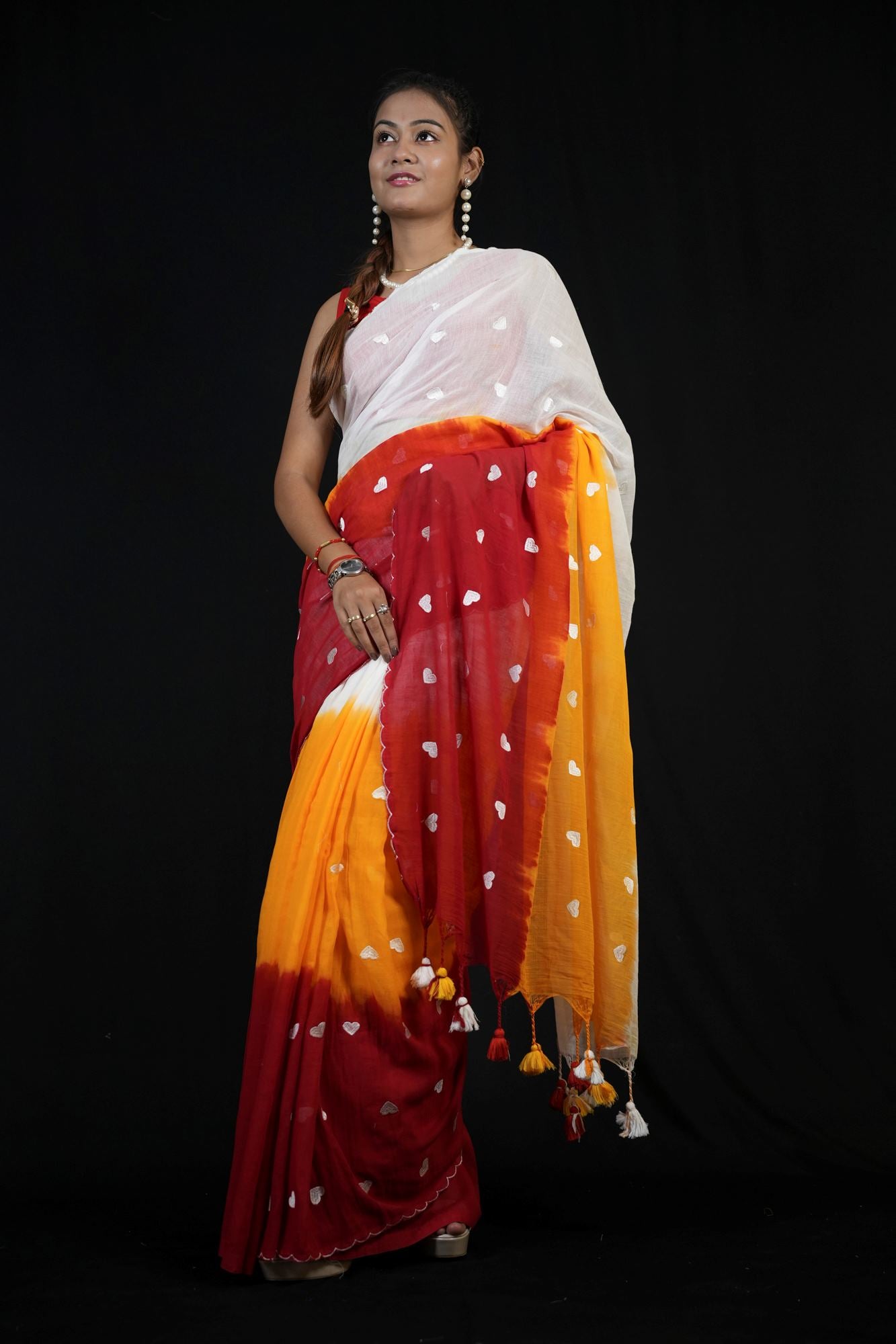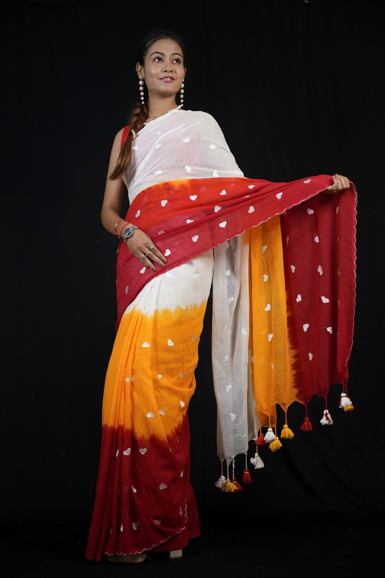 This vibrant Ready To Wear saree, crafted from premium mulmul cotton, exudes playful charm and breezy elegance. The design transitions beautifully from a soft ivory to a radiant saffron yellow and finally to a deep vermilion red, creating a stunning ombré effect. Scattered throughout are delicate white thread-embroidered heart motifs that lend a whimsical touch to the fabric. The scalloped edge along the red border adds refined detailing, while the multicolored tassels along the pallu infuse the piece with festive flair. Lightweight, breathable, and artfully designed, this saree is perfect for casual celebrations or daytime gatherings with a joyful spirit