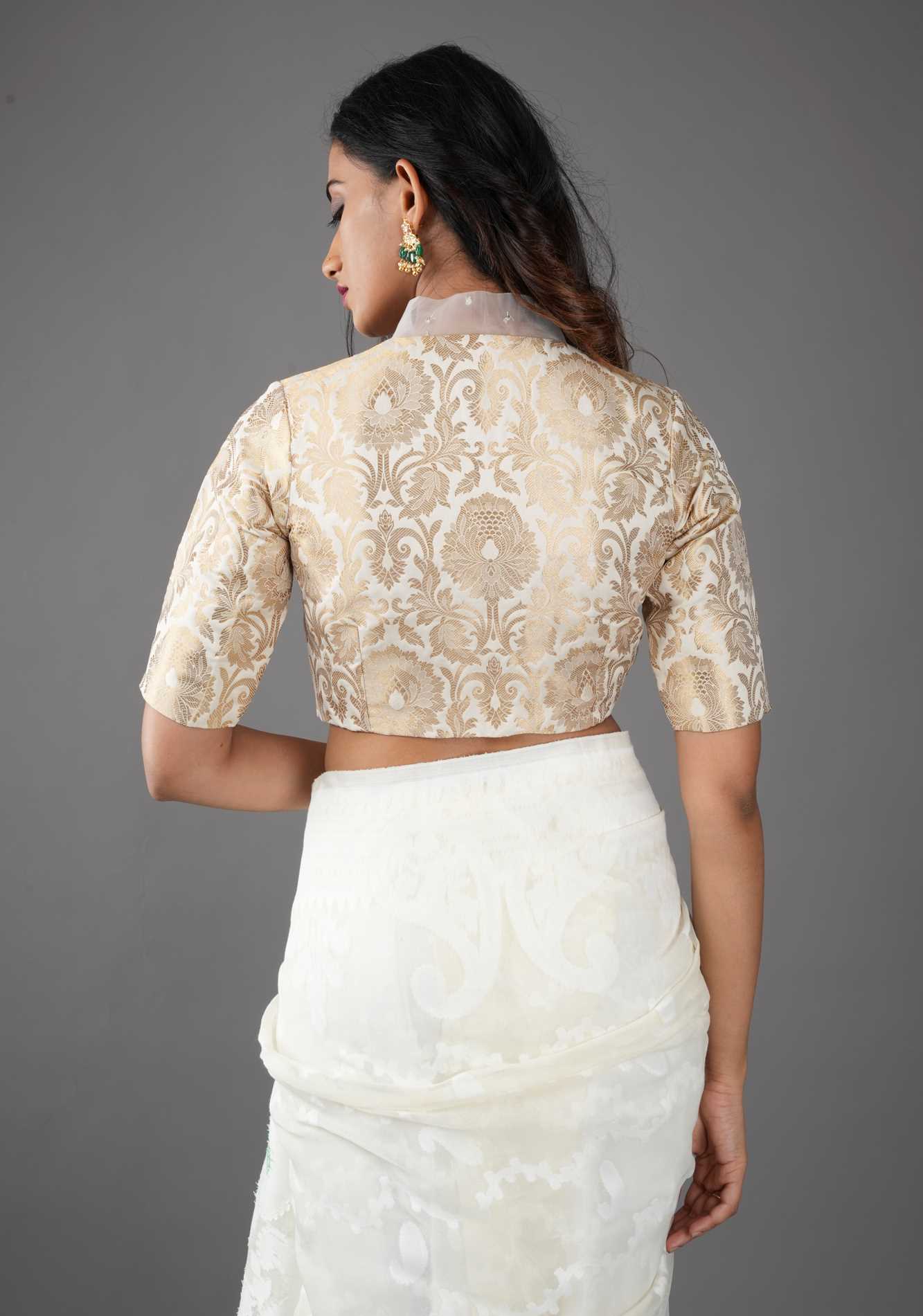 Indulge in the luxurious sophistication of our Off White Banarasi Brocade Blouse, featuring a delicate tie neck for a touch of elegance. Handcrafted and customizable, this blouse is a truly exclusive piece for the discerning fashion connoisseur. Elevate your wardrobe with our exquisite Off White Banarasi Brocade Blouse. Perfect for the fashion connoisseur seeking impeccable style and high-end quality.