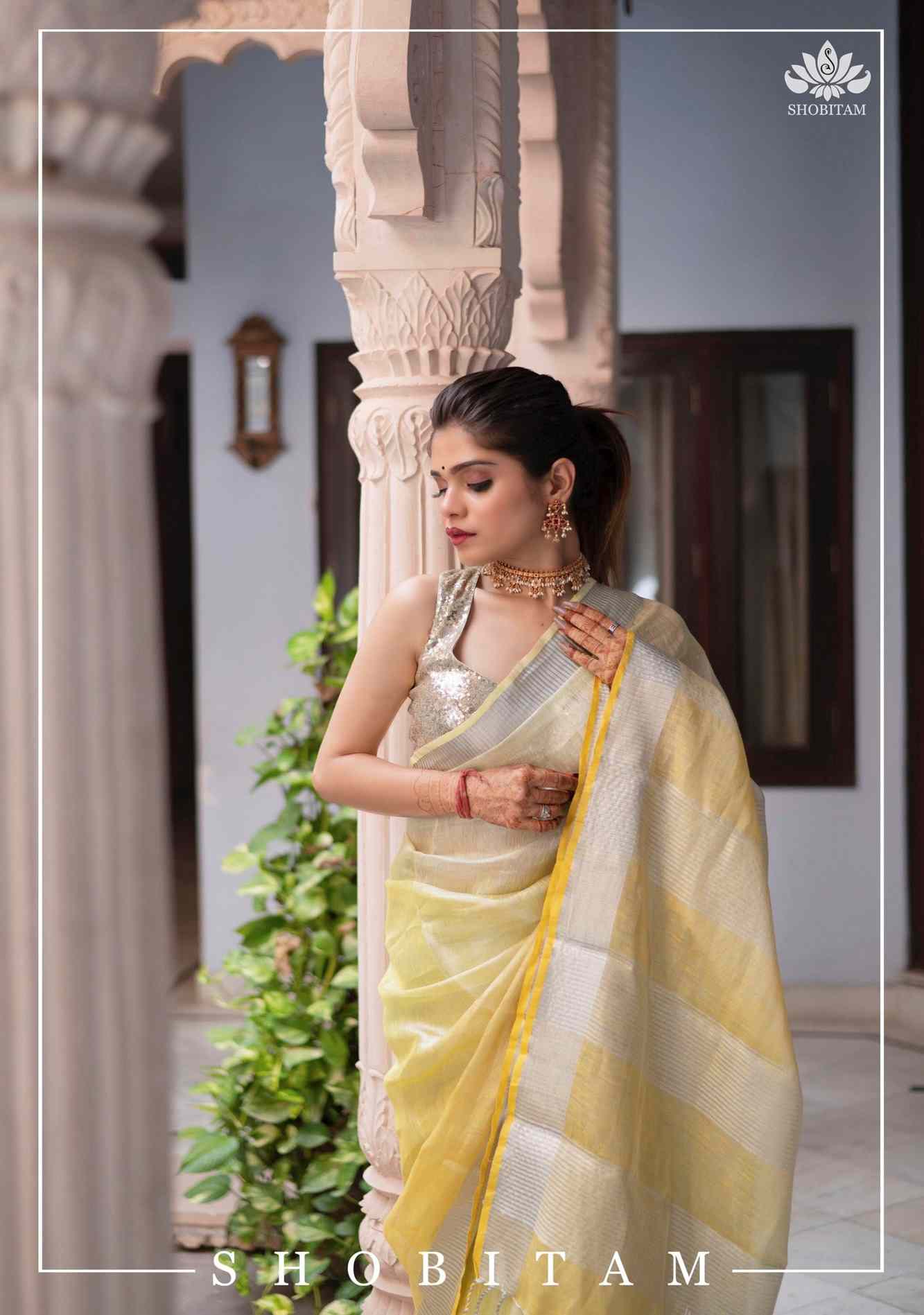 The golden Yellow flowers have been the subject of noteworthy poems! This pastel yellow Ombre tissue saree is inspired by these joyous flowers.