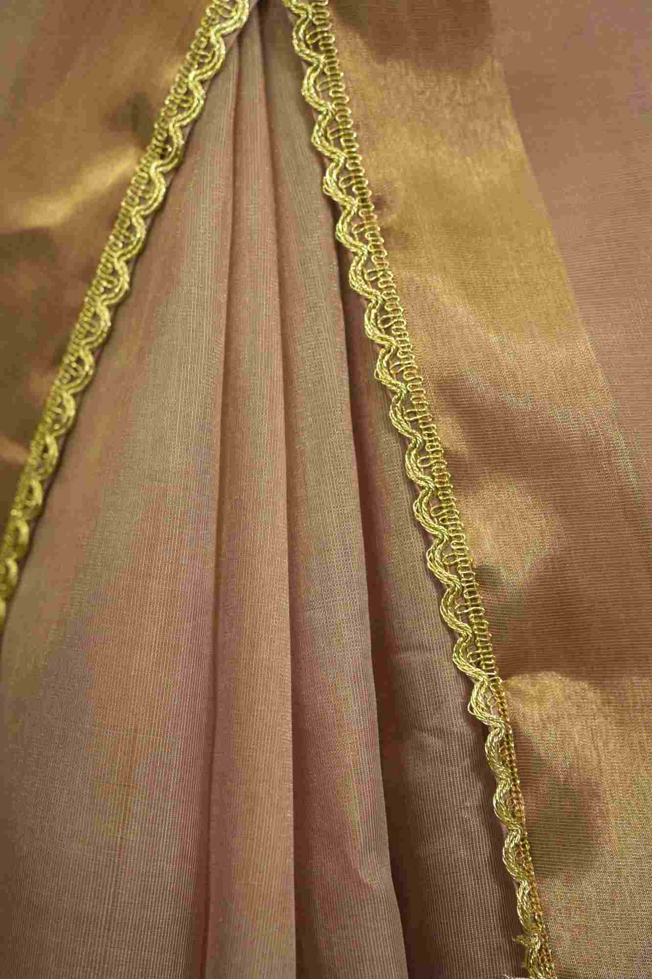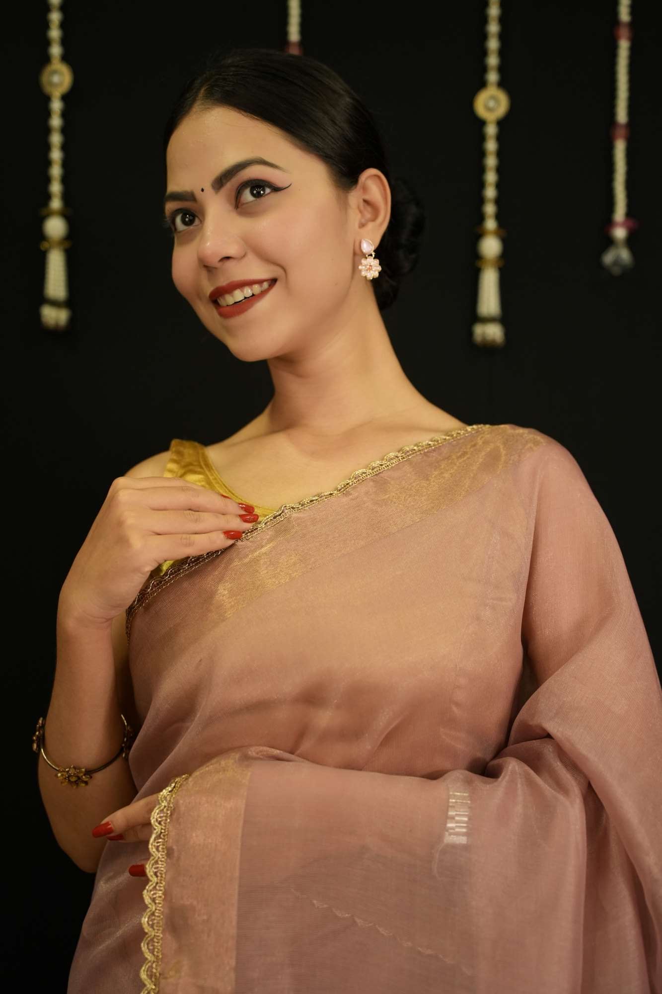 Onion Pink Soft chiffon silk Fabric With Zari Weave Border And Golden Zari Piping Lace Pre Drape Saree