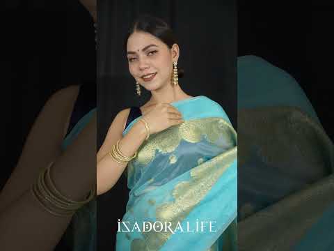 This Banarasi silk organza Ready to wear saree is a stunning combination of tradition and elegance, featuring a skyblue adorned with intricate golden zari weaving. The lightweight, sheer fabric offers a slightly stiff texture for a structured drape. With a beautiful zari border, circular motifs, and an ornate pallu, this saree is perfect for weddings, festivals, and special events. Its breathable nature ensures comfort while exuding opulence and style.
