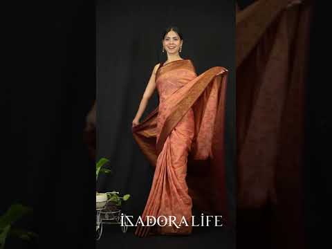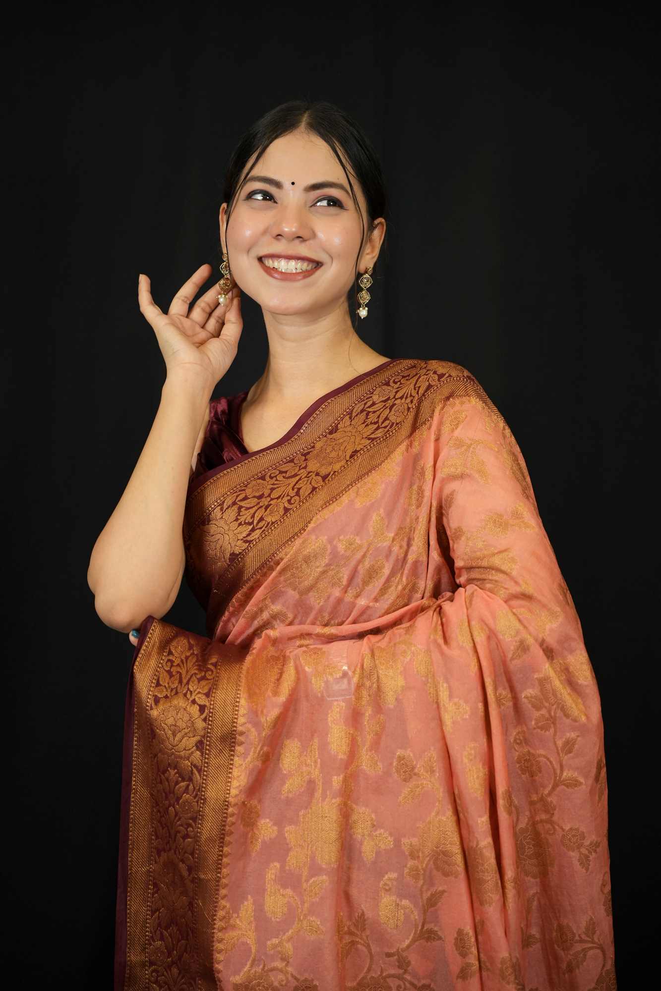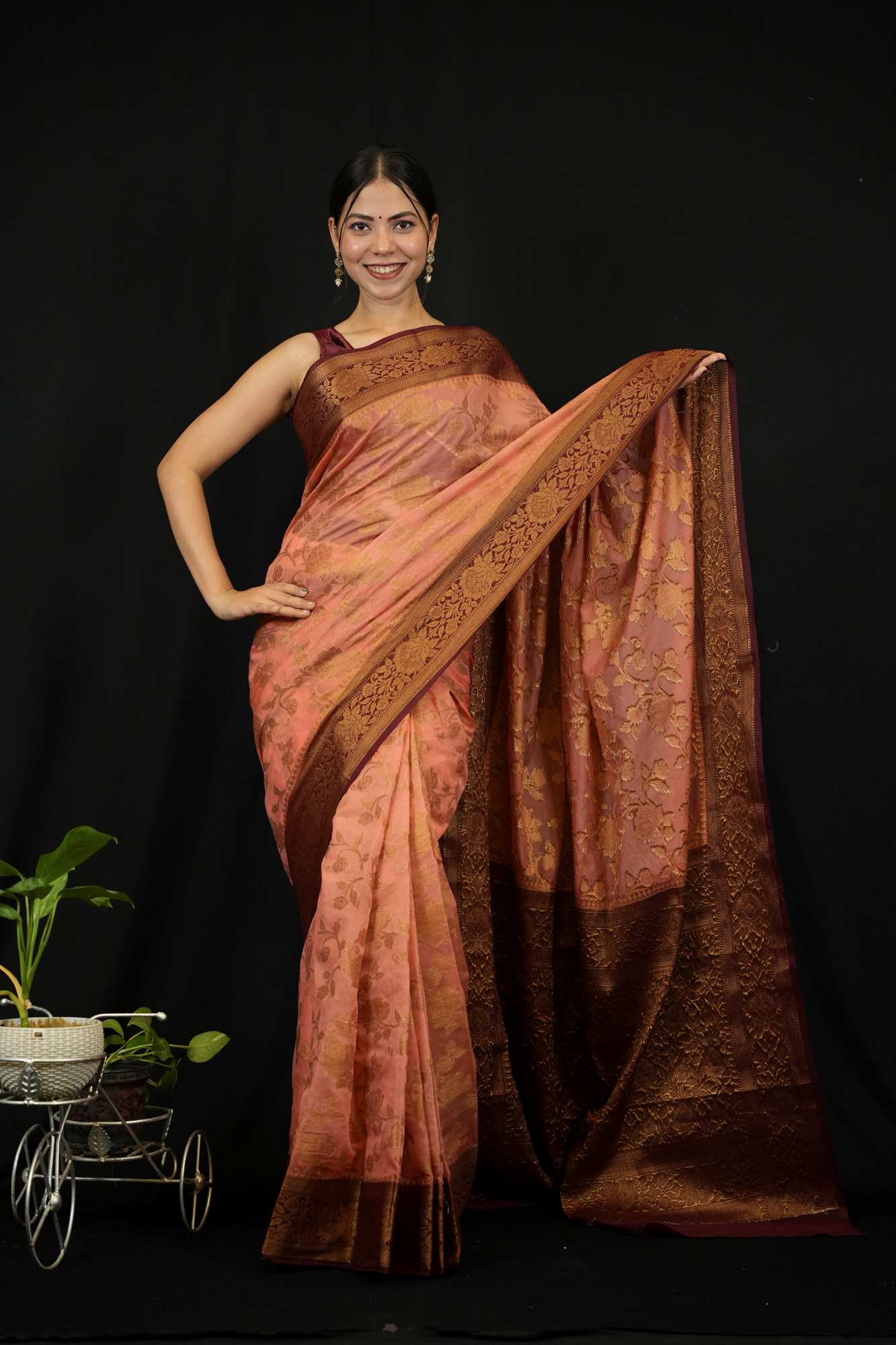Peach Floral Zari Jaal Weaving Banarasi With Contrast Border and Ornate Palla Georgette Silk Pre Drape Saree