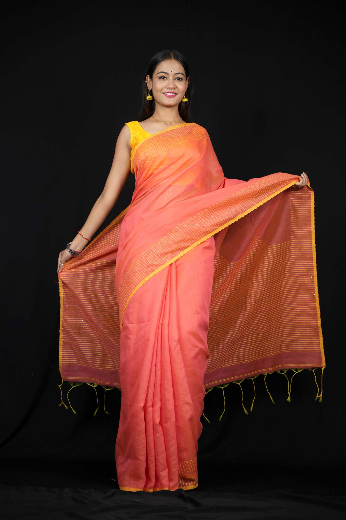 Peach & Yellow Cotton with Subtle Thread Work and Tassel Detailing Ready To wear Saree