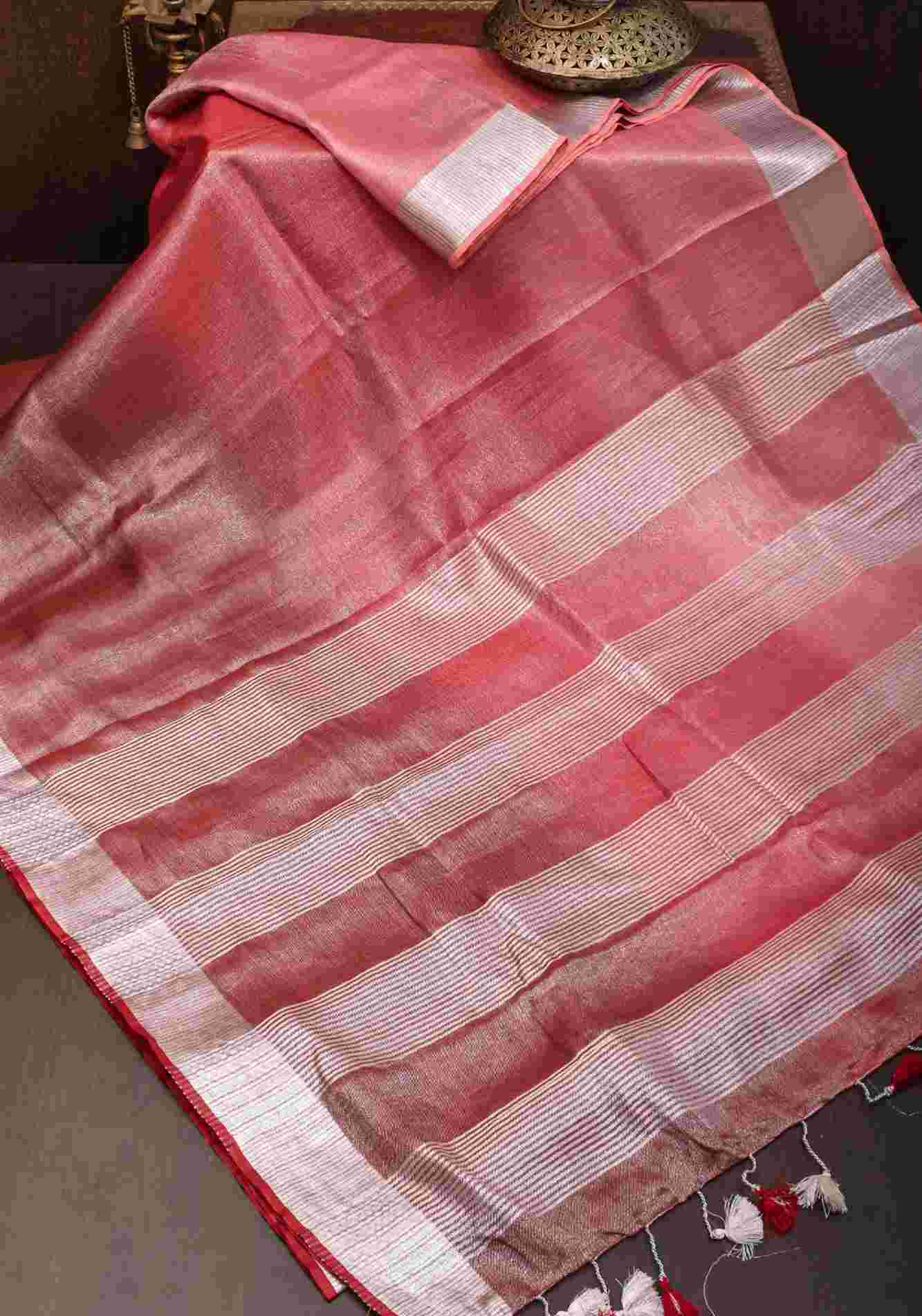 Pomegranate Ombre Tissue Linen Ready To Wear Saree with Silver Ribbed Borders