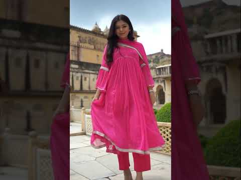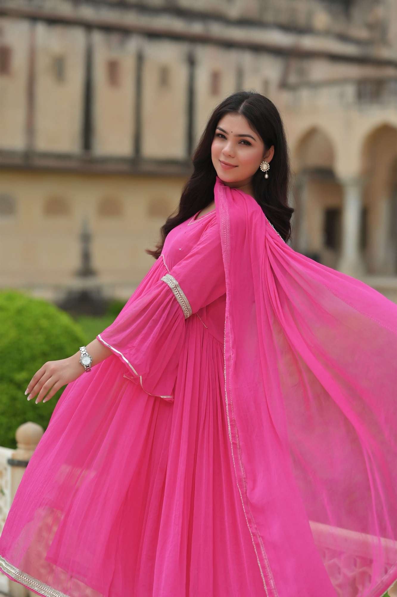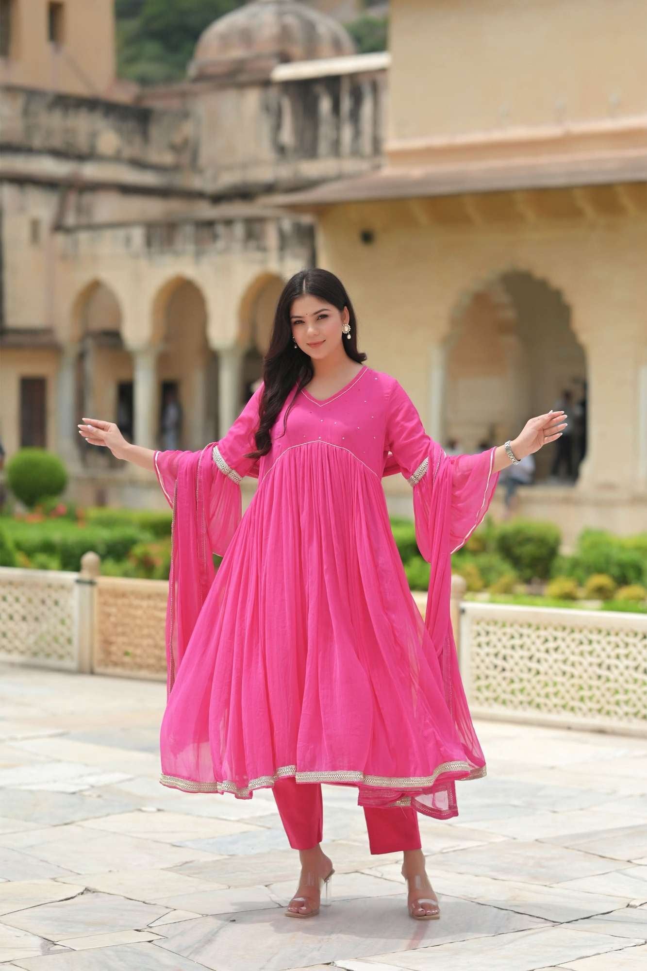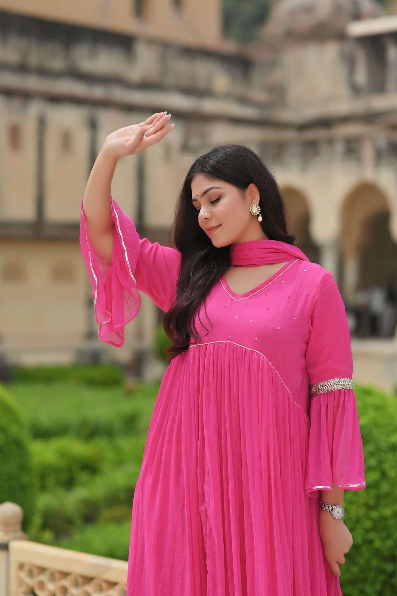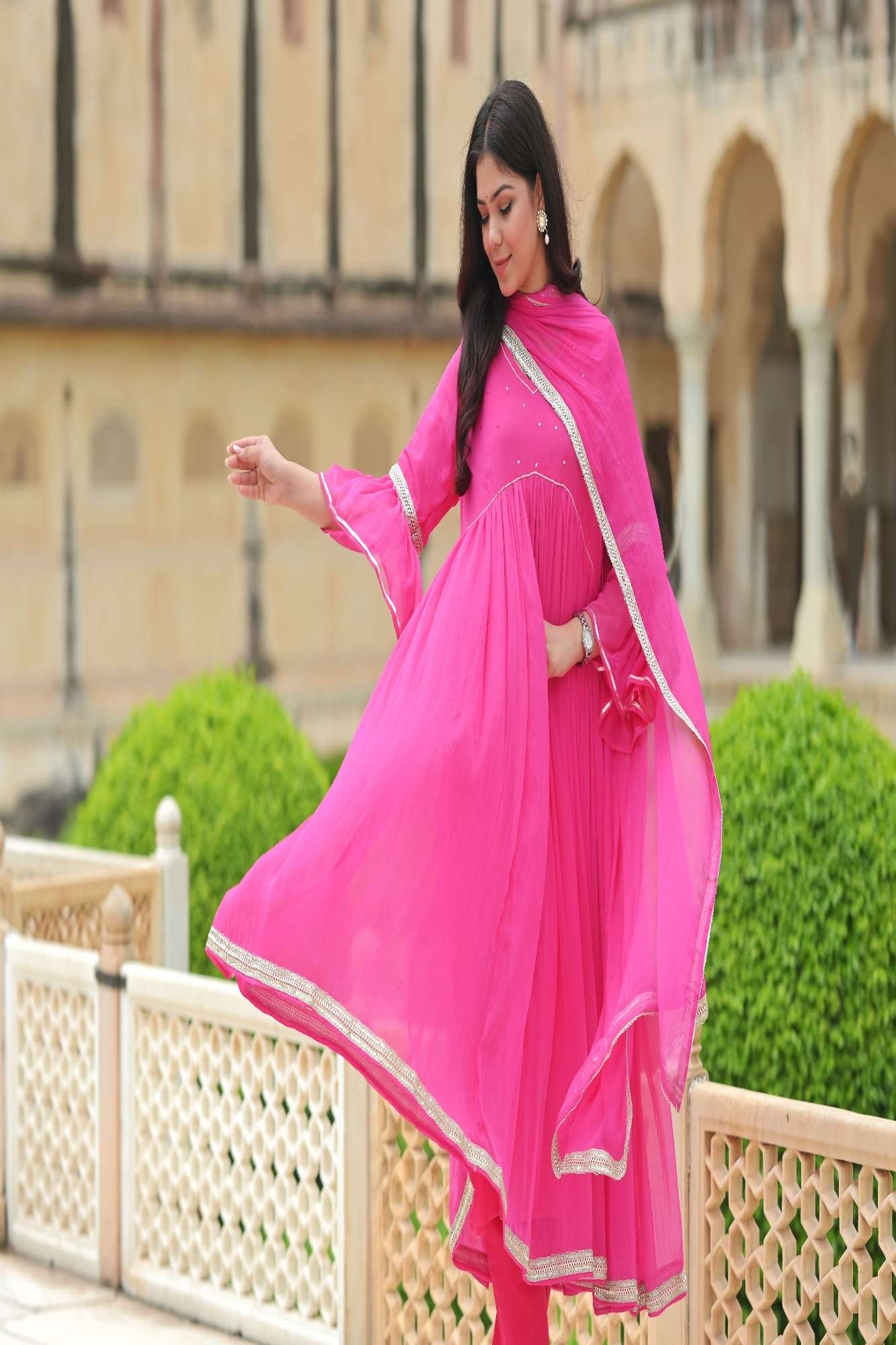 Unveil the perfect harmony of bold and vibrant hues in our Raani love Anarkali Suit Set, a fashion spectacle that's ready to steal the spotlight! The bright pink Anarkali with pleated frill sleeves is a fiery expression of your style spirit, while the gota laces add a playful twist. With a V-neck adorned with dazzling gotta work, this ensemble is your secret formula for making statements.