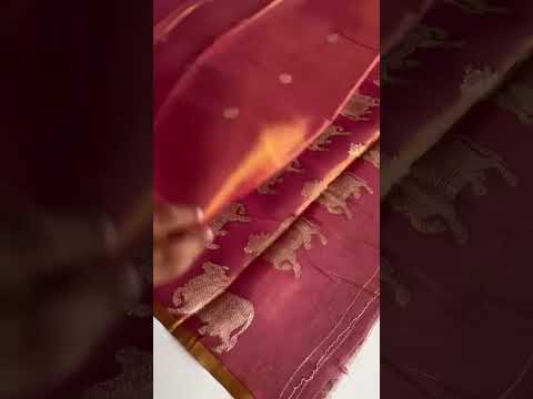 This Ready To Wear zari tissue Saree, radiates traditional charm in a rich rani pink hue. Adorned with intricately woven Nandi (sacred bull) motifs across the body in shimmering gold zari, it exudes spiritual grace and cultural heritage. The saree features a subtle golden border that enhances its opulent texture, while the sheer tissue fabric ensures a graceful, fluid drape. Ideal for temple visits, festive rituals, and cultural gatherings, this saree beautifully blends devotion with artisanal finesse