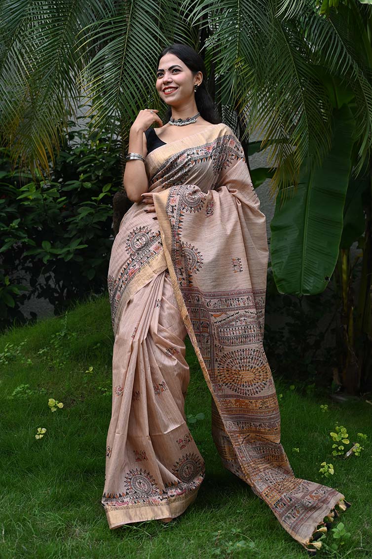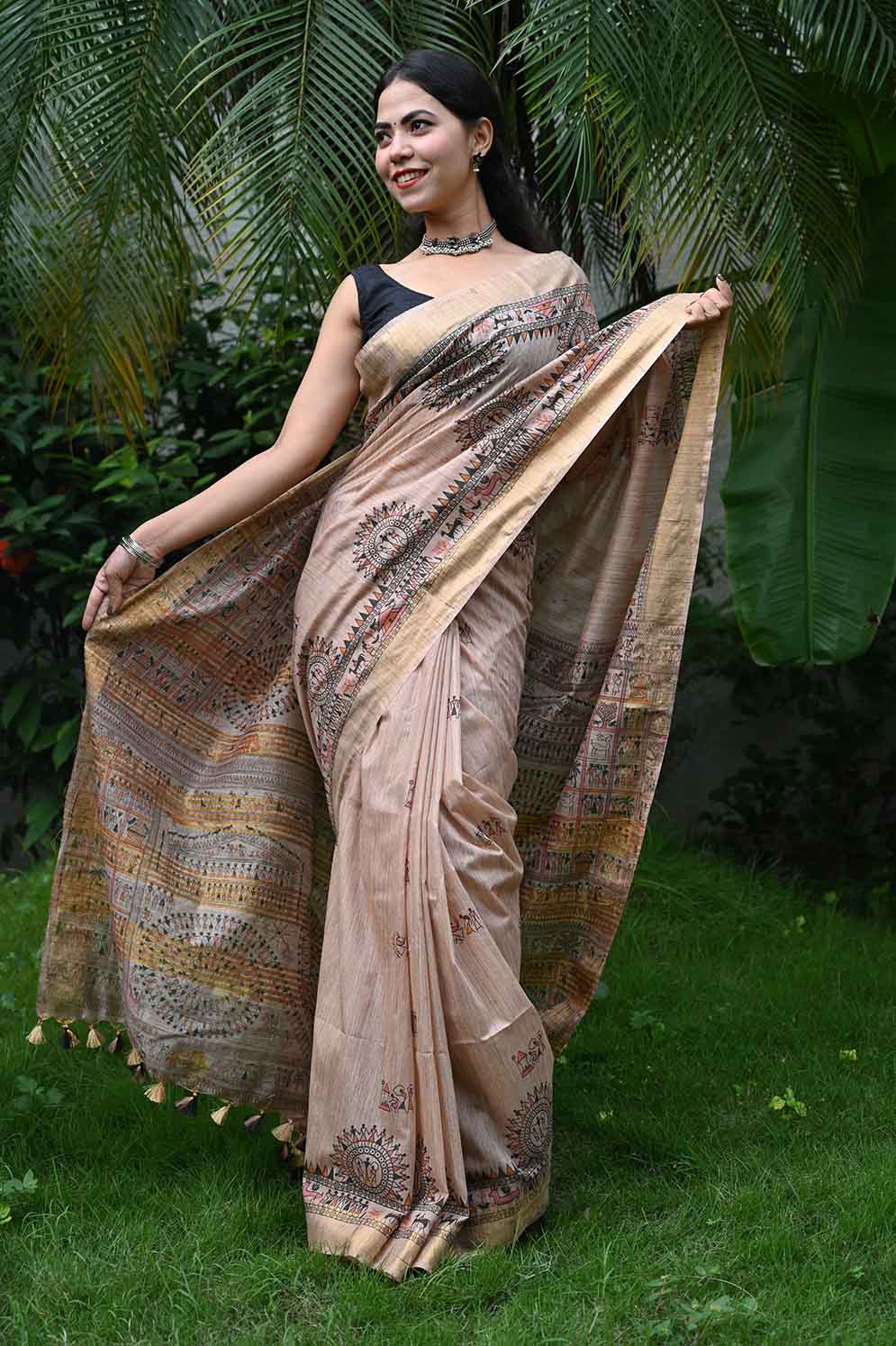 Ready To Wear Beautiful Beige Madhubani Artwork With Tassels On Pallu Wrap in 1 minute saree