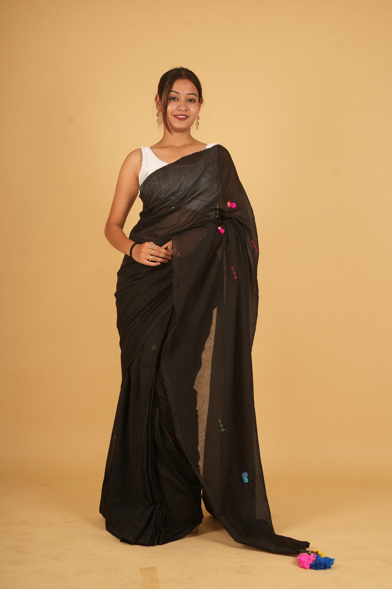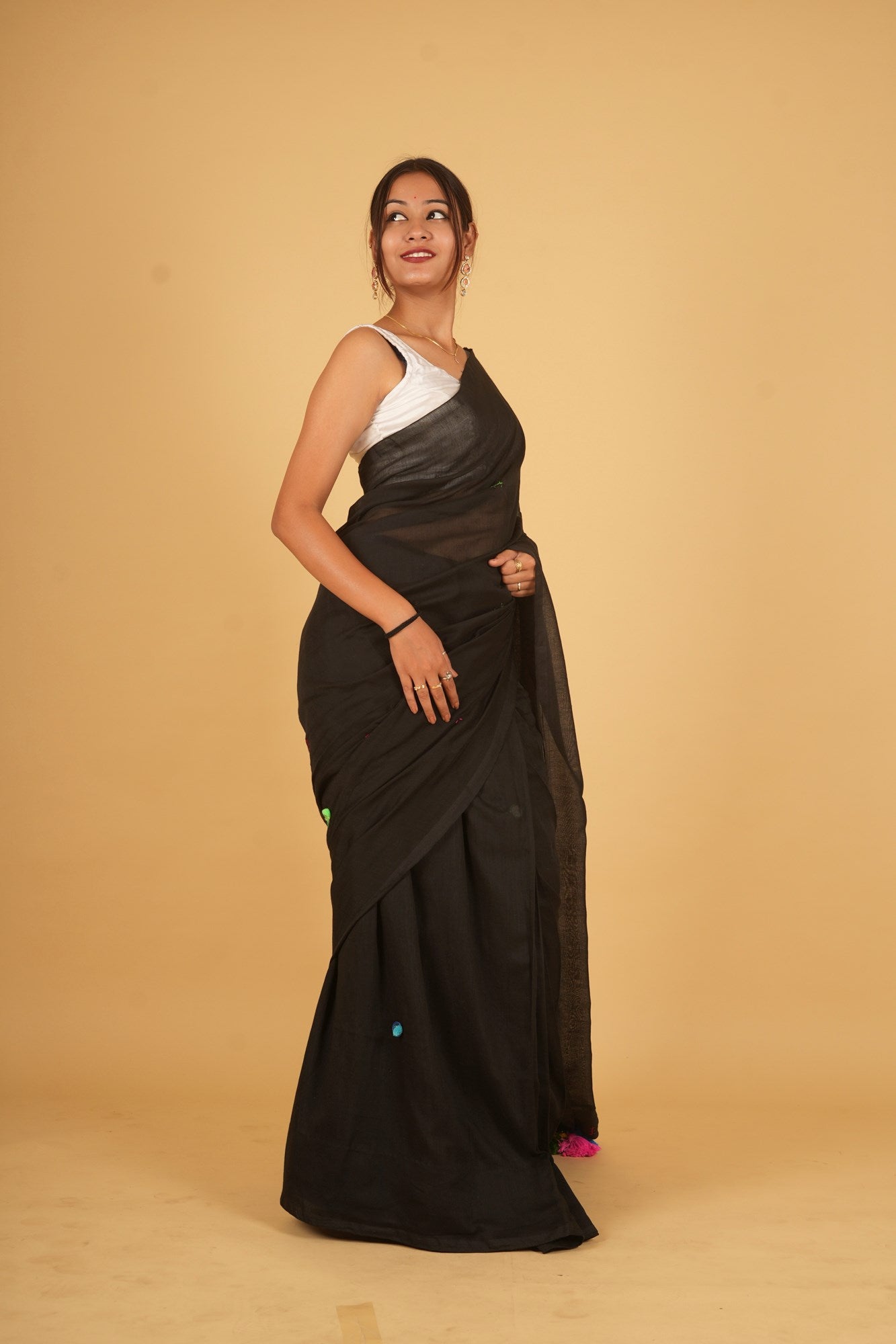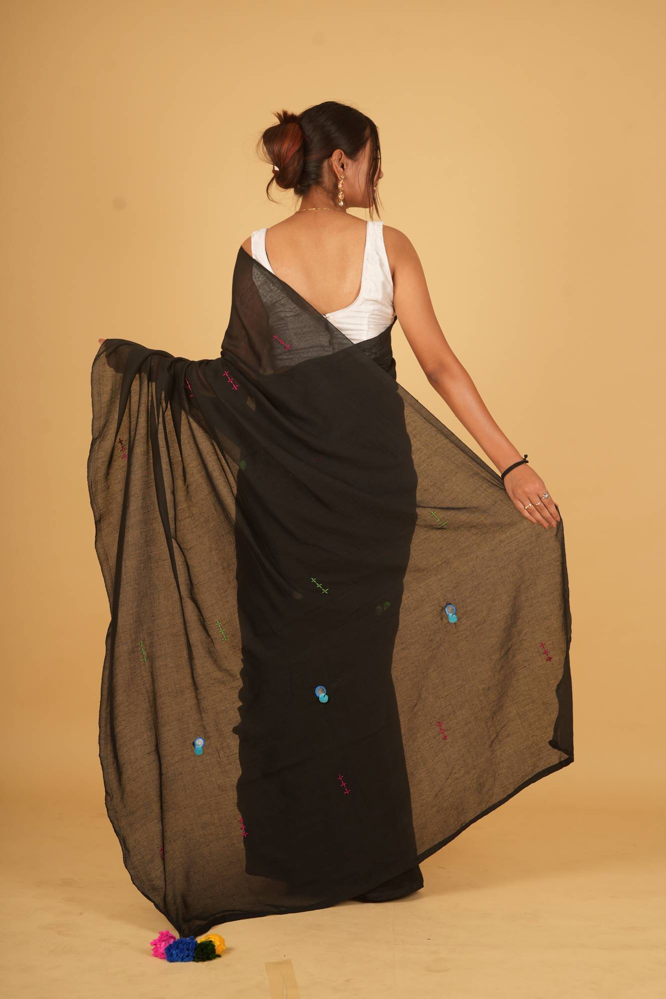 Ready to wear Beautiful Black saree in Mulmul with mirror work motifs inspired by the Rabari embroidery