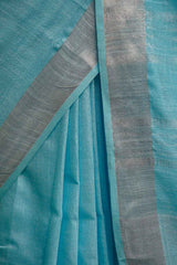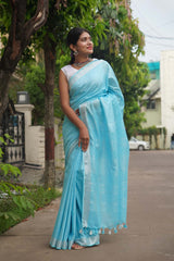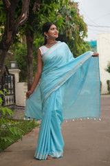 Ready To Wear Sky Blue Sophisticated Bhagalpuri cotton with Tassels on Pallu Wrap in 1 minute saree