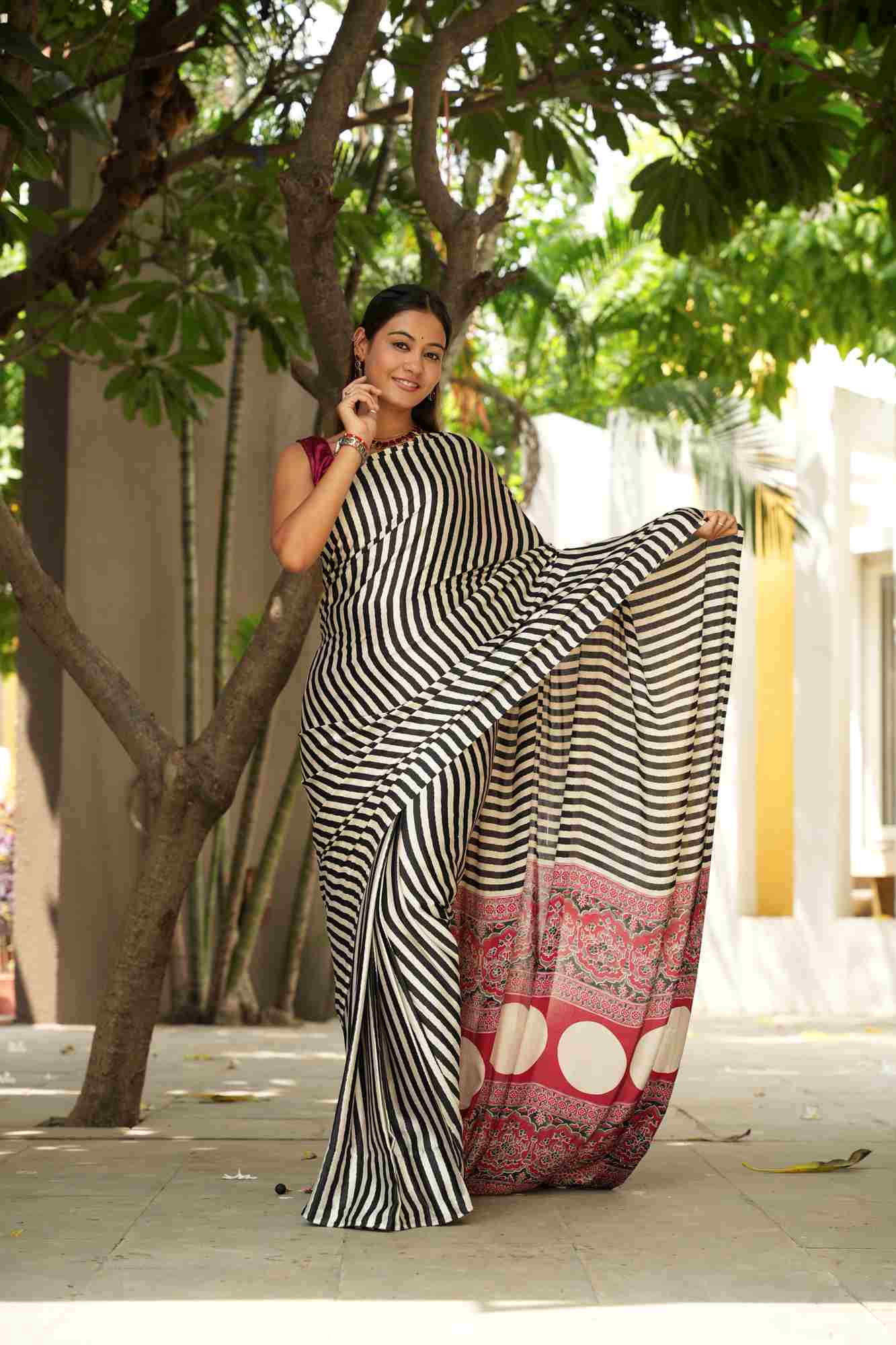 Soft Silk Striped with Ajrakh Hand Block Printed Ready To Wear Saree