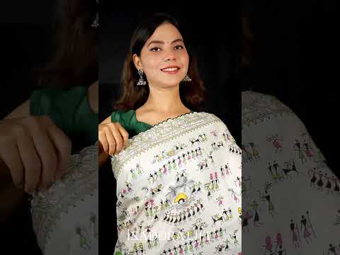 This white Ready To Wear saree showcases the rich texture and subtle gold sheen characteristic of the fabric. It is adorned with a striking tribal print, likely inspired by traditional Warli art from Maharashtra, featuring motifs of human figures, animals, and trees. These symbolic illustrations, known for their simple geometric shapes, reflect scenes from daily life and nature. A decorative border enhances the visual appeal, while a matching blouse piece completes the ensemble. This saree beautifully blends the elegance of Tussar silk with the cultural depth of indigenous Indian artistry, making it an eye-catching choice for cultural events and festive occasions.