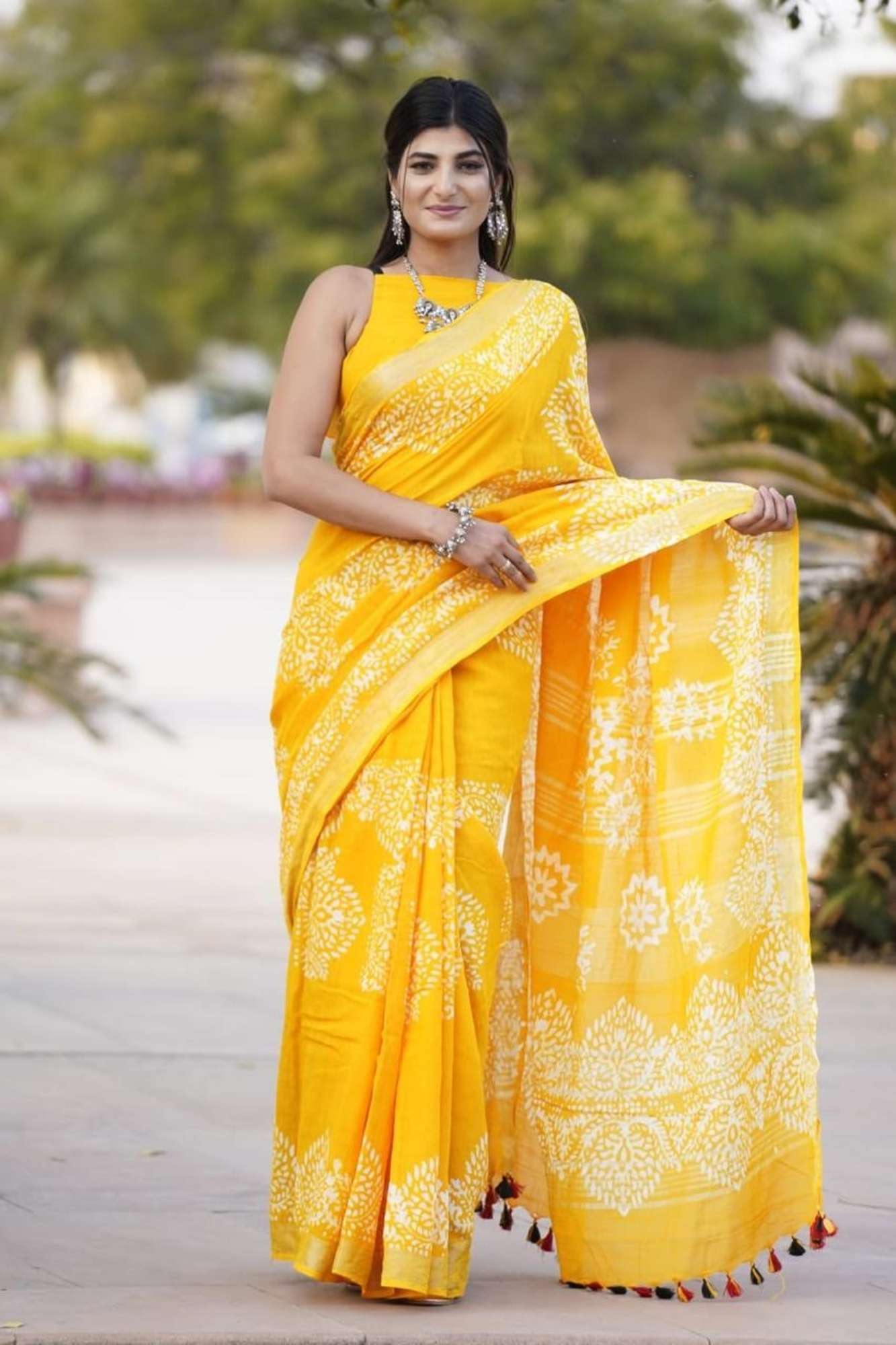 Yellow Jaipuri Print Linen Cotton Ready to Wear Saree