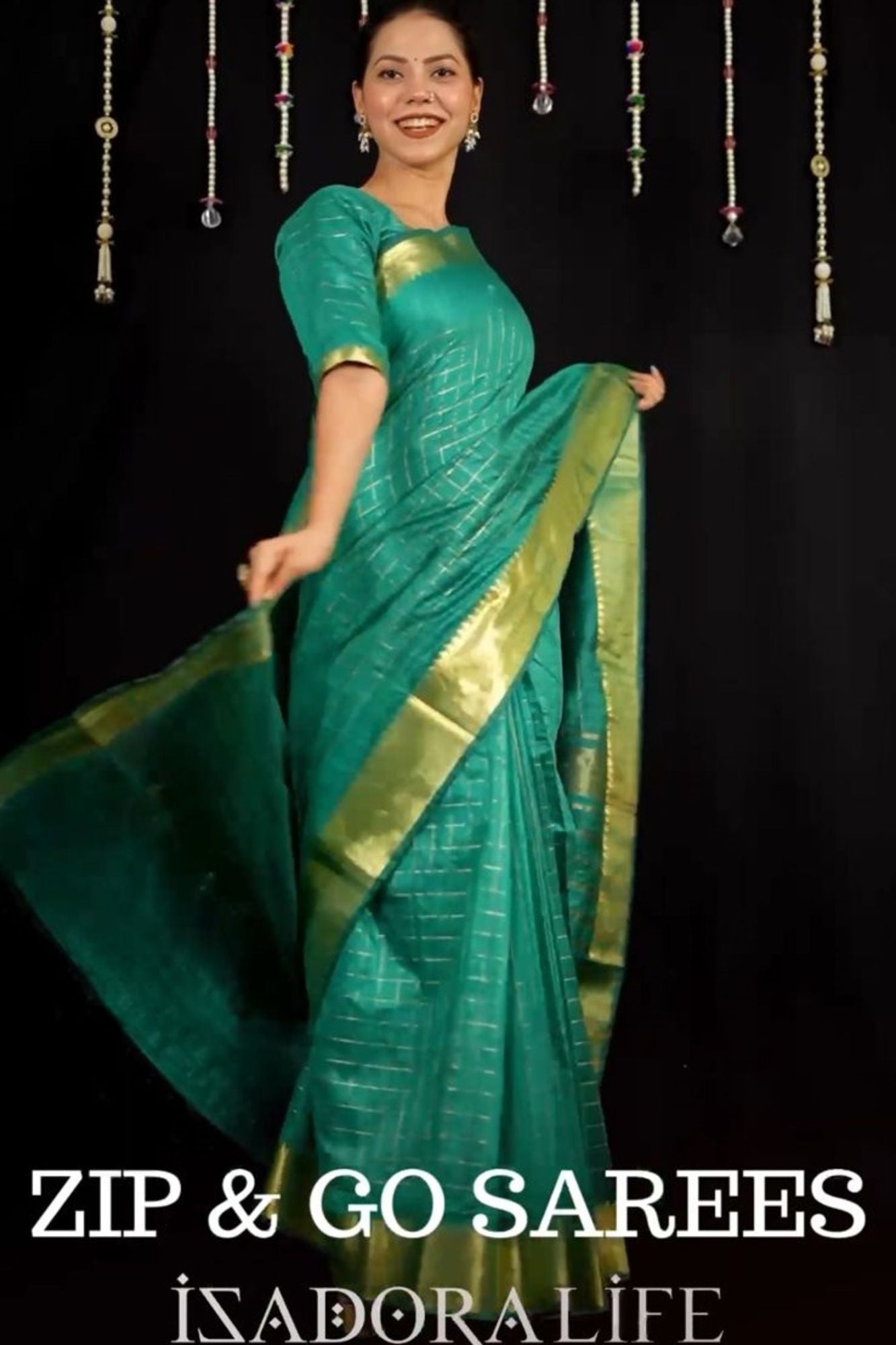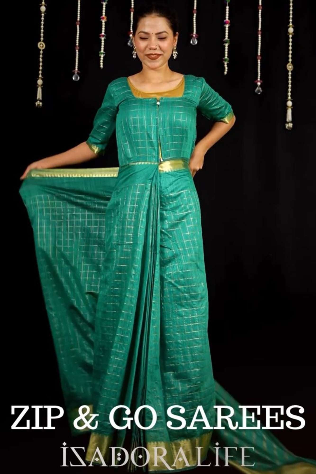 Zip & Go Saree: Cotton with Check Pattern and Golden Zari Border Zip and Go saree